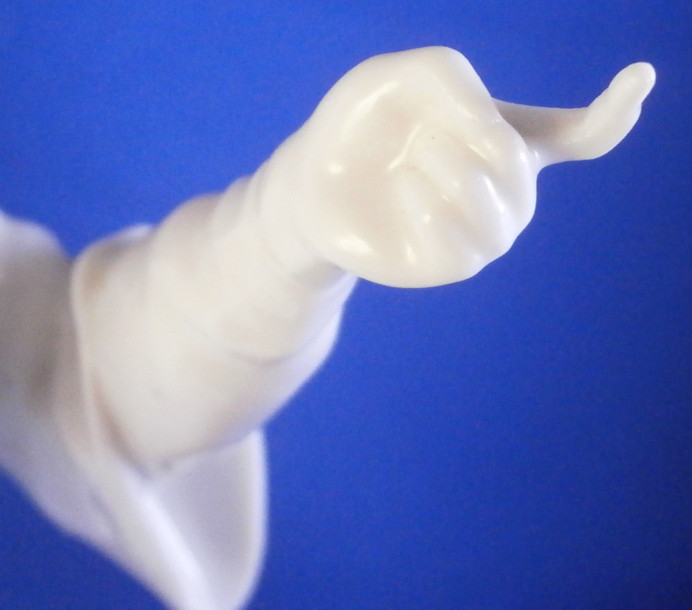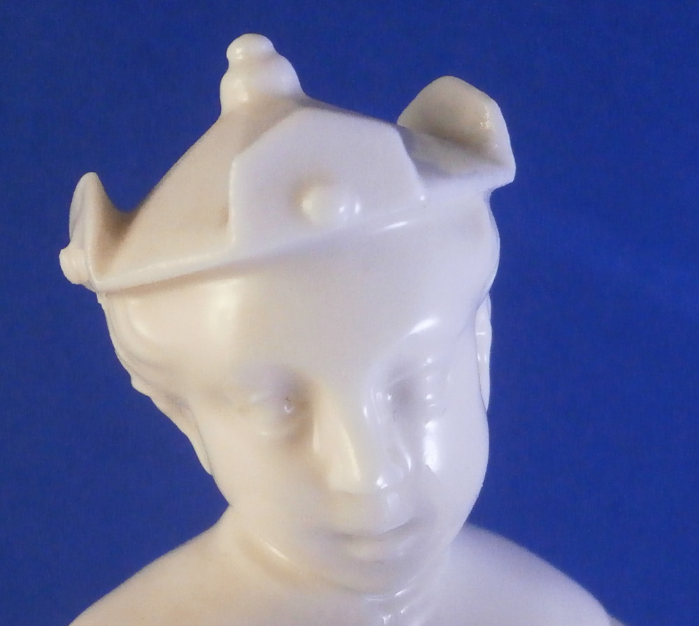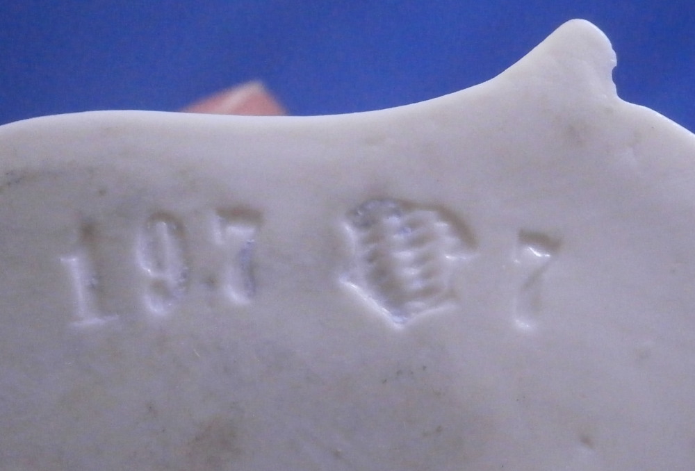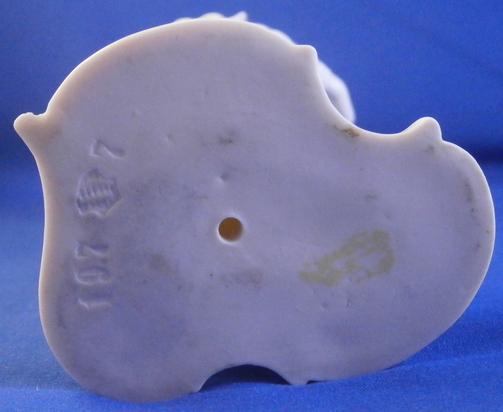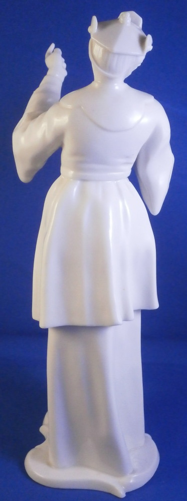 This is a figurine of a Chinese lady made by Nymphenburg in the 20th century. The figure comes from a series of 17 or 18 figurines I think - this being one of the harder to find pieces and number 13 of the series for me. Originally it was off course modelled by Bustelli in the 18th century. This is the blanc de chine version but this also comes in a painted version though one rarely ever sees those. I own a few figures from this seriesand they are probably my favorite figures besides the commedia dell'Arte, off course. The figurine is of a noble lady or priestess (not sure) dressed in a flowing robe with a fancy hat on her head and a bird sitting on her right hand. The left hand with a finger stretched out as if to lure another bird on that hand. Some nice modeled details to the figurine and the typical base. The figure is 7.25 inches tall, 2.375 inches wide and 3.75 inches deep. She is in great condition with a piece of the strap missing that is holding her hat in place (it is in the back and invisible when on display plus the ends of the belt around her waste are slightly chipped as shown. Not obvious at all when on display. The figurine is marked with the impressed shield mark on top of the base as well as underneath plus the impressed numbers 197 and 7 as shown. Please email me for more information or other pictures.