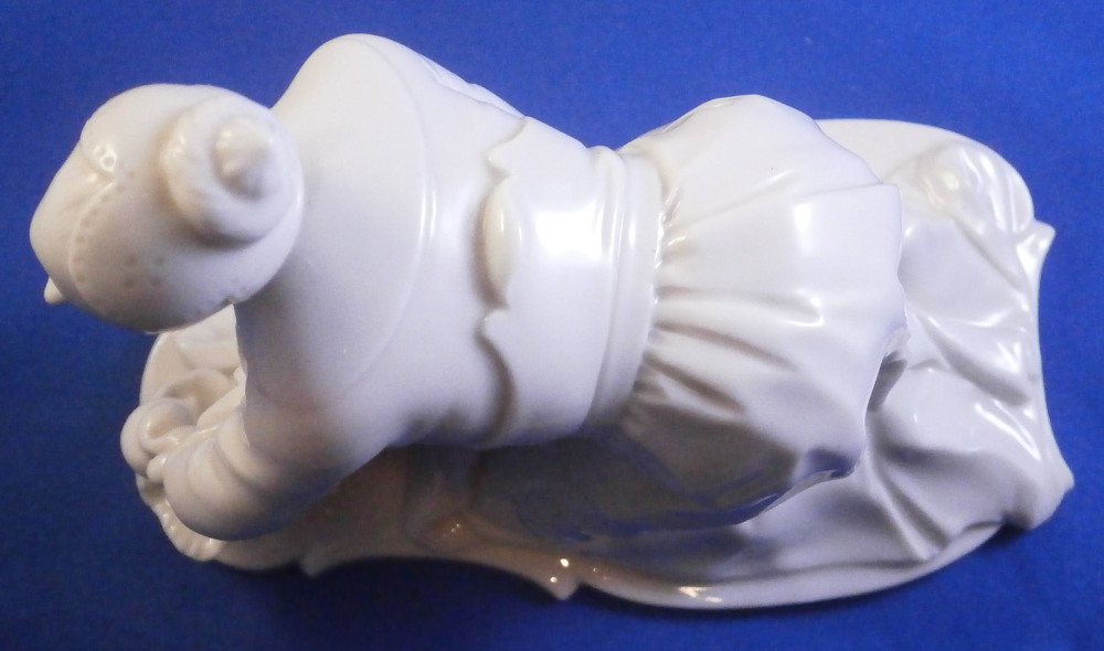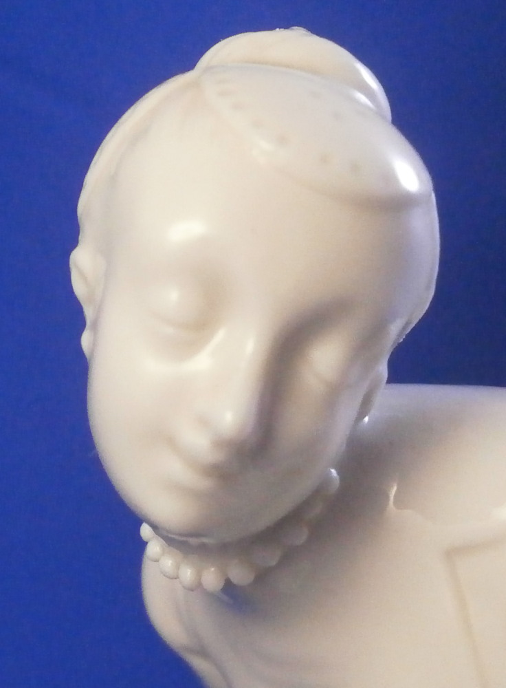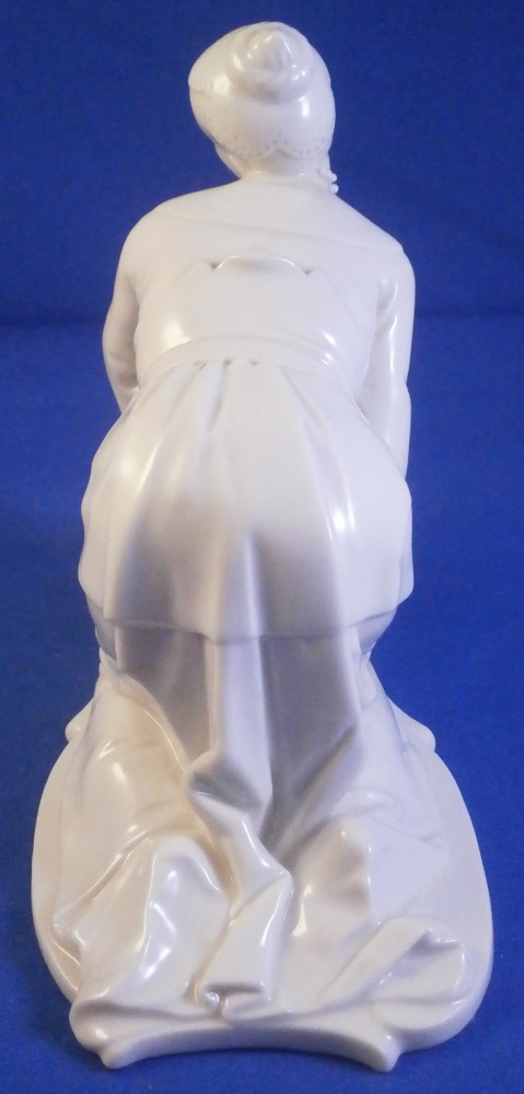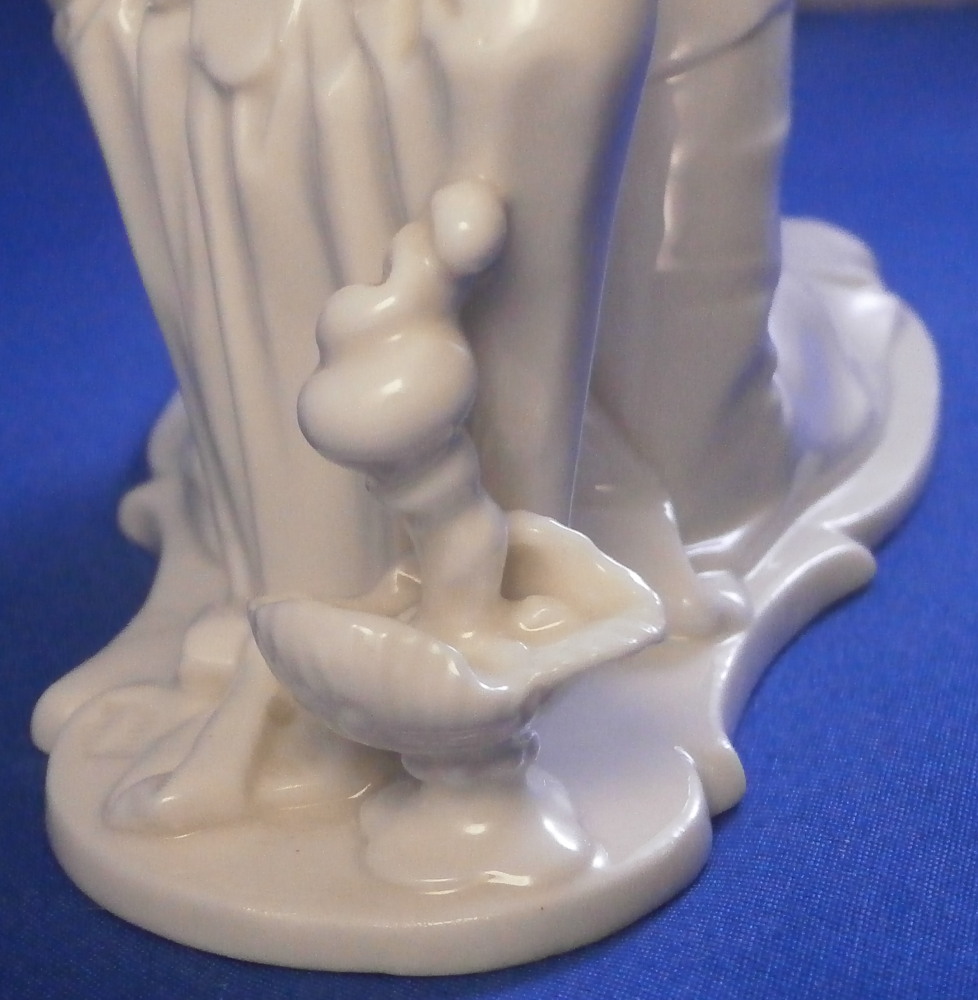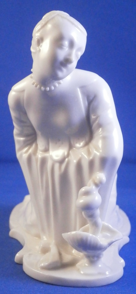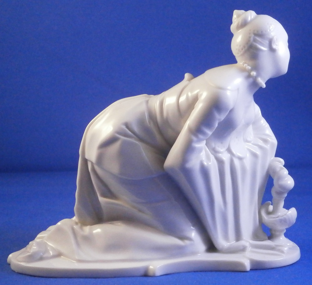 This is an amazing figurine of a priestess made by Nymphenburg in the beginning of the 20th century. I have owned the colored version once before but it is a rare model to find for sure. This figure here is the blanc de Chine version left in the white to show off all that amazing modeling that Bustelli did on his figures in the 18th century . He was amazing! The lady is kneeling down in front of an offering container with smoke coming off it. She is wearing a flowing robe that hides most of her body and hands with a nice bow tied to the front. She has an interesting head covering as wel. All on a typical base for these early figures. A truly superb piece! His modeling details are by far the best in the porcelain world which explains why Bustelli is still consdered the greatest modeler of all time. She is 4 inches tall, 2.5 inches wide and 4.75 inches long. The figurine is in perfect condition and is marked with the impressed shield mark on top of the base and underneath as well as the impressed numbers 182 (I think) over 3 as shown. Please email me for more information or other pictures.
