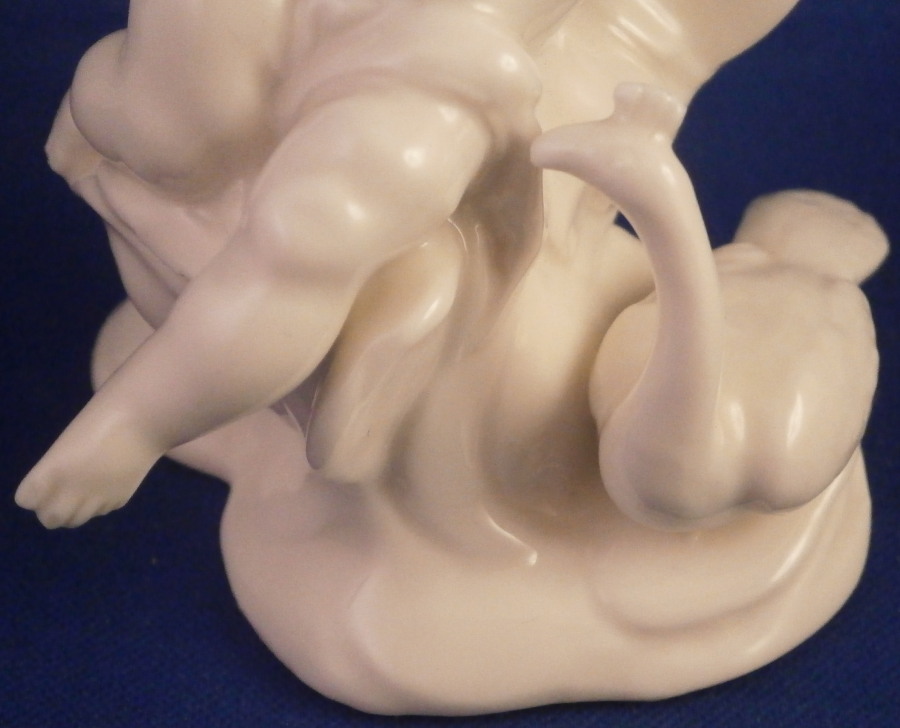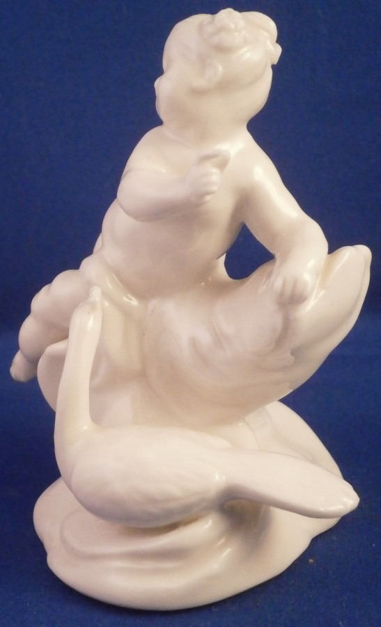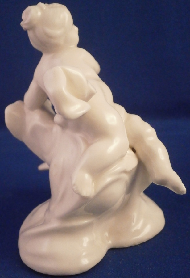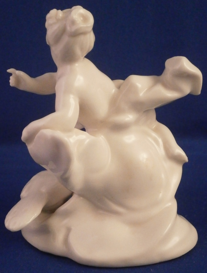 This is a figurine of the goddess juno with her peacock by her side made by Nymphenburg in the late 19th or very early 20th century. Nicely modeled with the putto sitting on a cloud with a cloth wrapped around her middle and flowing out the side. Amazing how Bustelli caught the movement so well in his figures! Left in the white to show off all that nice modelling detail! The figure is 3.5 inches tall, 3 inches wide and 2.75 inches deep. Smaller than most one finds but this looks to be a very early piece when they first redid the original 18th century figurines. They took the molds off the old pieces and when the porcelain shrunk in the firing process they turned out smaller. They completly redid all the figures then to make them their original size. The later pieces would have a closed base and impressed numbers under them which this piece is lacking. The figure is marked with the impressed shield mark on the underside as well as an incised number 96 possibly but its hard to make out! A nice early piece for these reworked pieces! The figurine is in perfect condition. I also have the matching Zeus figurine up for sale! Please email me for more information or other pictures.