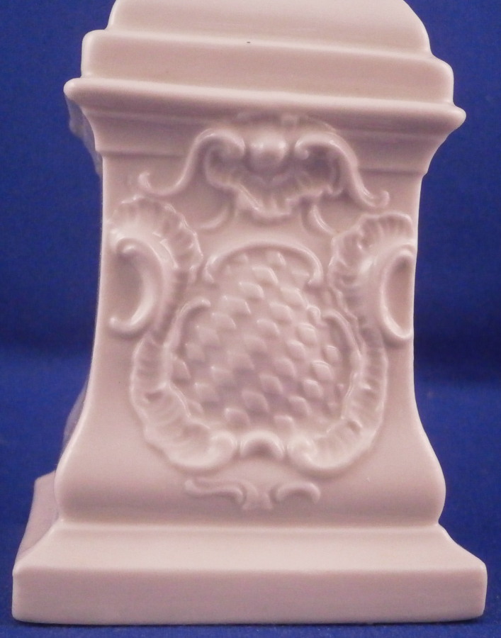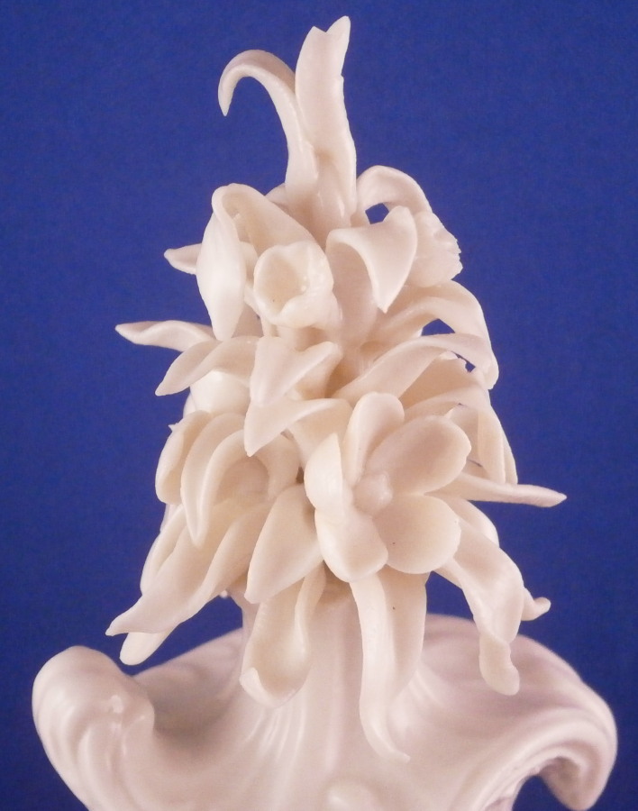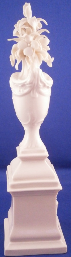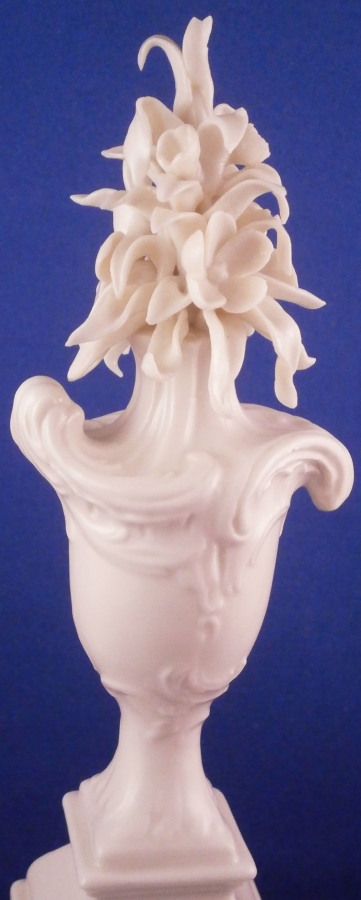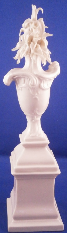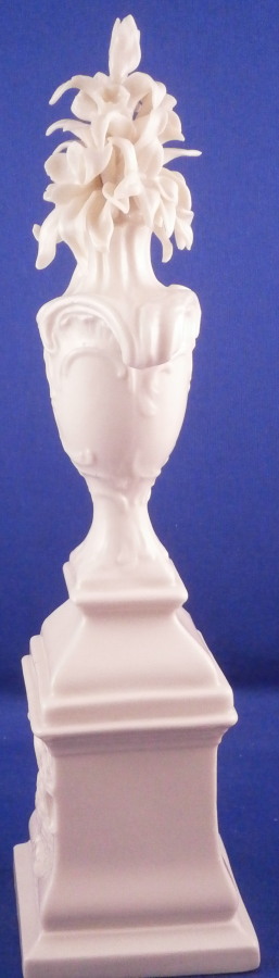 This is a fun vase / urn on a pedestal base with greenery in the top made by Nymphenburg in the 20th century. I own the original 18th century piece but off course the greenery is all but gone in that one so it is nice to see what it would ahve looked like originally :) The piece is modeled with lots of relief detail and the greenery is amazing. Lots of leaves and even a few flowers. The front of the base has the typical Bavarian shield type design to it in relief. Left in the white to show off all that superb detail! Quite elegant when on display. The piece is in superb condition with just a chip to the leaf on the very top. That is to be expected with this fragile a piece! The piece is marked with the impressed shield mark underneath as well as the numbers 234 (I think) and 14 plus the usual green shield mark with Nymphenburg under it. The entire piece is 8.375 inches tall and the bottom of the base is 2.125 inches on all sides. Please email me for more information or other pictures.
