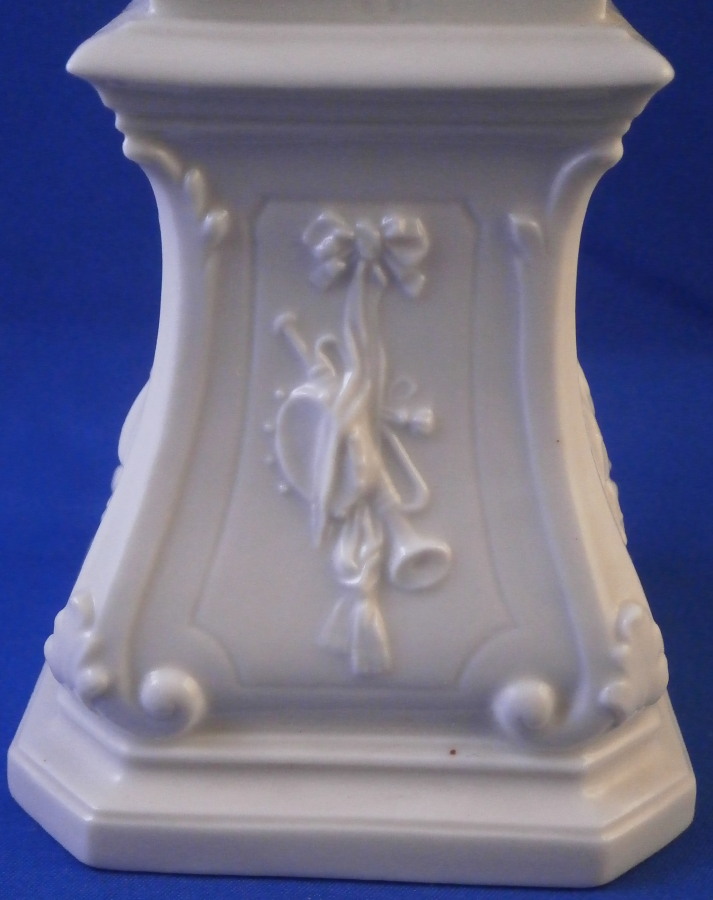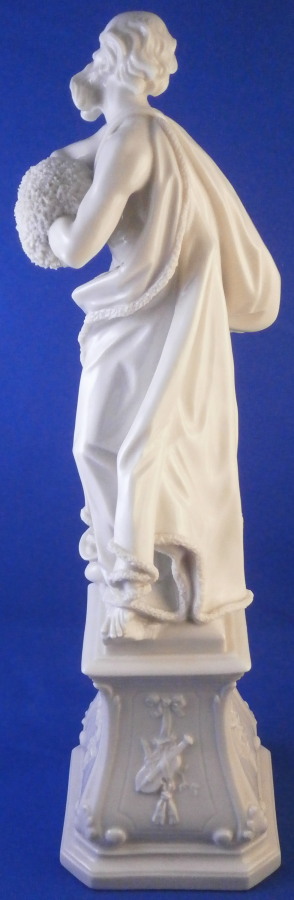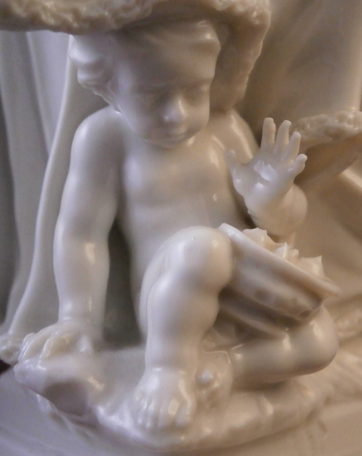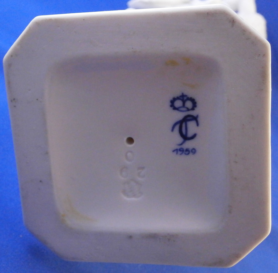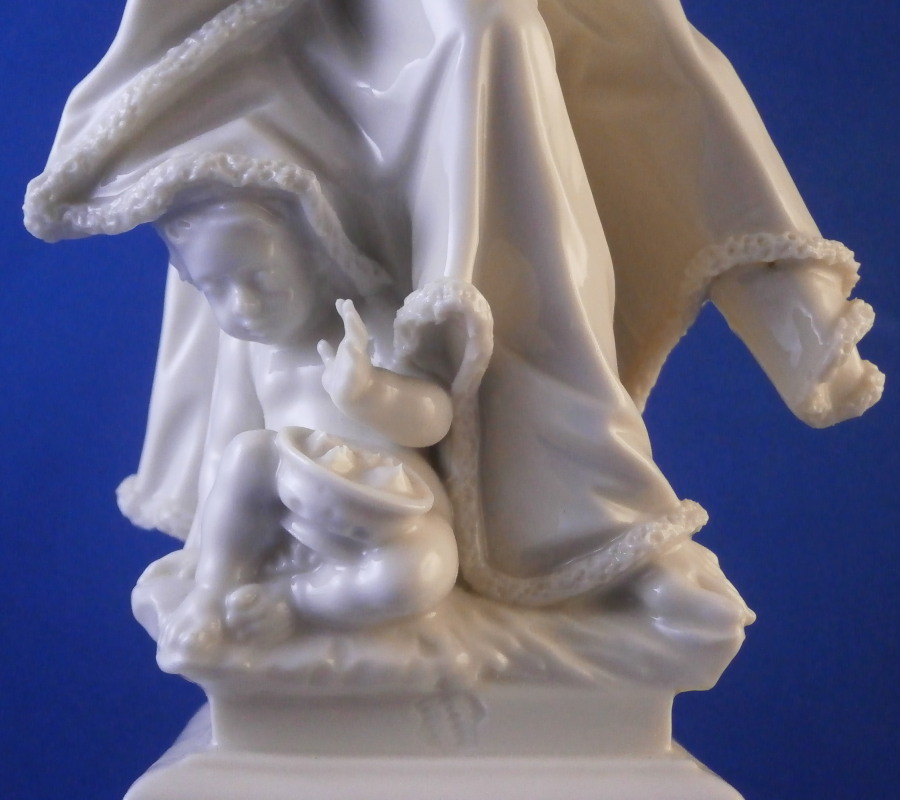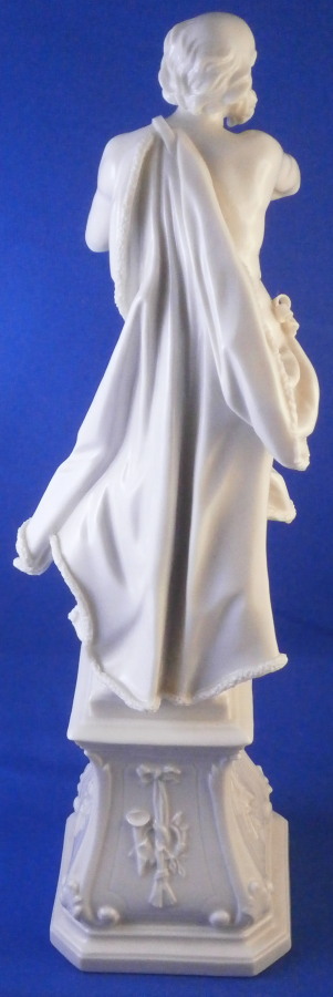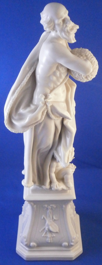 This is a really nice figurine made by Nymphenburg in the mid 20th century. It comes from a series of the four seasons but this is the nicest version of them I think. It is of Father Winter or Old Man Winter representing Winter (obviously) . He has his hands warming in a muff while wearing a cloak with fur along the edges which is hiding a little putto warming himself over a little coal fire. The figure stands on a large pedestal that has musical instruments in relief on all four sides. It is a superbly modelled figurine and looks stunning! This is the blanc de chine version but I assume this also comes in a painted version though I have never seen it. I own Spring as well which I listed on the site already. The figurine is 11 inches tall and the base is 3 inches on all sides. It is in superb condition with a tiny brown firing spot to the bottom of the base and one loop on the bow of his cloak is partially missing though that is not obviou at all! He displays perfectly! The piece is marked with the impressed shield mark to the front of the base right by his feet and underneath as well as the impressed numbers 29 over 0 and the CT monogram under a crown with the year 1959 under it which shows it was made in 1959 and from an old Frankenthal model. Please email me for more information or other pictures.