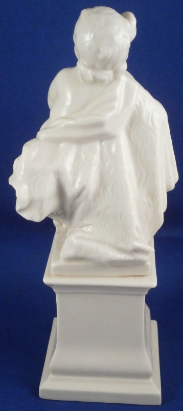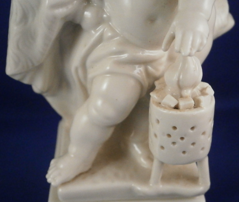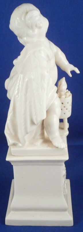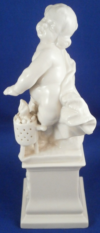 This is a very elegant figurine of one of the four seasons made by Nymphenburg in the early 20th century. It is a figure emblematic of Winter and he is in perfect condition. This is the version that is standing on a tall pedestal which has a relief shield design to the front. The entire piece is nicely modeled with the coat looking like real fur with all the detail to it and left in the white to show it off nicely! The figure is warming its hands over a fire in front of him. The figurine is marked underneath with the impressed shield mark as well as the usual impressed numbers, etc. as shown. The entire piece is 6.5 inches tall, 2.75 inches wide and 2.125 inches deep. Please email me for more information or other pictures.