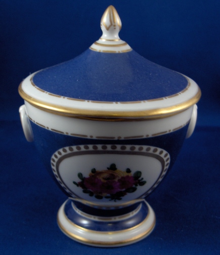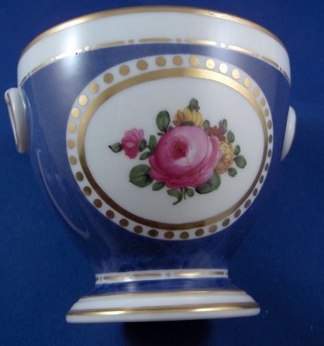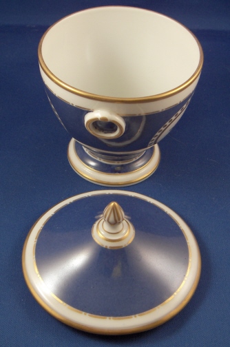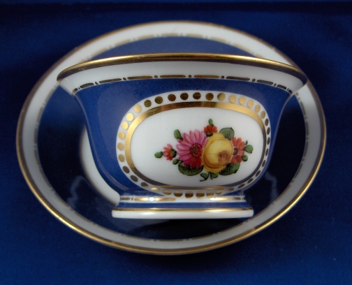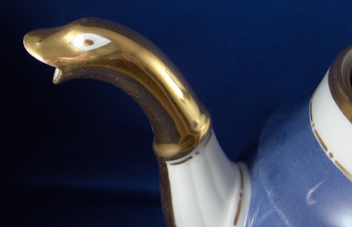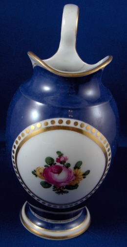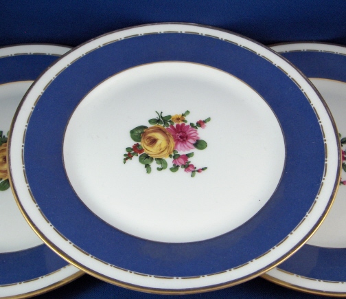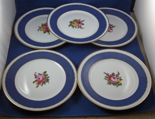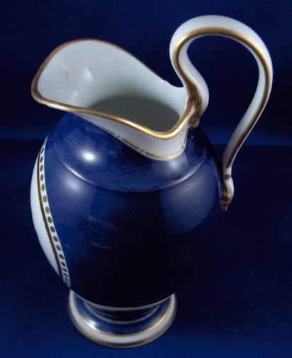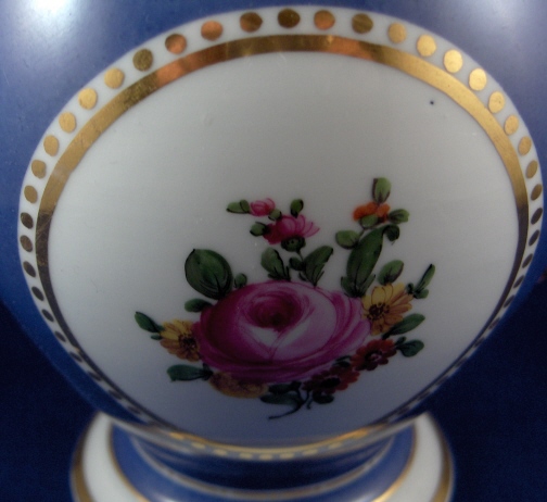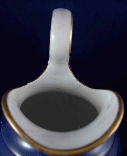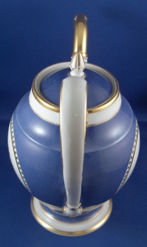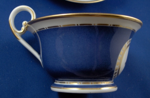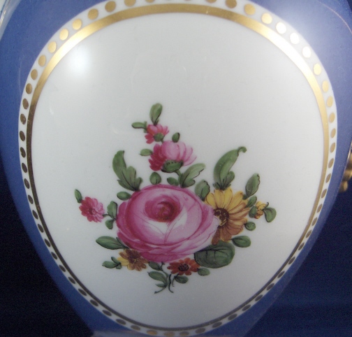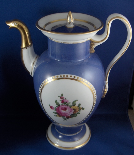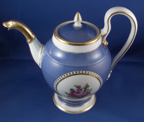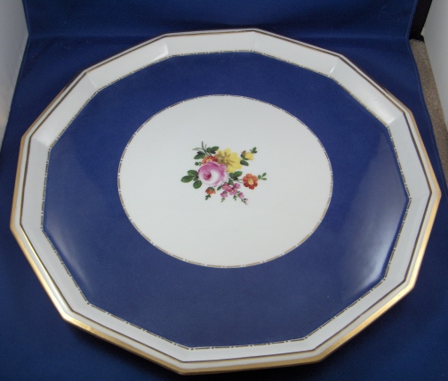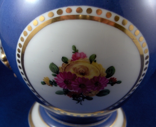 This is a super coffee and tea set made by Nymphenburg in the beginning of the 20th century. It is handpainted with flower arrangments in medallions surrounded with gilding in the form of a line and dots. The main body of each piece is handpainted with a blue ground color that is not too light and not too dark but just right. It is a superb set as you can see in the pictures. There are six cups and saucers, six cake plates, a coffee pot with lid, a tea pot with a lid, a creamer, a sugar bowl with a lid and what really makes the set - a 12 sided tray. The set is in superb condition with the handle of the creamer reglued. No other damage at all. All pieces are marked with either the impressed shield mark or the underglaze shield with the word Nymphenburg underneath as well as impressed numbers and overglaze red marks. The coffee pot is 9.5 inches tall, 7.75 inches wide and 4.75 inches deep including the handle and spout. The teapot is 7.75 inches tall, 8.25 inches wide and 4.75 inches deep. The dessert plates are 7.5 inches in diameter. The cups are 2.125 inches tall and just under 4 inches in diameter. The saucers are 1 inch tall and 5.75 inches in diameter. The creamer is 6.25 inches tall, 3.5 inches wide and 3.25 inches deep including the handle and the sugar is 4.75 inches tall and 3.75 inches in diameter. And the tray is 14 inches in diameter and 0.75 inches tall. Please email me for more information or other pictures.