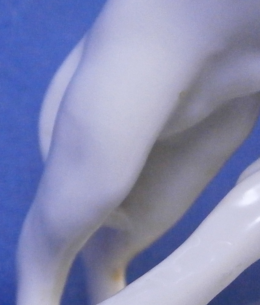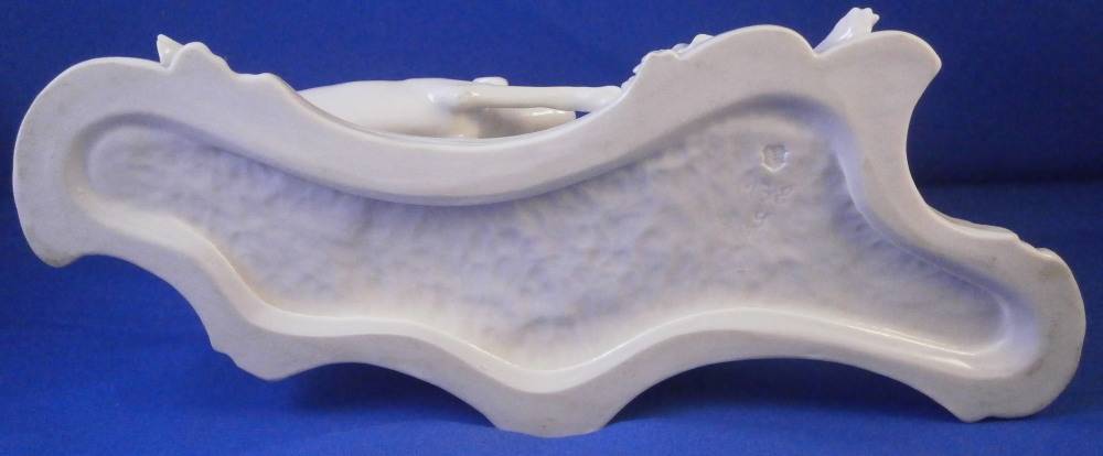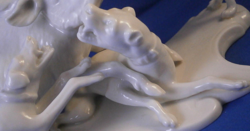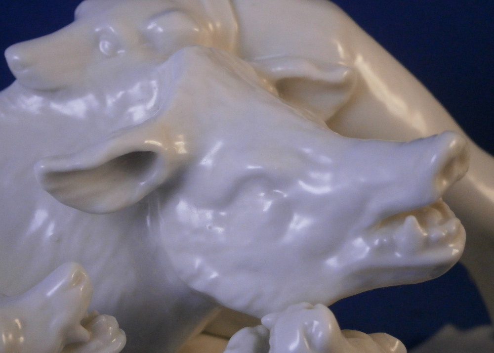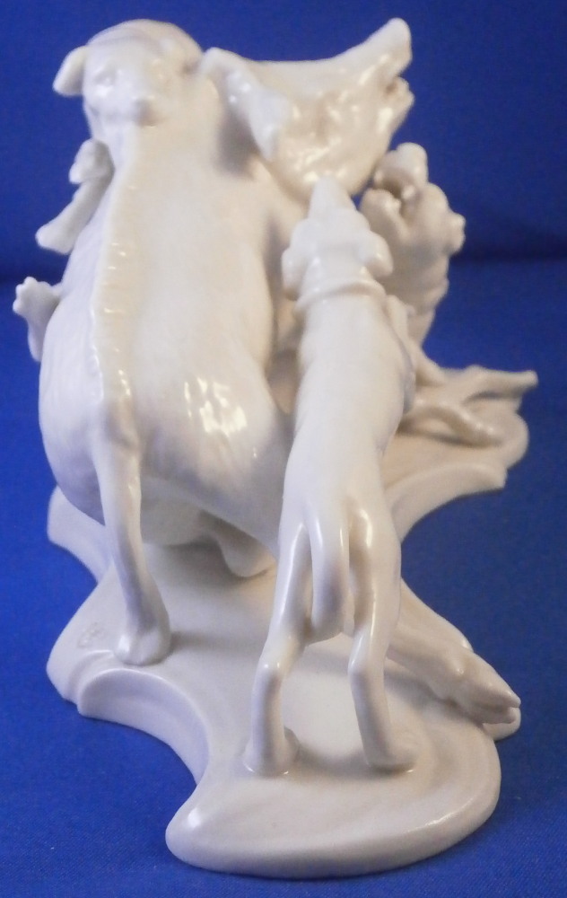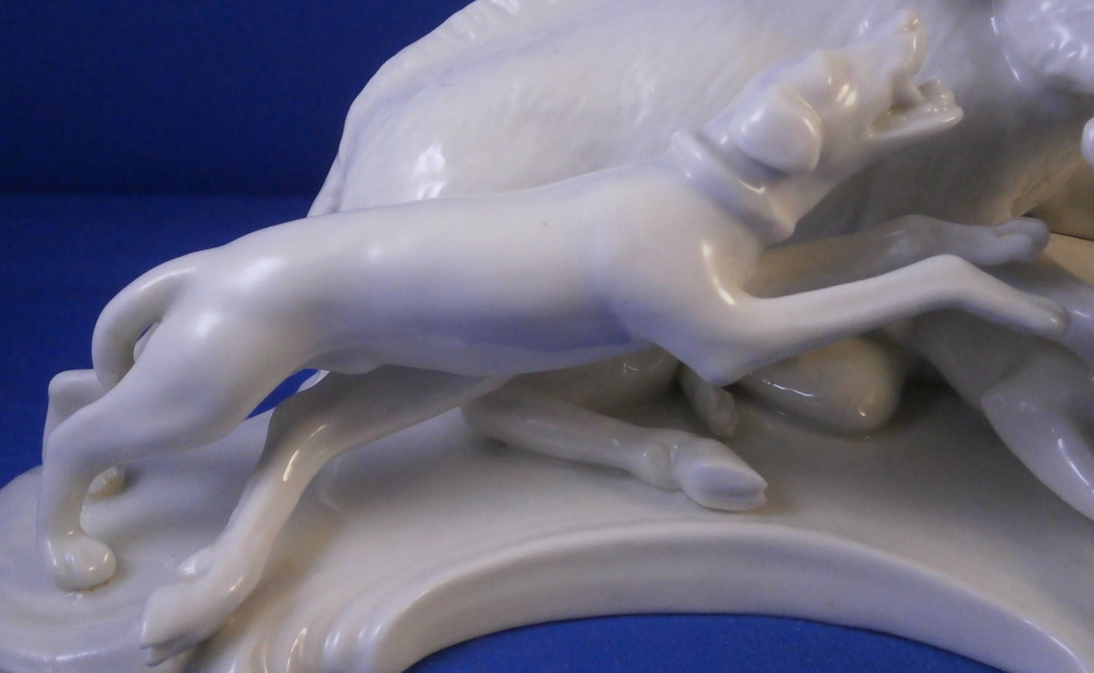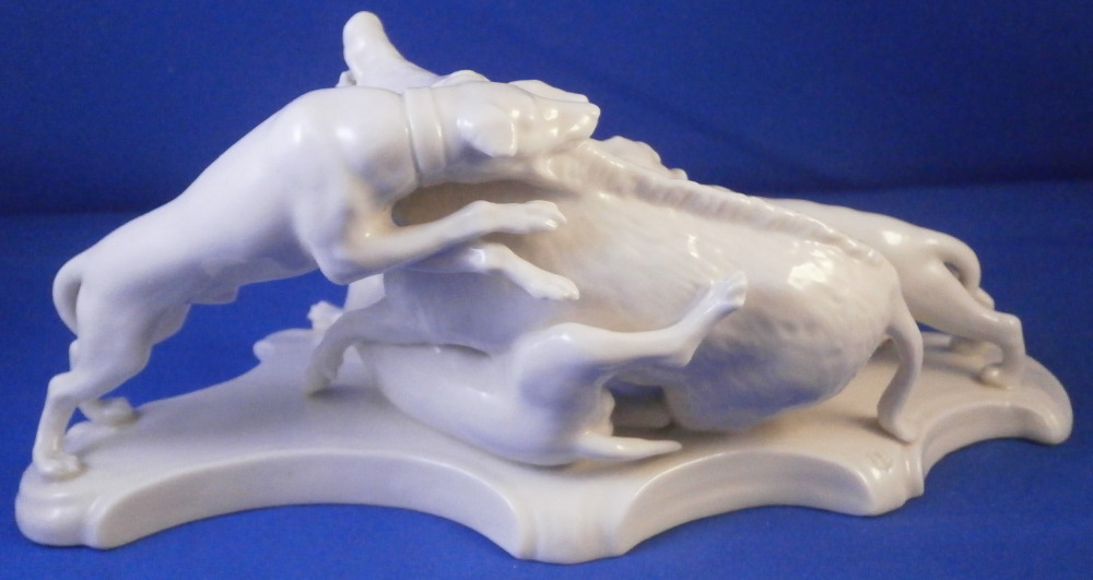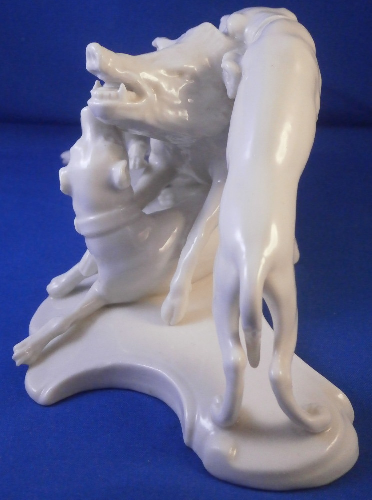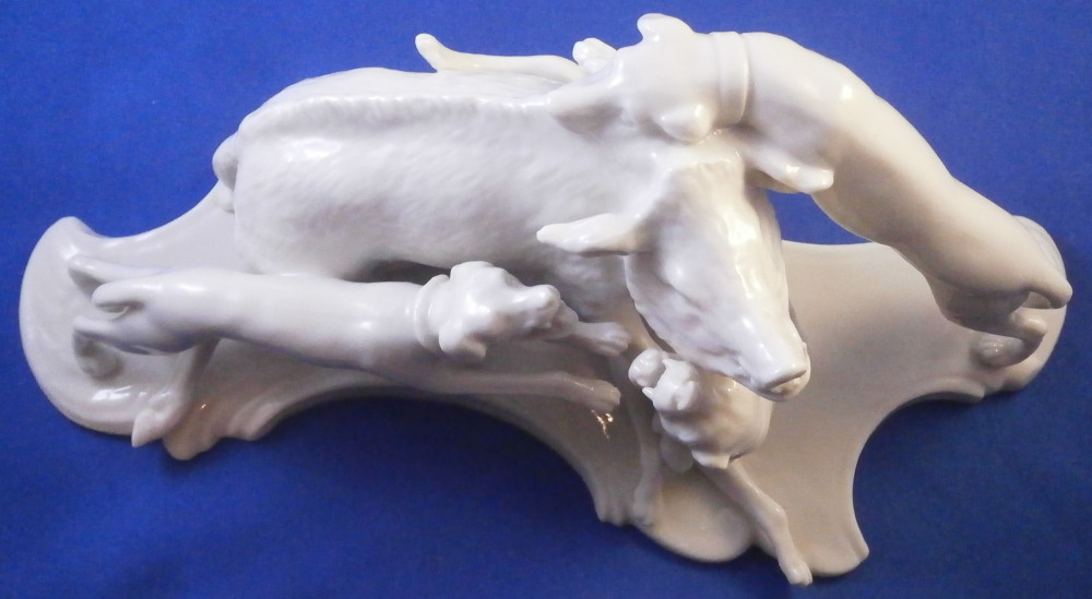 This is a rare figurine of a boar being taken down by three dogs made by Nymphenburg in the mid 20th century. Not a figure you see often at all and aprt of their hunting series of figurines. Here we have the wild boar / pig being attacked by three dogs. One dog has been run over by the boar while another is biting him in the top of the neck and the third dog is still chasing him on the side. All standing on a typical base with some scroll work in relief. A very nice piece with lots of detail to it and left in the white to show it all off. A really well modeled piece! The figurine is in great condition with the end of the tail of the chasing dog missing but because of the placement it is very hard to spot and displays perfectly! The figure is 3.25 inches tall, 8.125 inches wide and 3.25 inches deep. It is marked with the impressed shield mark on top of the base by the boar's tail as well as underneath with the model number 138 over 9 incised. Please email me for more information or other pictures.