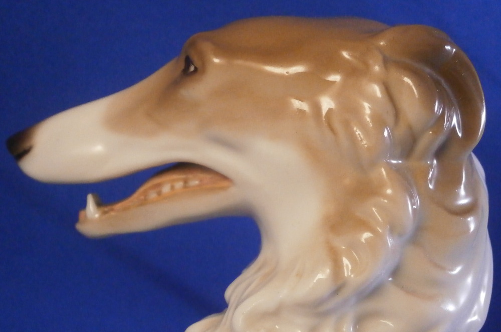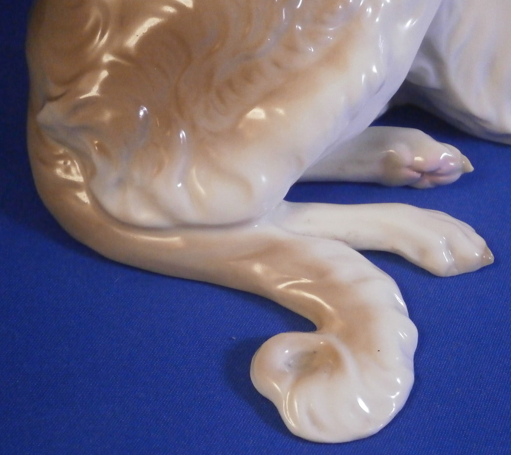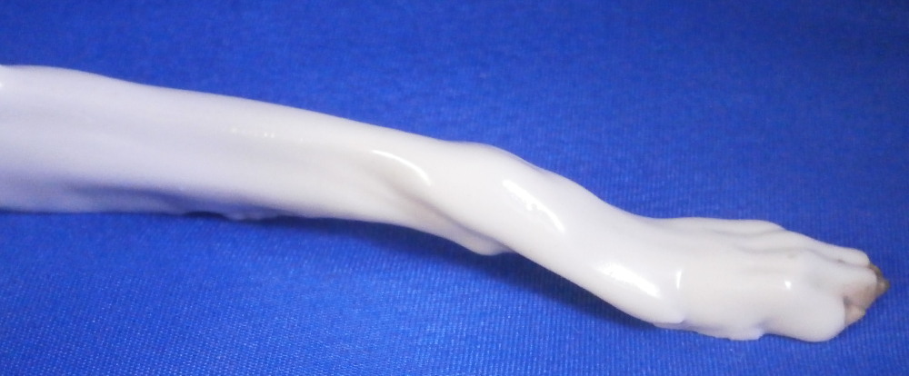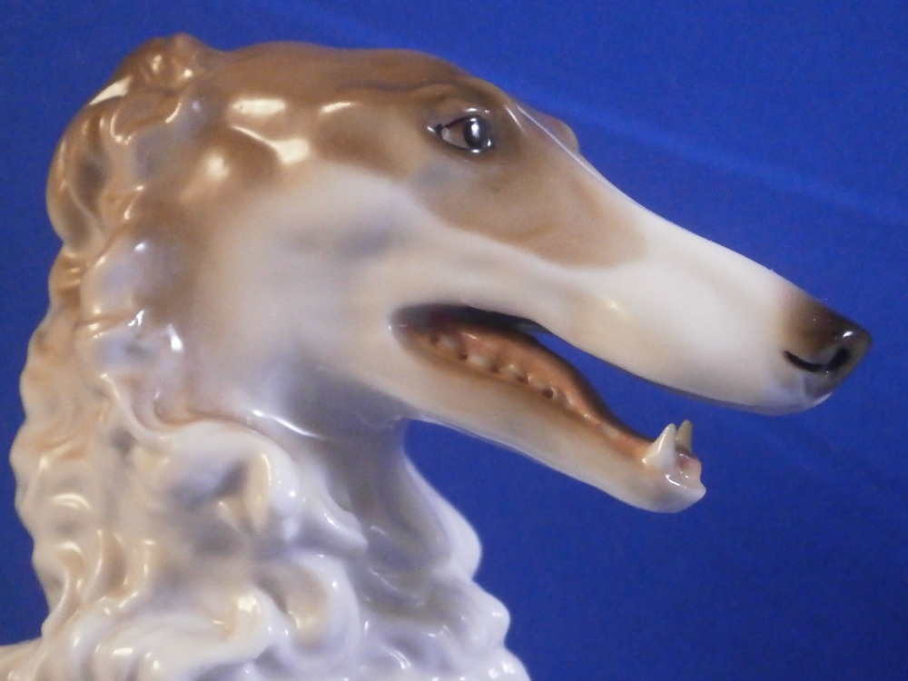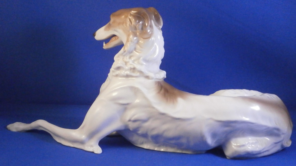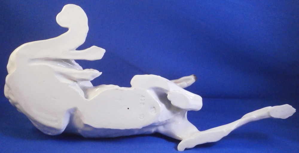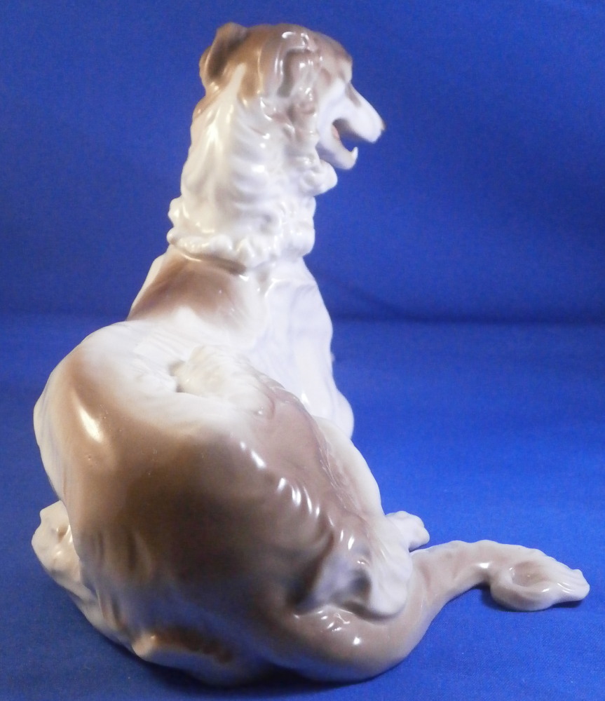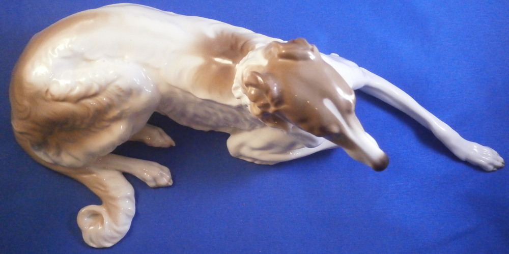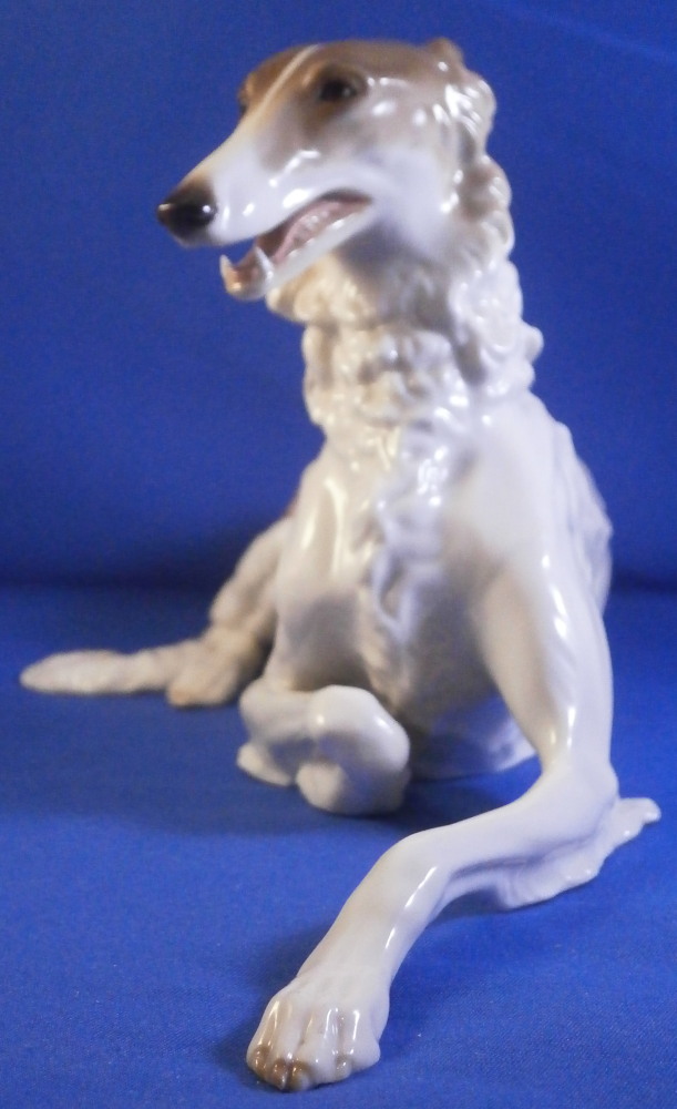 This is a really amazing figure of a Russian Wolfhound or Borzoi made by Nymphenburg in the mid 20th century. He was originally designed by the famous Theodor Kaerner in the early 20th century. His animal models are the best in the porcelain world. This piece has the perfect pose for this breed - lying down with on leg stretched straight out! The modeling is perfect and the hand painted details superb. It really does not come better for a figurine of this breed! The figure is 4.75 inches tall, 4.875 inches wide and 10.625 inches long. It is marked underneath with the impressed shield mark, impressed numbers 10 and 438. It is in perfect condition which is amazing considering the one outstretched leg in front. It's a stunning looking figurine! Please email me for more information or other pictures.