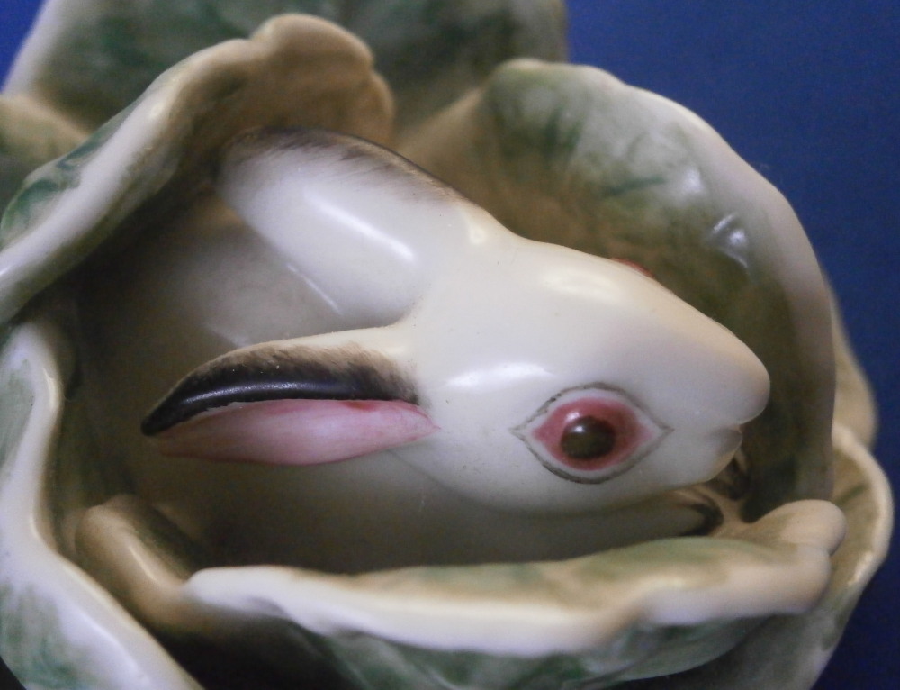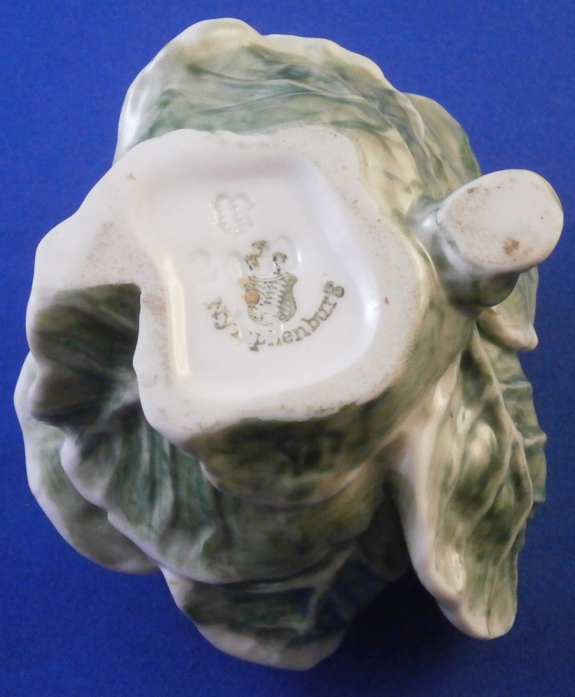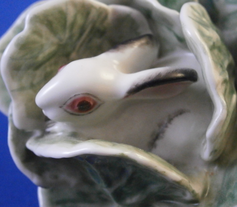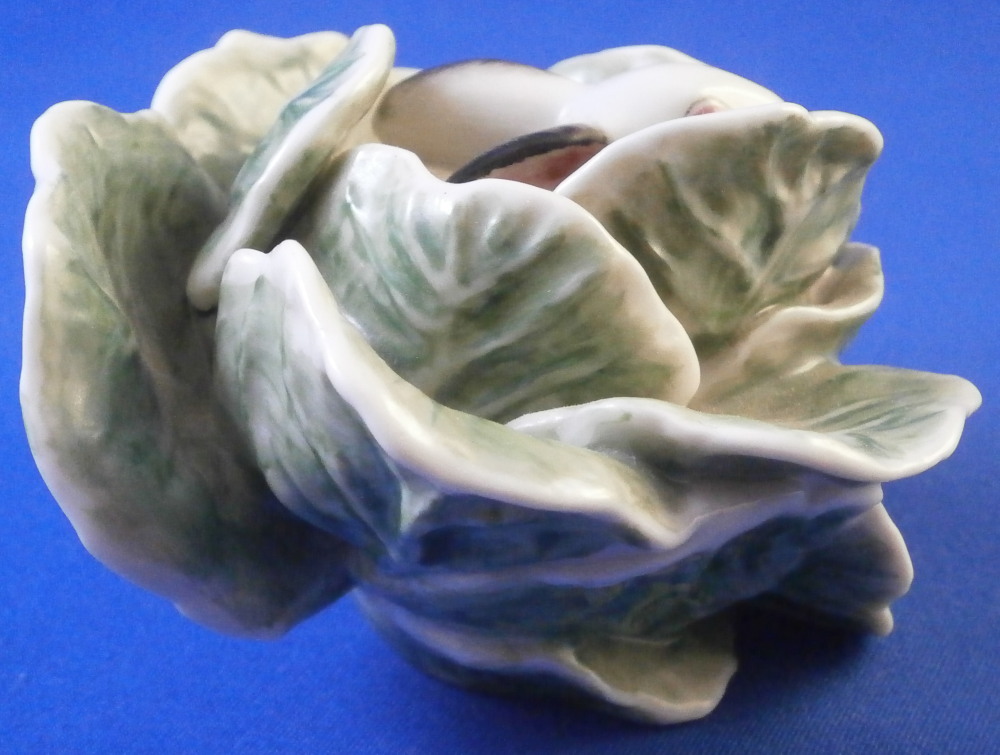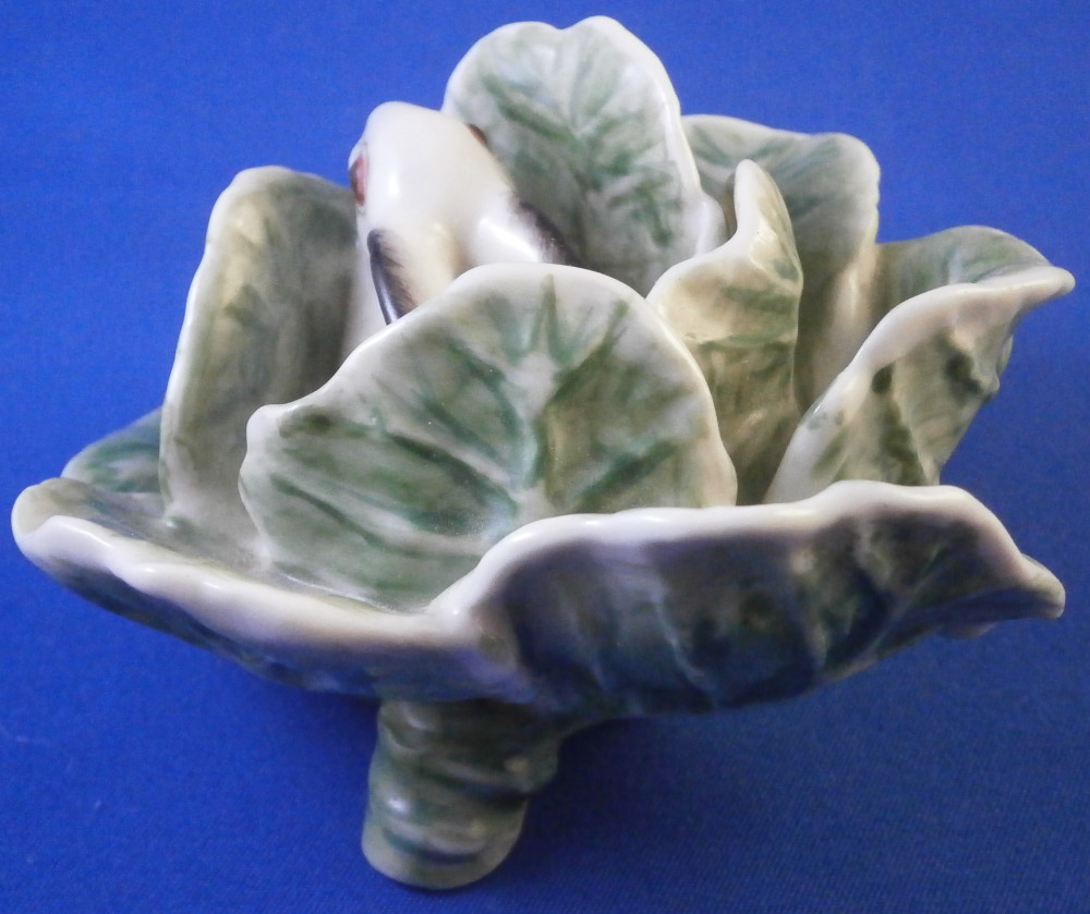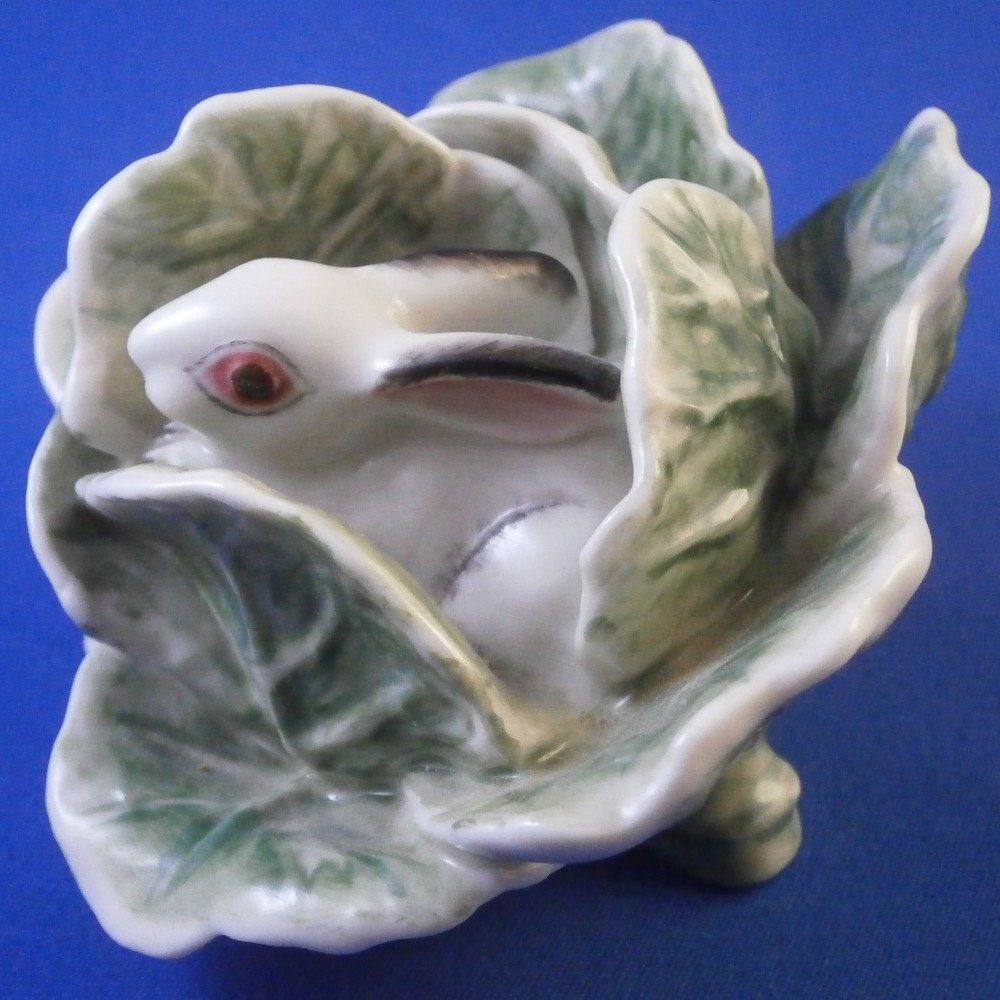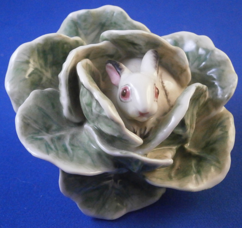 This is a fun figurine made by Nymphenburg in the 20th century. It is of a bunny hiding in the center of a lettuce or green cabbage . This has always been one of my favorite small pieces of porcelain! Super cute piece! It is very well modeled and hand painted with great colors and detail with the rabbit just peaking out of the center. The figure is marked underneath with the impressed shield mark, numbers 2030 over 13 (I think) as well as the green shield mark with Nymphenburg underneath. On the side of the base are the artist initials LTS for Luise Terletzki - Scherf who modeled this and many other amazing animal pieces for them. The piece is in perfect condition. The figurine is 1.875 inches tall, 3.125 inches wide and 2.75 inches deep. Please email me for more information or other pictures.