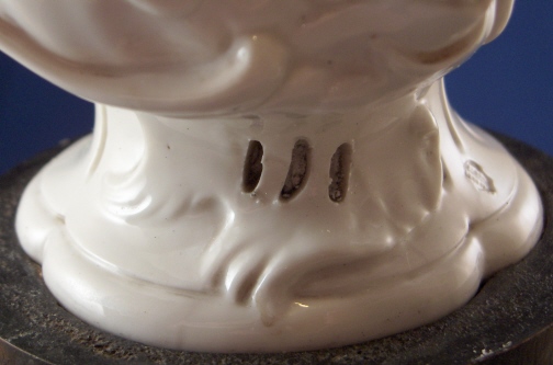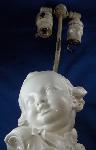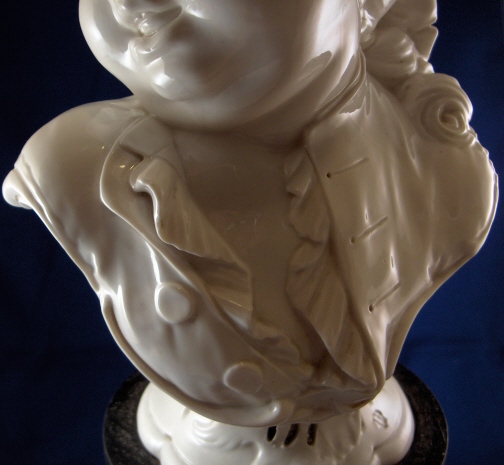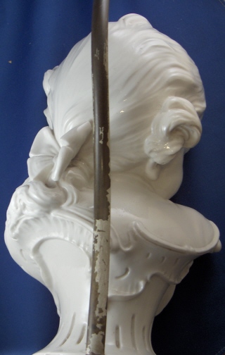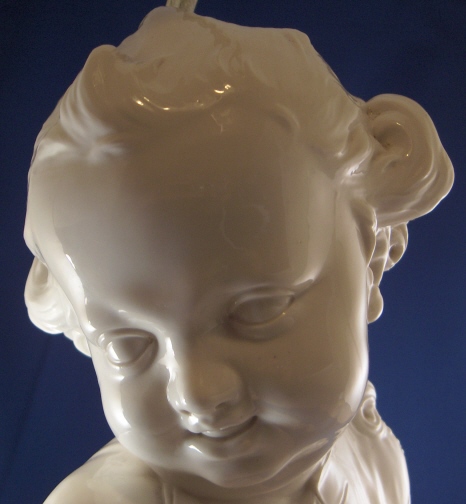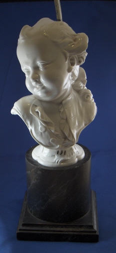 This is a bust of a child (believed to be Friedrich August der Starke aka Frederick the Strong) modelled by Franz Anton Bustelli and made by Nymphenburg in the early 20th century. It is marked on the side of the base with the impressed shield mark - fairly sure there is another mark underneath but I am not taking it off its lamp base. The porcelain part is 9.25 inches tall, 5.75 inches wide and 4.75 inches deep. The porcelain is in superb condition. The front of the base has three cut out holes. It is a nice touch! The black wooden marbilized base is 5.5 inches tall and 5.75 inches square. The metal piece of the lamp above his head is 8.25 inches tall. The cloth wiring has been cut so it needs to be rewired. There is a large piece of lead underneath as a weight so it does not tip over. Please email me for more information or other pictures.