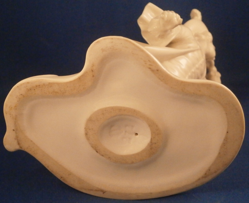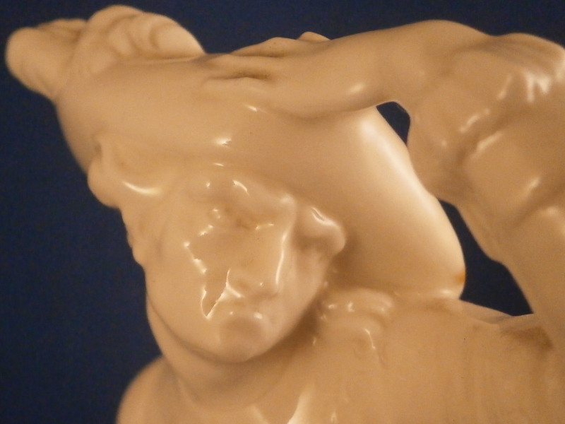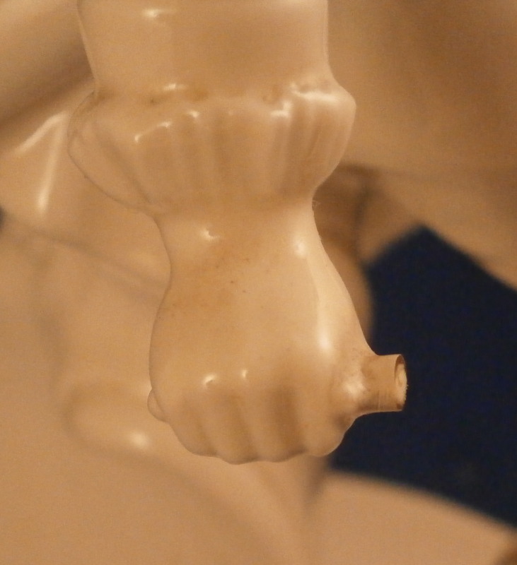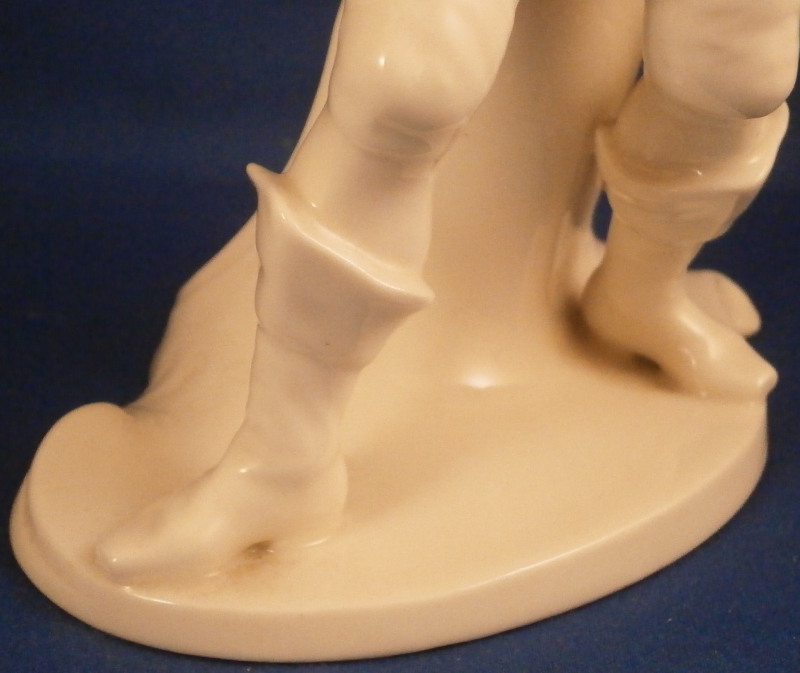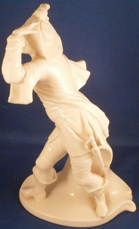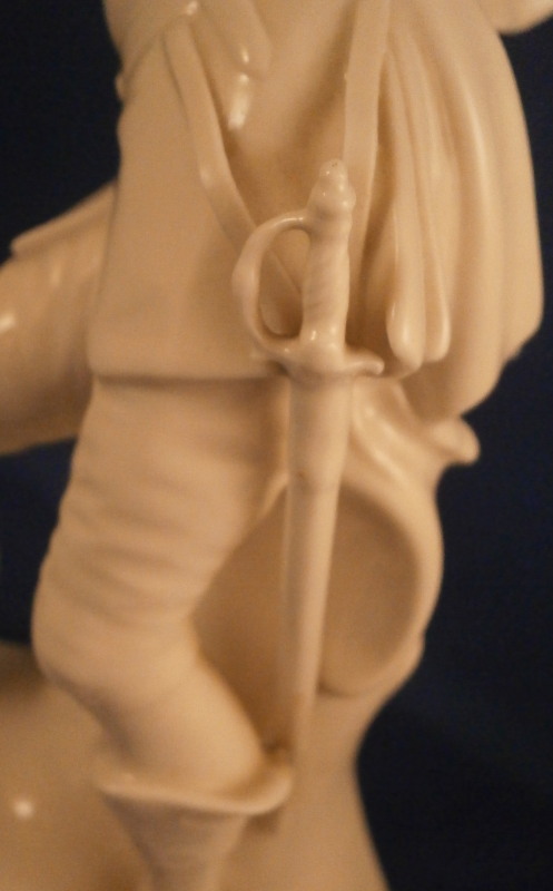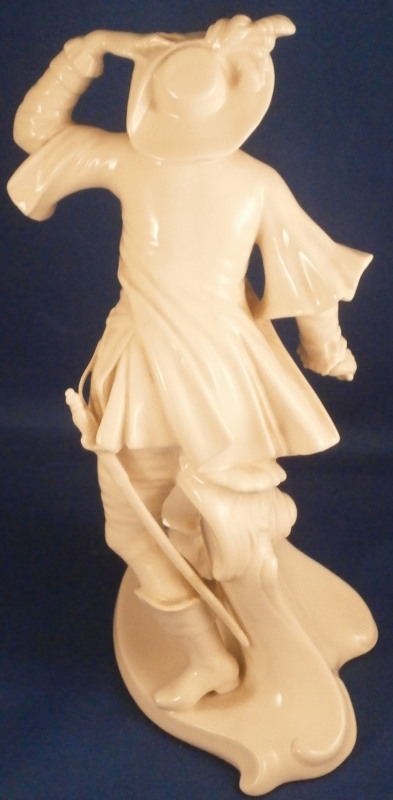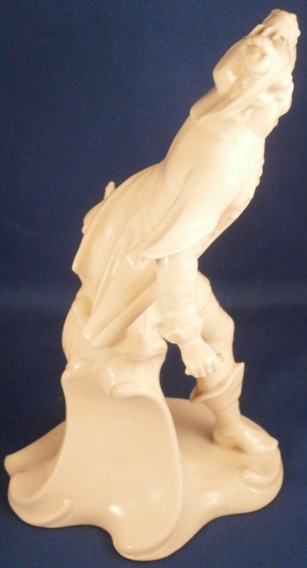 This is a figure of Capitano Spavento made by Nymphenburg in the early 20th century shortly after they were first remade after the original 18th century models. He is one of the commedia dell'arte figurines - one of the greatest set of figures ever designed by the famous Bustelli who made the best porcelain figurines ever! Superbly modeled with a nice pose and lots of detail left in the white (pure white not off white as the photos show - the camera is giving me a tough time again) to show it off perfectly! He is wearing a hat with a feather on it and long coat and vest and nice boots. A swords on his side and a dagger in his hand. The figure has the impressed shield mark on left side of the column he is leaning against as well as underneath and the impressed number 272 over 0. He is in great condition witht the dagger in his right hand being broken off. A common issue and not distracting but still it is not perfect. The figurine is 7.375 inches tall, 3.5 inches wide and 4.5 inches deep. Please email me for more information or other pictures.