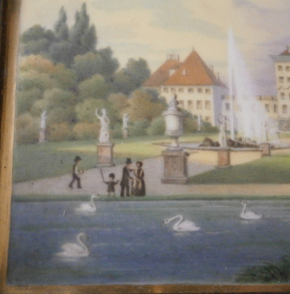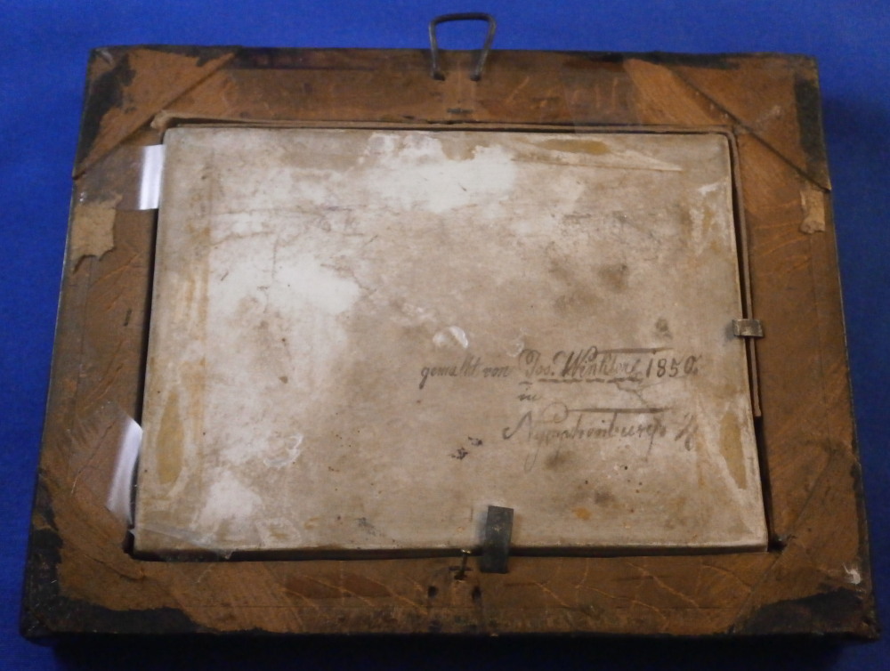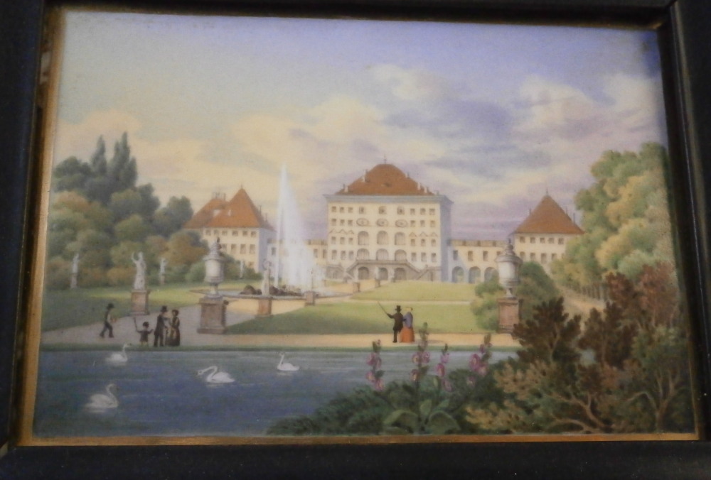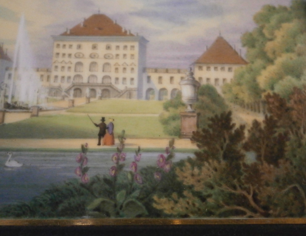 This is a plaque made by Nymphenburg around 1850. They plaques are very rare and this one here has the perfect scene to it for this maker! It is hand painted with a scene of the Nymphenburg palace / astle with the famous swans in the front and people walking around the parks. Lots of greenery to the sides and clouds in the sky. It is very well painted with lots of nice details! The plaque has a gold rim around the edge and a period frame which is original to the piece. The plaque is in perfect condition with some wear to the gilding along the edge. The frame is not perfect anymore but looks nice and I think it's a good thing to have its original frame though one could easily add a new one to it as well. The back of the piece is marked with the impressed shield mark from the time around 1850, and incised 3, as well as the words gemahlt von Jos. Winthlerb (or something along those lines) 1850 in Nymphenburg. (painted by Jos. Winthlerb in Nymphenburg) but the name is hard to make out so it might be something a bit different. Upon asking the Nymphenburg expert he says it might be by Winkler who painted at the factory from 1845 until 1851 but since no known signed pieces exist it is hard to know for sure. The plaque is 3.875 inches wide and 3 inches tall without the frame. The frame is 0.625 inches wide. A truly superb piece! And I ahve a matching second piece if anyone would be interested in a superb rare pair of plaques by them. Please e-mail me for more information or photos.