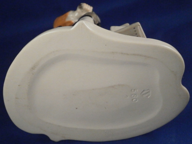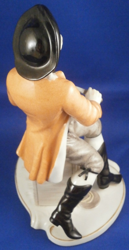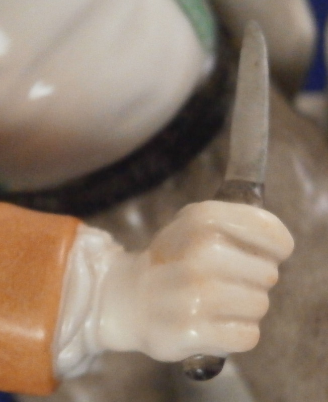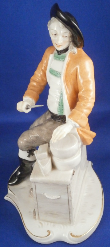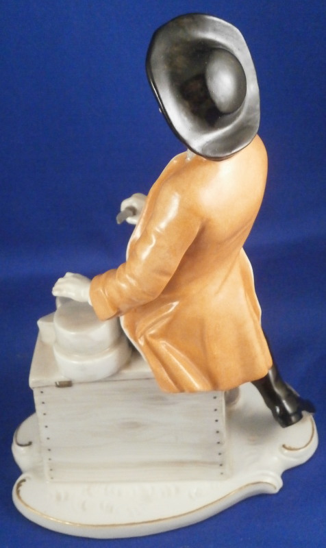 This is a figure of a street vendor from a Cris de Paris type market verndor series made by Nymphenburg in the early 20th century. A superbly modeled figure originally designed by the famous Bustelli who is pretty much the top guy when it comes to porcelain figurines especially from the rococo period. The gentleman is wearing a pair of lederhosen with long black boots, an orange coat and a black hat while sitting on a chest filled with cheese with two cheese wheels on top as well as two pieces next to those. He is holding a knife in one hand and has the scale to weight out his goodies by his feet. Typical base for Nymphenburg pieces with a bit of gold trim all around. A superb piece that is in perfect condition! The figure is 6.75 inches tall, 4.625 inches wide and 3.625 inches deep. Marked with the impressed shield mark to the top of the base as well as underneath and the impressed numbers 580 over 3. Not a piece one sees often at all so it was a must have for me. Please email me for more information or other pictures.