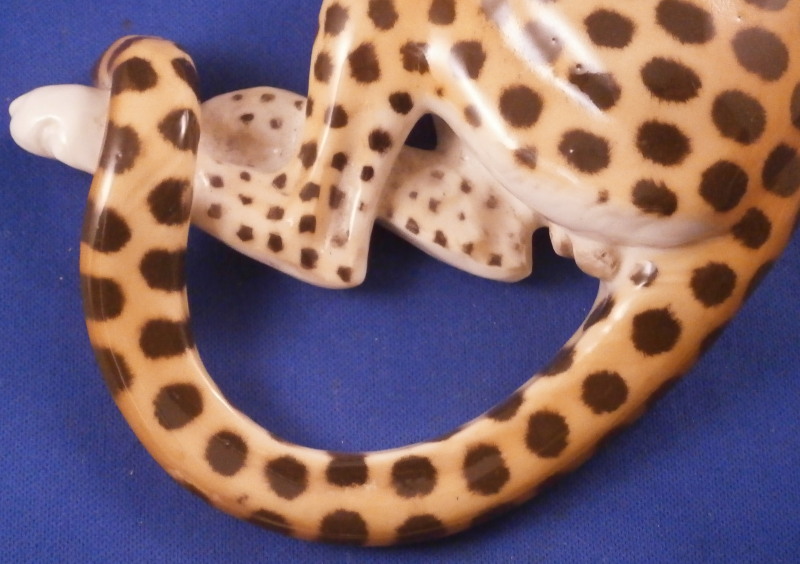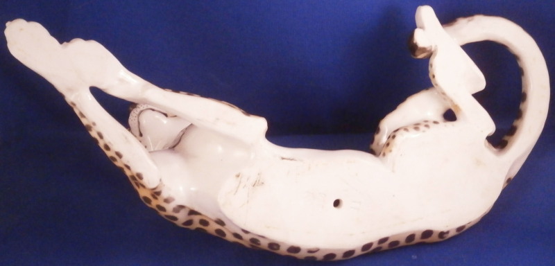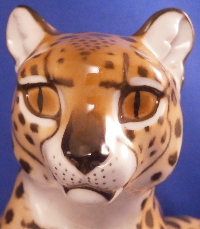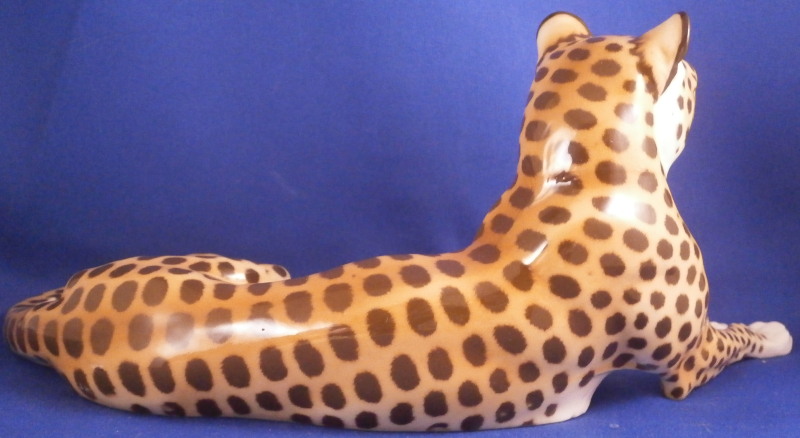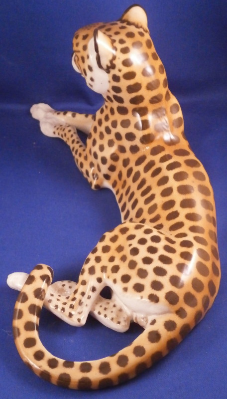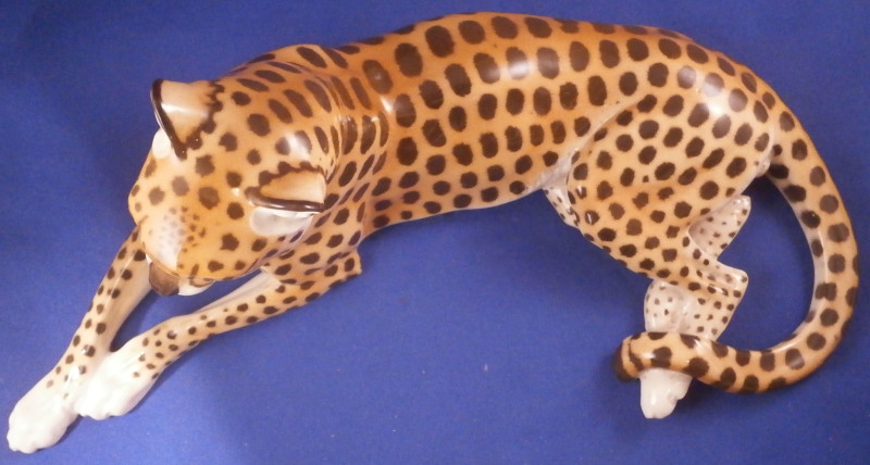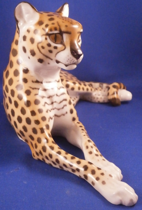 This is a superb figurine of a cheetah made by Nymphenburg in the early to mid 20th century. It was first designed by Kaerner around 1911 and is one superbly modeled and painted animal figurine! One of my new favorites and much less common to find than the leopard! The big cat is 4.75 inches tall, 11.25 inches long and 5.5 inches deep so rather large. He ( and he is a He!) is marked with the impressed shield mark underneath with the model number 326 over 11 as shown. There is also an artist mark J.H. on the back edge. The earlier pieces have this and are generally of better quality than the newer ones! He is in perfect condition same as the day he left the factory :) Please email me for more information or other pictures.