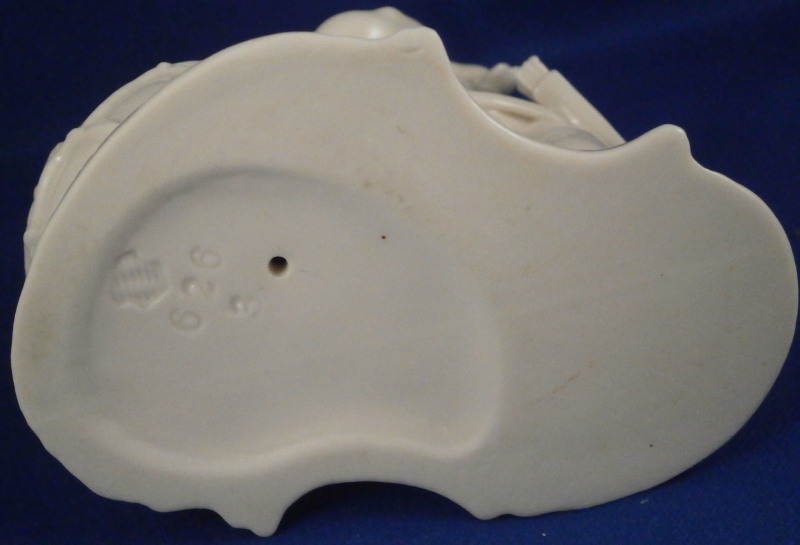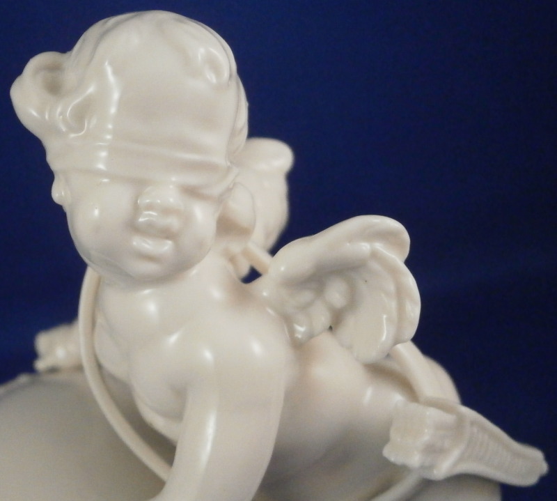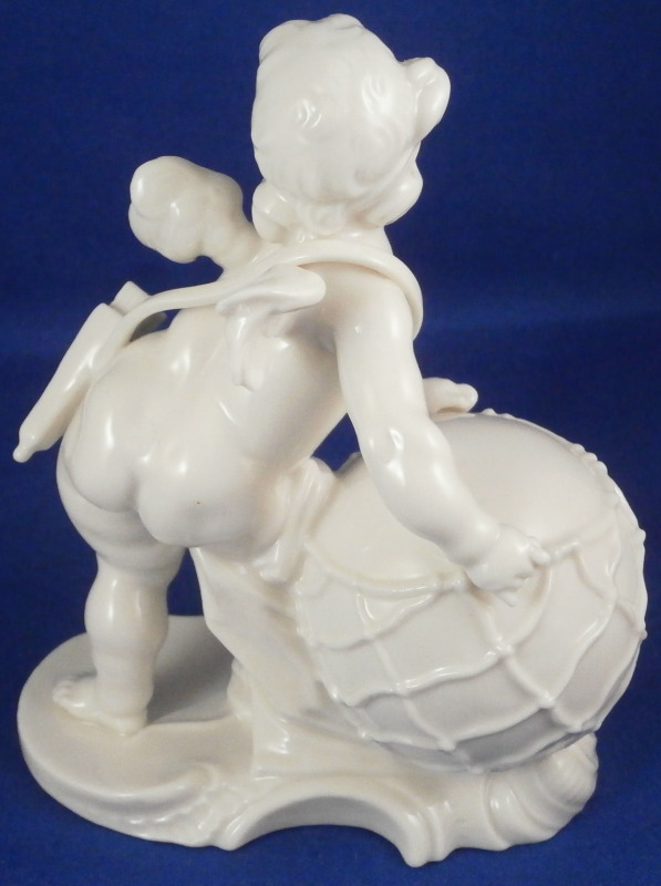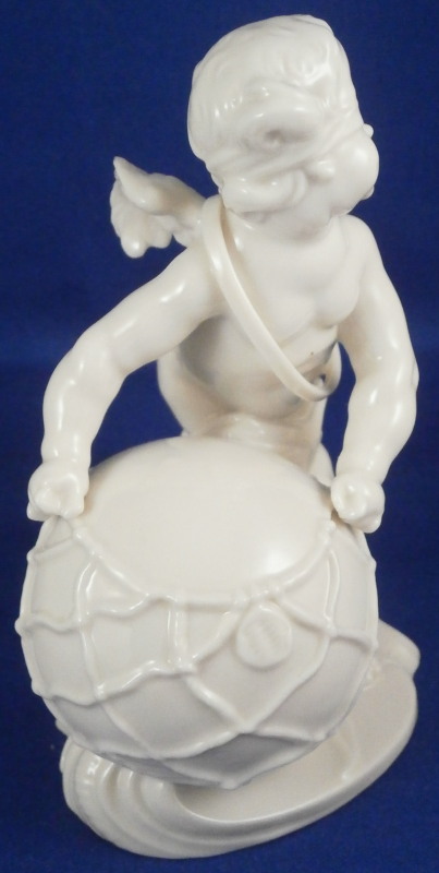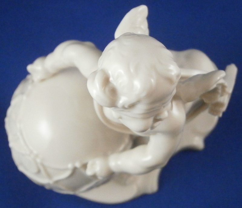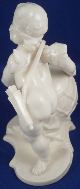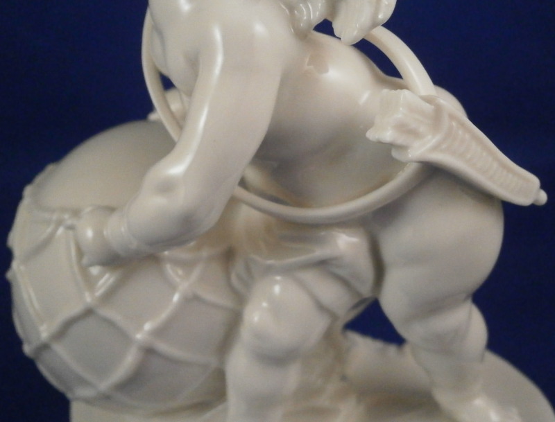 This is a cherub or cupid with a ball or globe in a net while being blindfolded made by Nymphenburg in the early 20th century. Not sure what this one is supposed to represent - maybe Atlas or something like that. Either way the piece is superbly modeled and left in the white to show of some of the amazing detail that Bustelli's Nymphenburg pieces have. The figure is marked underneath with the impressed shield mark as well as numbers 626 over 3 and another shield mark on the side of the net. The piece is in perfect condition with a tiny black firing spot from the making on the base edge and his chest. The piece is 4.25 inches tall, 3.625 inches wide and 2.25 inches deep. Not one of the common models! Please email me for more information or other pictures.