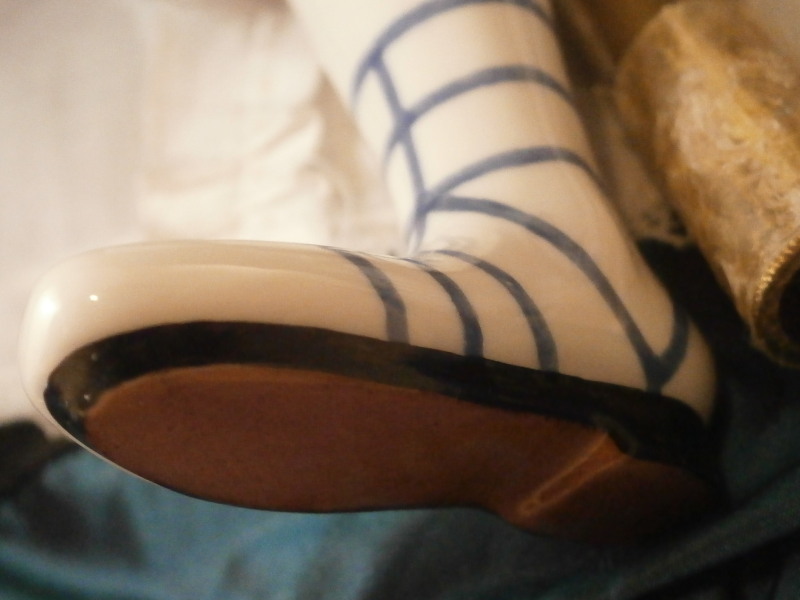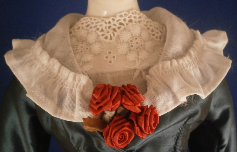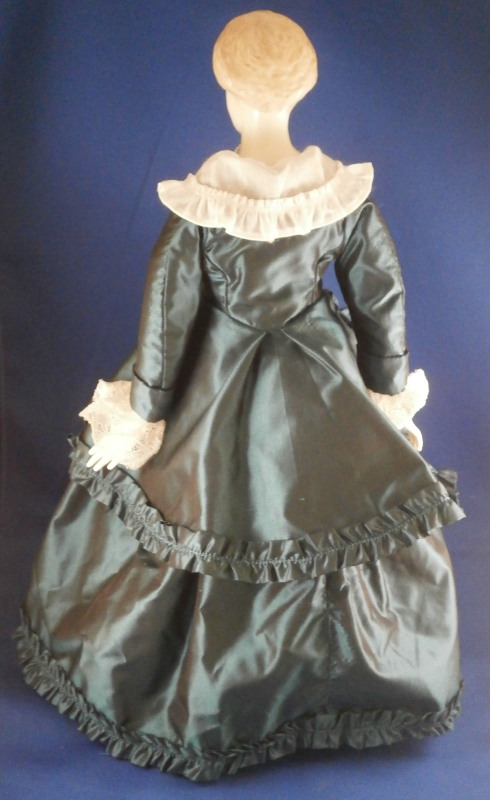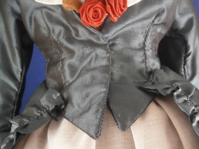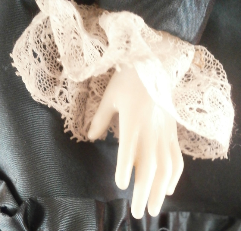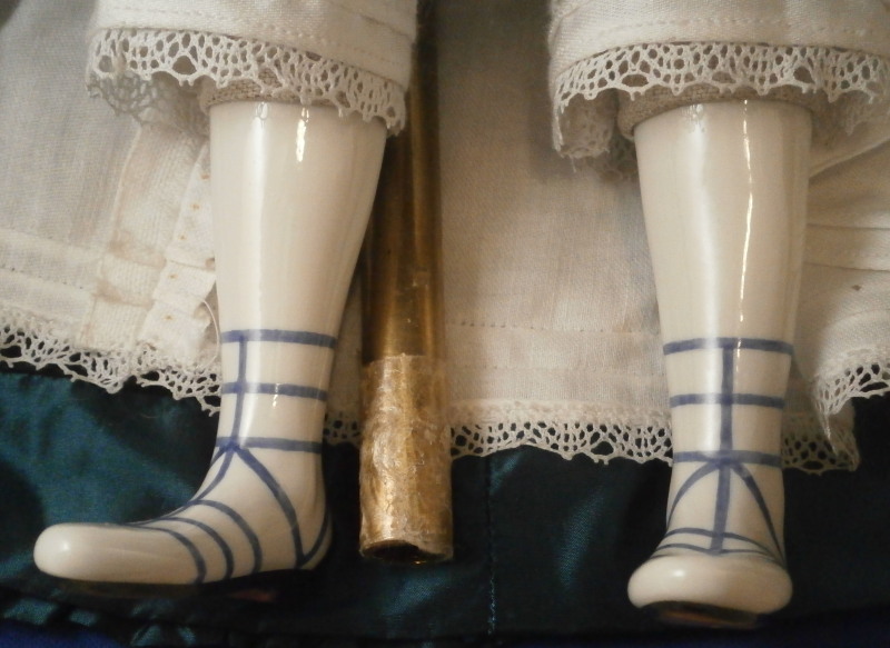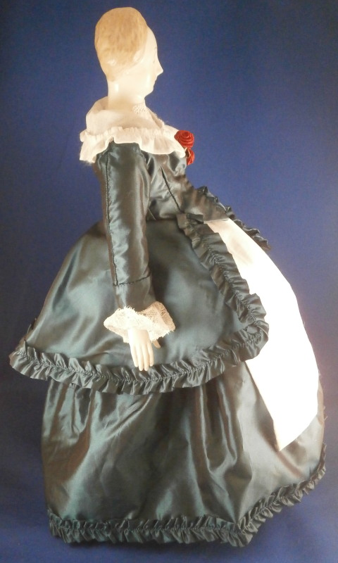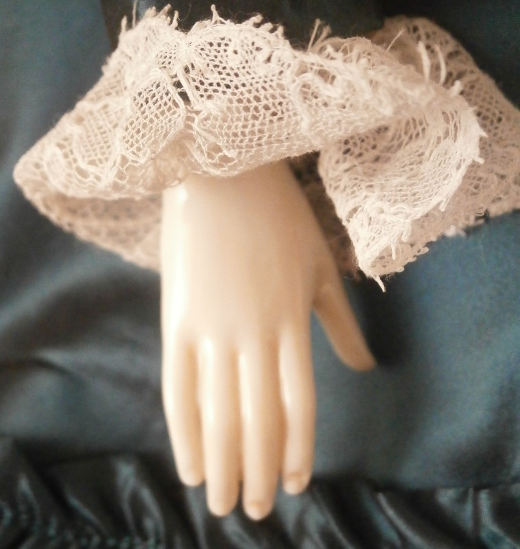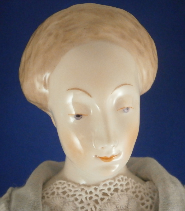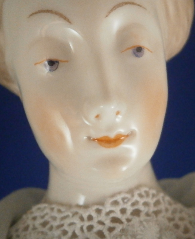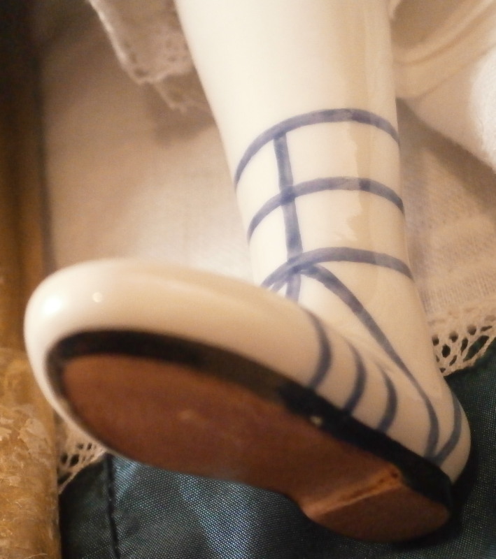 This is an amazing piece made by Nymphenburg in Munich , Bavaria in the early to mid 20th century and the first time that I have ever played with a doll - plus my girls are all over this one :) I'll try to describe it as best I can since this is a bit out of my usual area of collecting. It is a porcelain china head plus shoulder plus hands and feet doll. I know Wackerle designed some of the heads ( he also made the ones for the Munich Art Dolls but I have no idea if this is one of the ones and apparently someone called Frau Kommerzienrat (though this is jsut a title and not an actual name of a person so no idea who this would have been) made the dresses. These Nymphenburg pieces are even better than the more common Dressel Kister ones that are also very collectible. Now back to this actual figure here - the head is amazingly well modeled and painted, and the fingers of the hands are really well done - to Nymphenburg's high standards. The feet have sandals on them with blue straps as shown. The body is made of cloth and from what I can figure out it is stitch jointed at the hips and shoulders - from what I could find in doing a bit of research. The dress is the nicest I could find anywhere an appears original to the piece. A beautiful shiny deep teal color with lots of amazingly detailed lace and a simple white apron. Plus look at that rose bouquet - a really nice touch! An added bonus I could not find with any other doll is that it come with its original stand - a porcelain base with a hole in the back that a metal pole goes into which has two prongs on top that hold the body of the doll tightly in place. That stand is marked with both their impressed shield mark on top of the base and their green shield mark underneath as well as the model number 2170 and the letters MJ. And now for the best part - she is flawless in terms of the porcelain and appears to be perfect otherwise as well though that part I have no idea what to look for - so ask any questions you might have. The piece is about 15 inches tall, the bottom of the dress is 10 inches wide and 7.5 inches deep. Please email me for more information or other pictures.