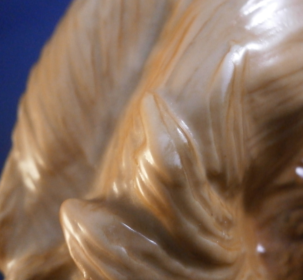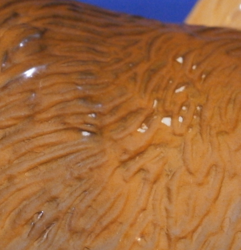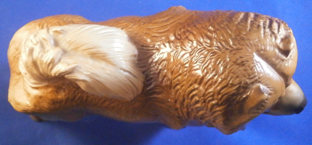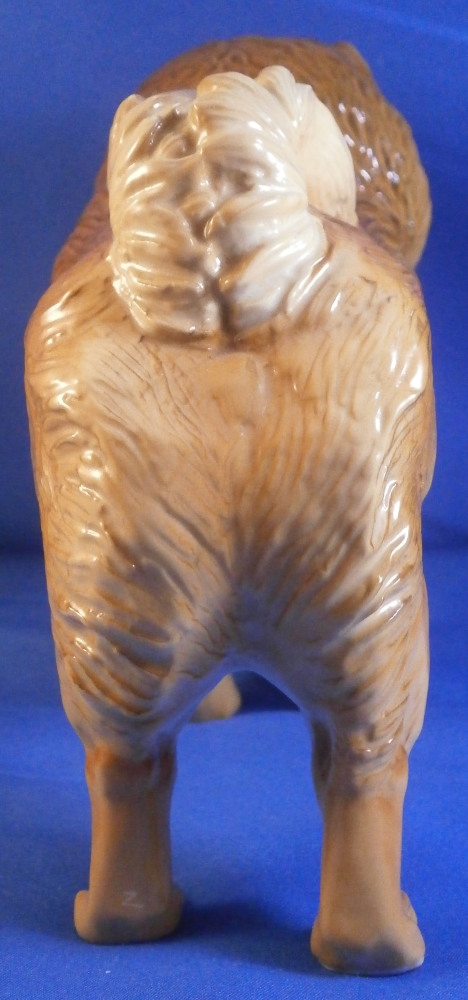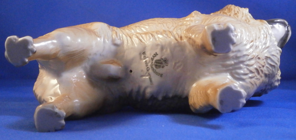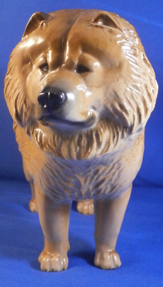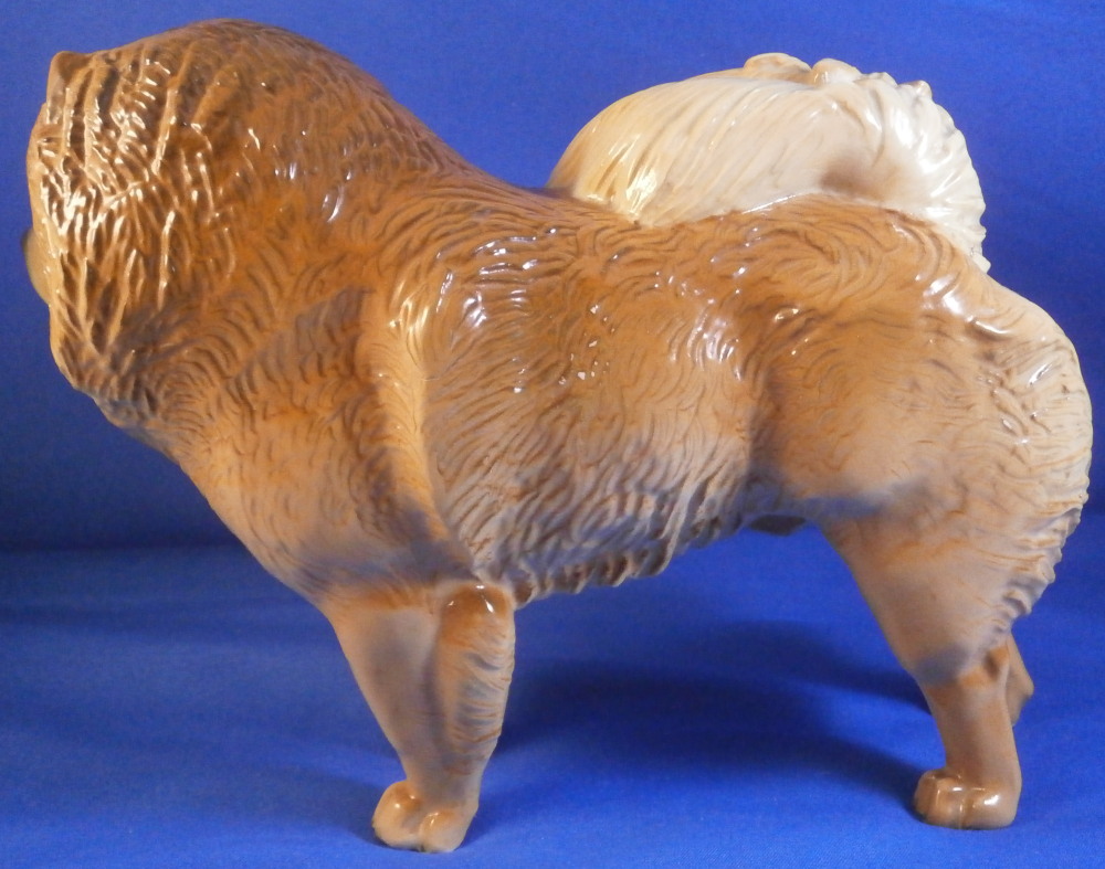 This is a great figurine of a chow chow dog made by Nymphenburg in the mid 20th century. It was first designed by Konrad Schmid during the earlier part of thr 20th century. He made some amazing models of dogs and along with his coworker Kaerner they made what are still the best figures out there today I believe. The figurine is superbly modeled and painted. Lot of detail to the figure! He is about 5.5 inches tall, 3 inches deep and 7 inches long. The figure is marked with the impressed shield mark underneath as well as the model number, letters K.S. incised, the green shield mark with Nymphenburg under that and Western Germany under that. . The left back leg is marked with the painter's mark Z in white though as shown. He is in the same condition as when he was first made but does ahve some white spots especially in one area on the back side as shown from when he was made. Not unuusal for this maker to have some minor imperfections and it does not distract from this superb figurine! Please email me for more information or other pictures.