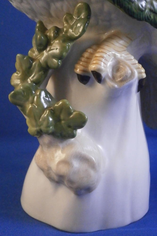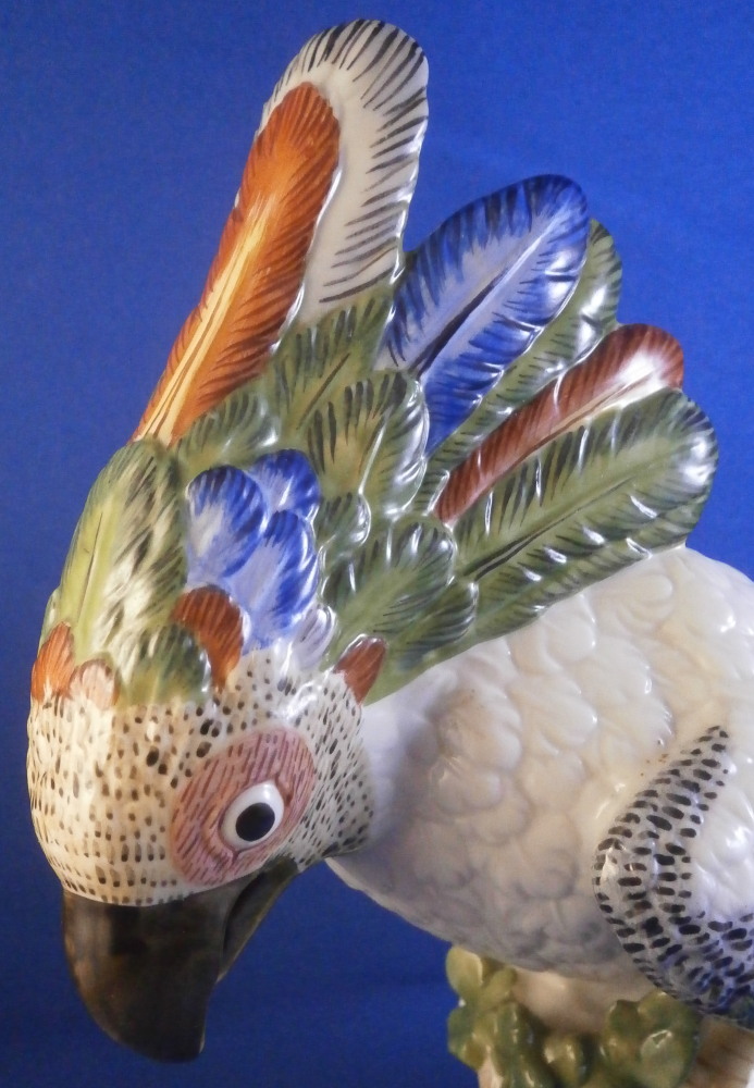 This is a figurine of a cockatoo / parrot bird made by Nymphenburg in the 20th century. It is really nicely modeled sitting on a tree stump with a branch with its leaves coming out the side towards the front and hand painted elegantly with nice colors. This is the version with the wings up against its body but I also have the other version on the site with the wings lifted up a bit if anyone is interested in a rare pair. The figure is super cute. Not a model you see very foten either which is a plus. The colorful plumage of the head feathers and the ends of the wings and tail are stunning! The piece is 7.75 inches tall, 3.25 inches wide and 5.5 inches deep. Marked with the impressed shield mark to the underside as well as numbers 413a and 6 plus the green shield mark with the crown above and Nymphenburg underneath it and the painter's initials NB in red as shown. The figurine is in perfect condition. Please email me for more information or other pictures.