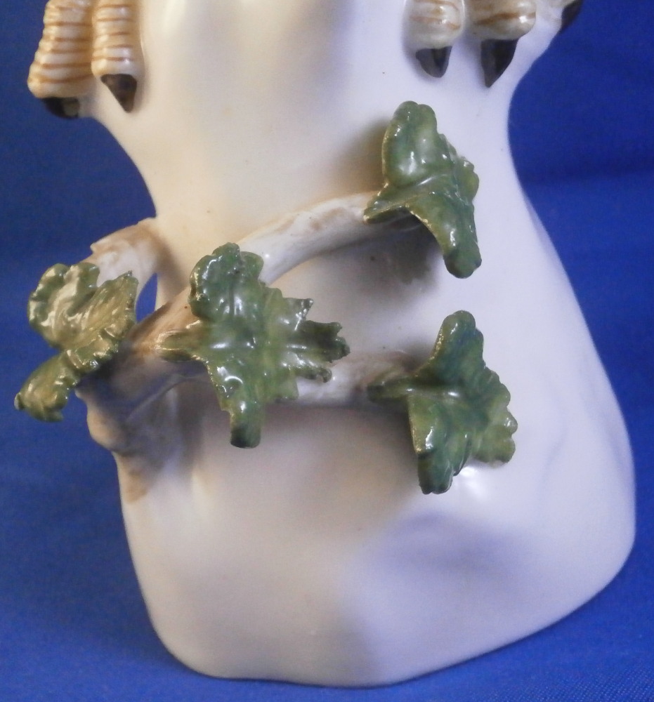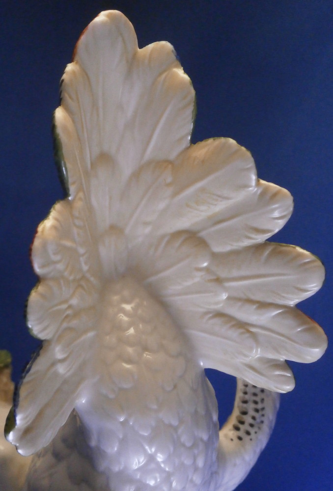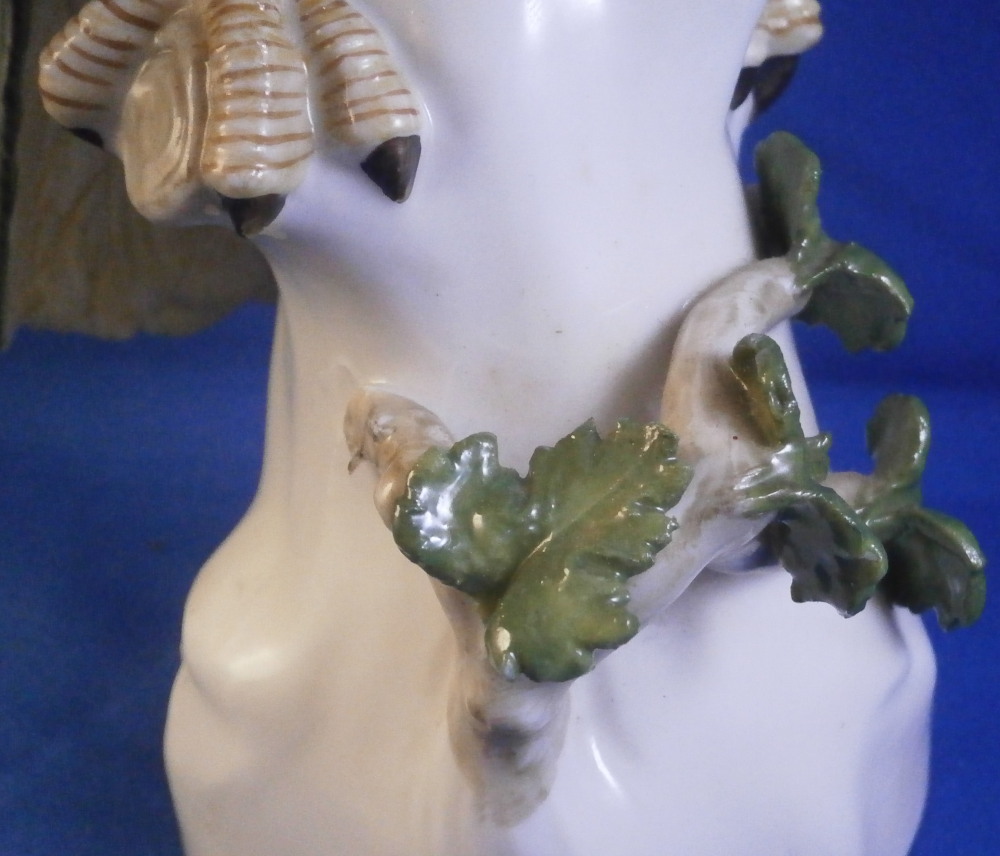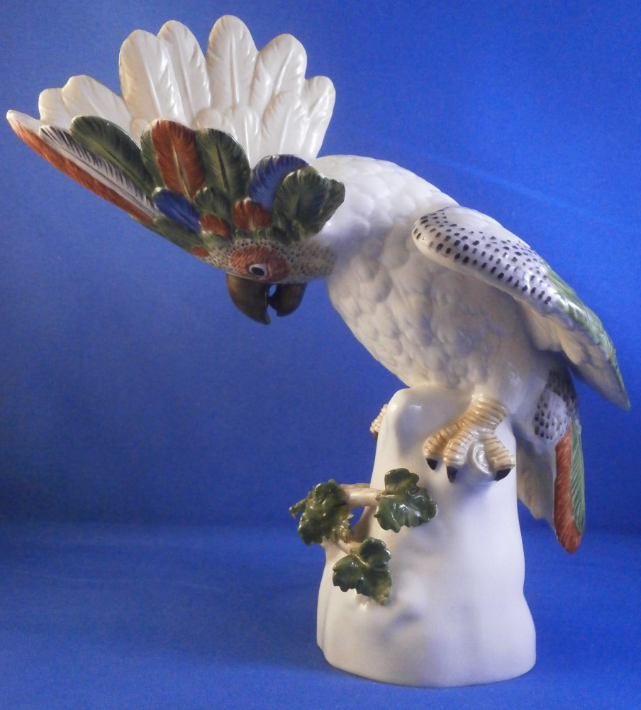 This is a figurine of a cockatoo / parrot bird made by Nymphenburg in the 20th century. It is really nicely modeled sitting on a tree stump with a branch with its leaves coming out the front and hand painted elegantly with nice colors. This is the version with the wings up a bit but I also have the other version on the site with the wings against the body if anyone is interested in a rare pair. The figure is super cute. Not a model you see very often either which is a plus. The colorful plumage of the head feathers and the ends of the wings and tail are stunning! The piece is 7.5 inches tall, 5.375 inches wide and 7 inches deep. Marked with the impressed shield mark to the underside as well as numbers 413b and 6 plus the green shield mark with the crown above and Nymphenburg underneath it and the painter's initials NB in red as shown. The figurine is in perfect condition. Please email me for more information or other pictures.