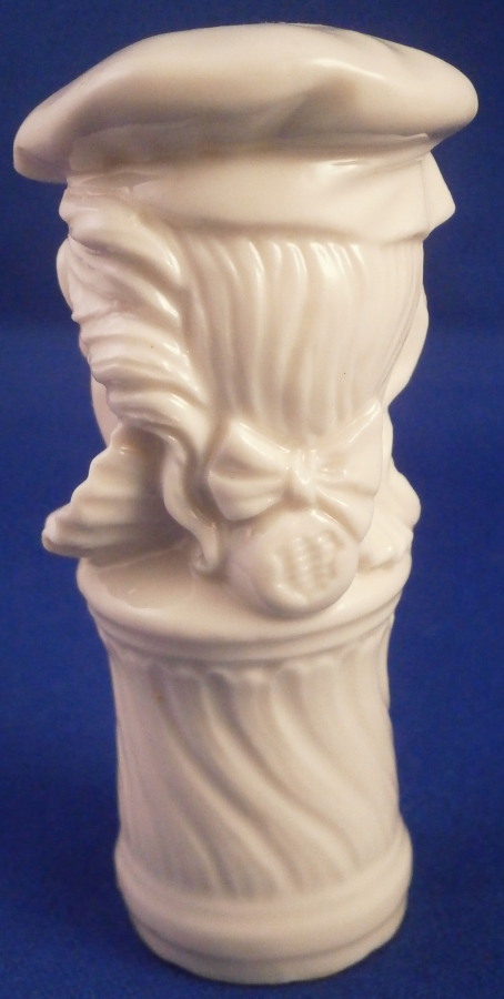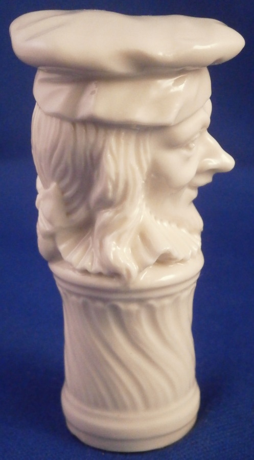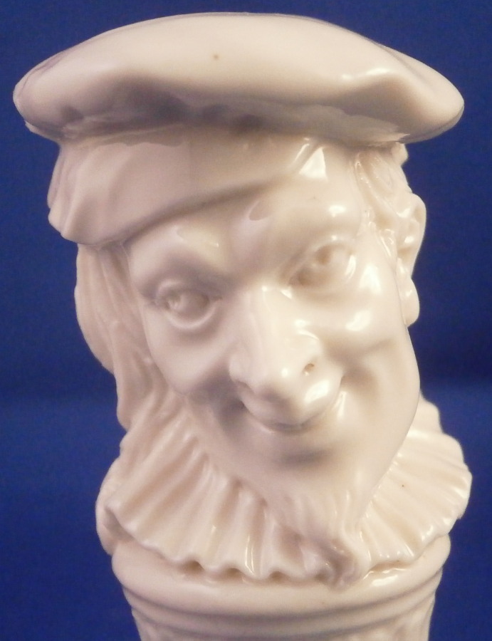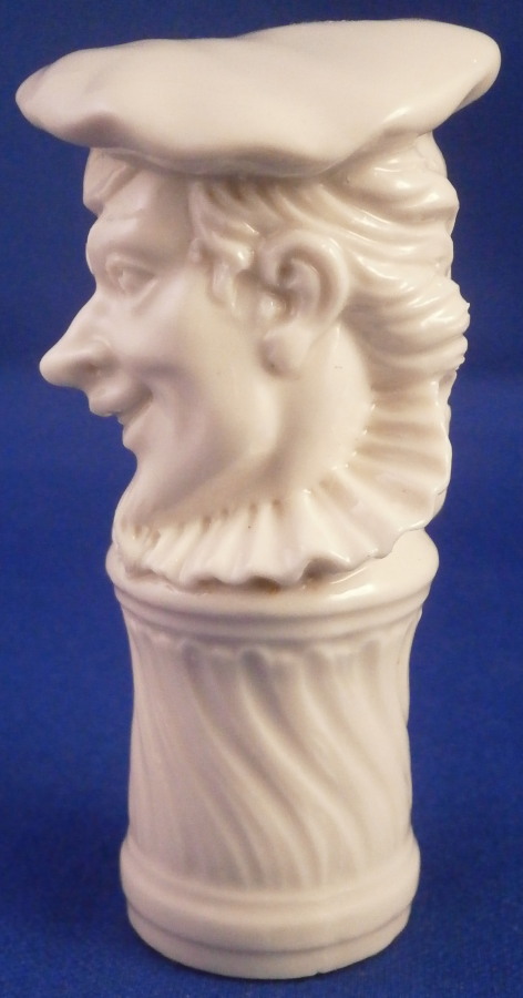 This is a superb figural bottle stopper / cane handle made by Nymphenburg around in the 20th century. Originally designed by Bustelli and I beleive one of the commedia dell'Arte characters though I am not sure which one. Looks like a mischievous character that is for sure! It is in the shape of a gentleman's head with a hat on top and a decorative column underneath. The porcelain is in excellent condition but the cork is missing which makes it perfect for use as a cane handle as well now or one could easily add a new cork if one wanted to! The piece is marked in the back underneath the bow with the impressed shield mark as shown. The piece is 2.875 inches tall, 1.25 inches wide and 1.375 inches deep. Please email me for more information or other pictures.