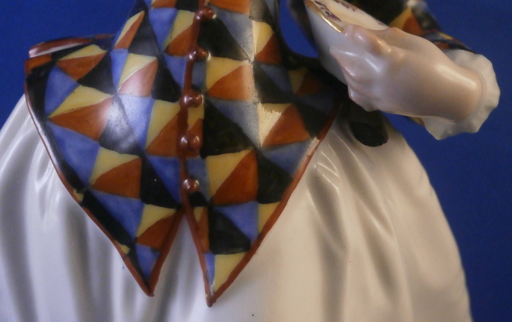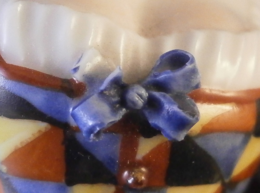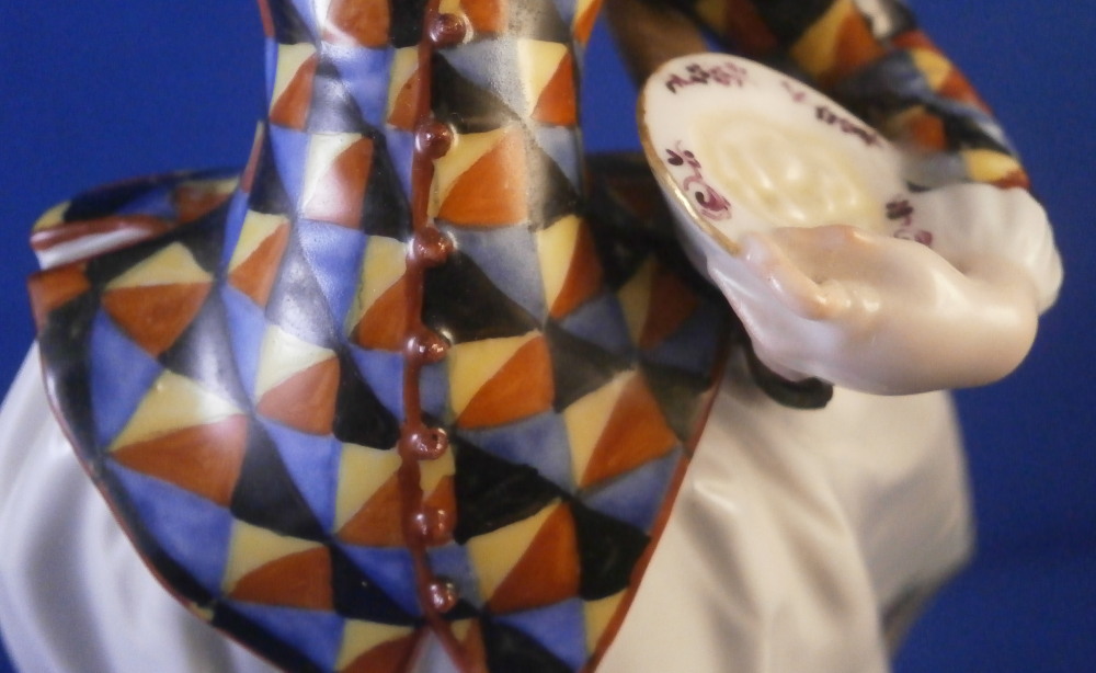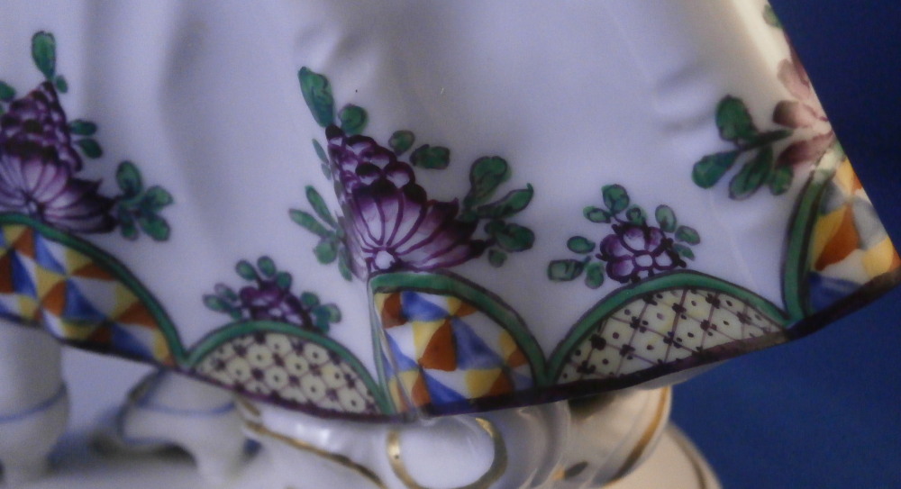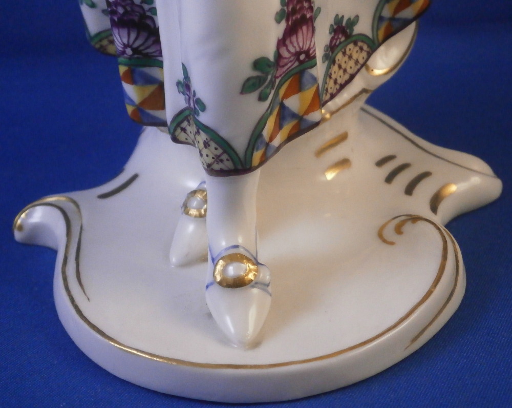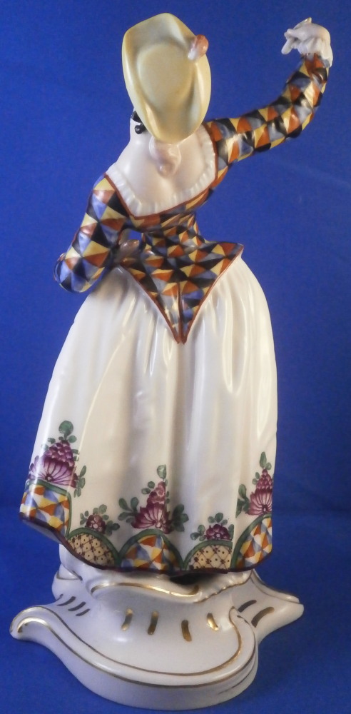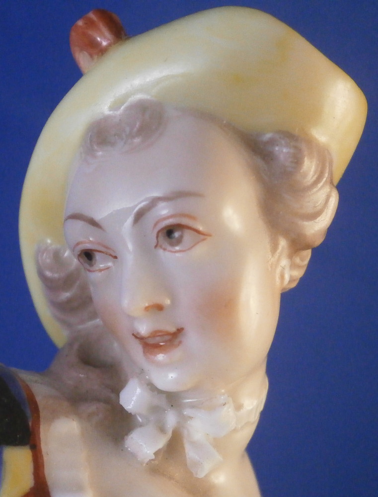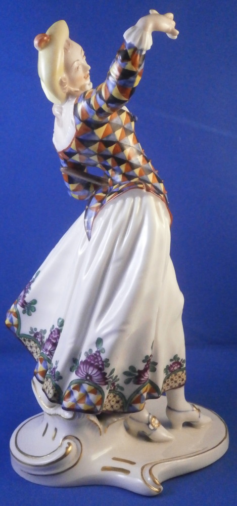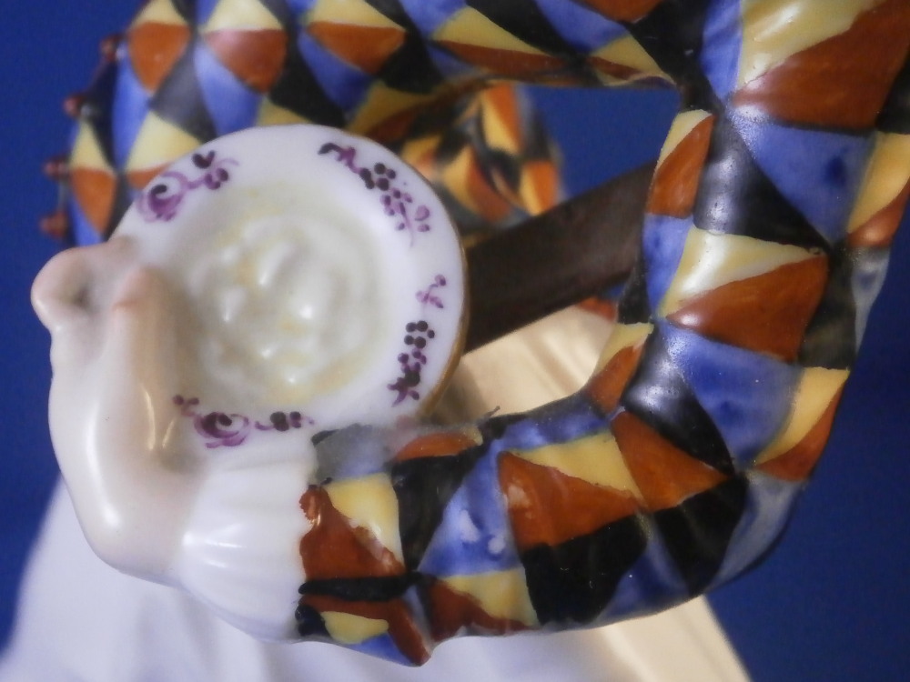 This is one of the best figurines from the Commedia dell'arte aka the Italian Comedy series made by Nymphenburg in the early 20th century. These were first modelled by Franz Anton Bustelli, regarded as one of the best porcelain sculptors, in about 1760 and are still as popular as ever today! And one can see why with the superb and lifelike poses and the top notch hand painted details especially around the bottom end of the skirt! This figurine here is Lalage holding a spoon in one hand and a bowl in the other in order to feed the little monkey baby that Mezzetino is holding (a figure I also have up on the site!). The figurine is stunning and amazingly in great condition with one of the tiny loops of the blue bow by her bussom missing and the bottom end of the slap stick under the arm holding the bowl having been chipped which was colored in and due to the location is impossible to see when on display. She displays perfectly! This is one of my favorite figures in the world of porcelain! The figure is 7.875 inches tall, 4 inches wide and 4.25 inches deep. The piece is marked with the impressed shield mark underneath and impressed number 1 over 0 as shown. New these cost in the five figures and are often not as nice as the older pieces. Please email me for more information or other pictures.