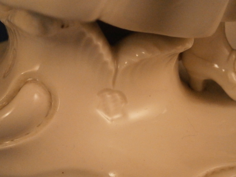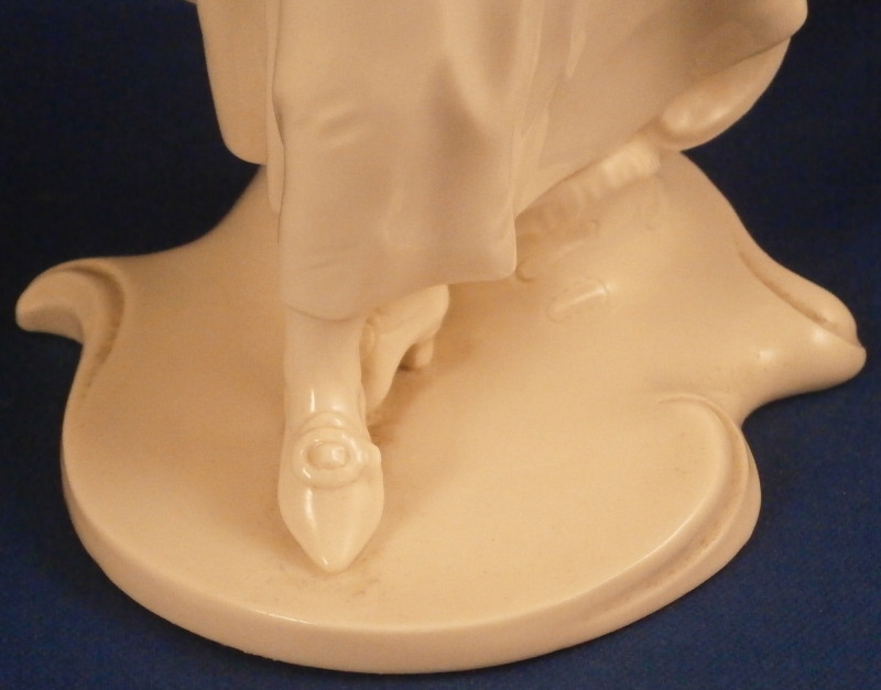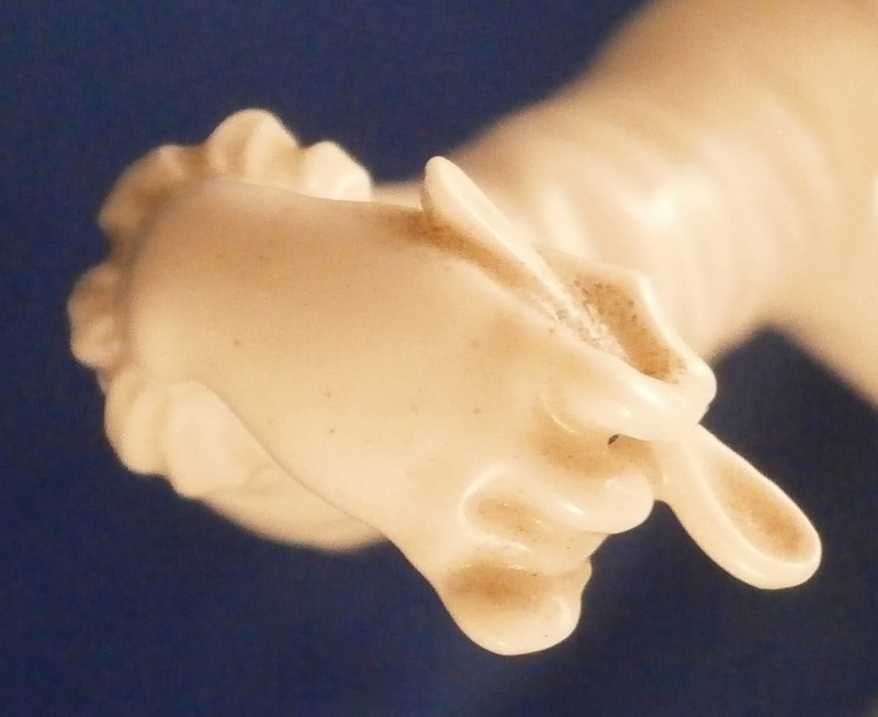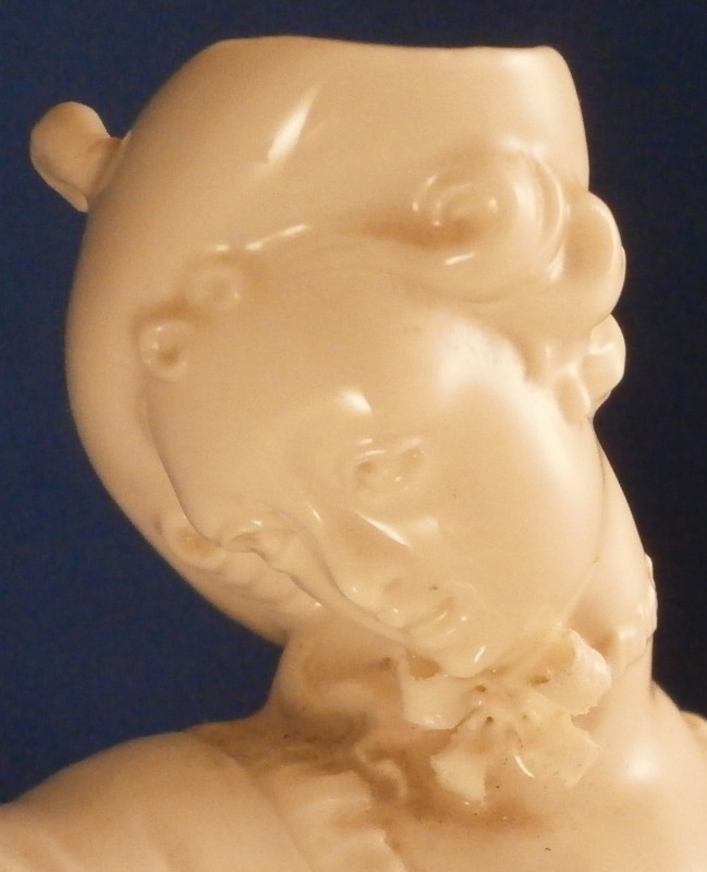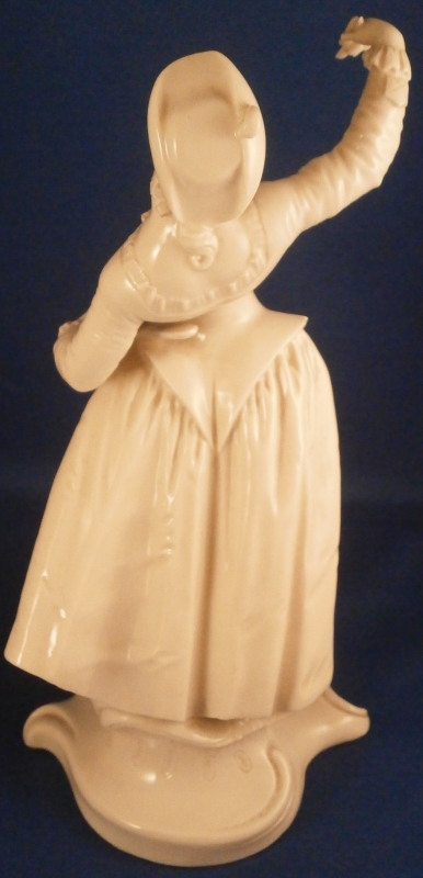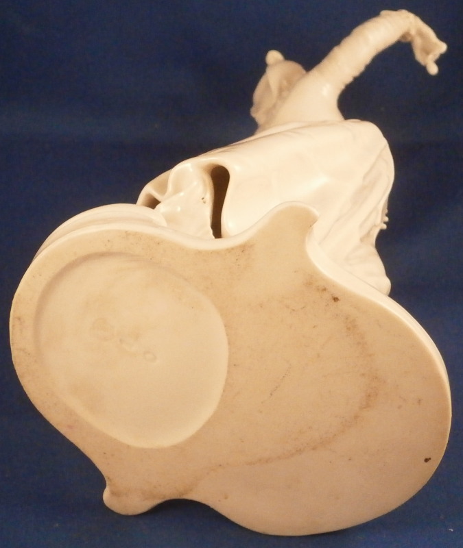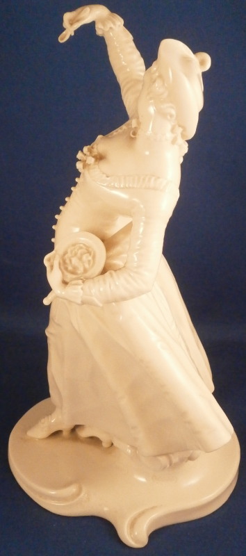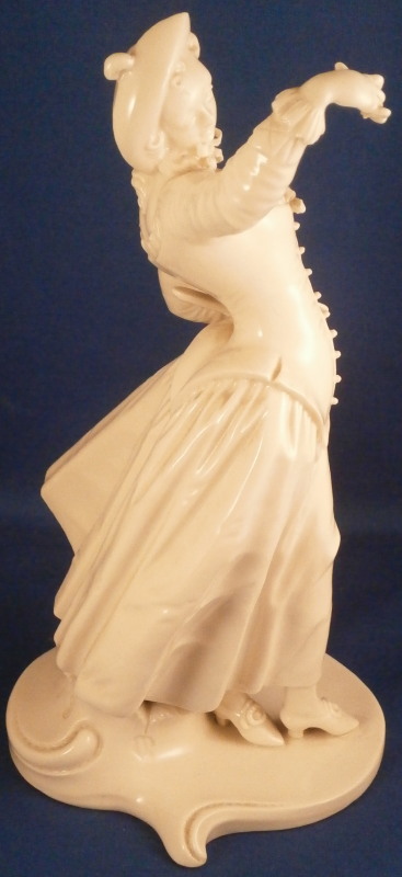 This is a figure of Lalage made by Nymphenburg in the late 19th or very early 20th century when they were first remade after the original 18th century models. She is one of the commedia dell'arte figurines - one of the greatest set of figurines ever designed by the famous Bustelli who made the best porcelain figurines ever! Superbly modeled with a nice pose and lots of detail left in the white (pure white not off white as the photos show - the camera is giving me a tough time again) to show it off perfectly! She is wearing a corset and a nice skirt with a bow around her neck while holding a bowl in her left hand and a spoon in her right - ready to feed the baby monkey that Mezzetino is holding in his arm. Sadly I do not have that figure - yet. The figure has the impressed shield mark on left side of the column under her skirts as well as underneath and the impressed number 1 over 0. She is in perfect condition which is amazing after all this time since the spoon or slap stick are often damaged. Not here though! The figurine is 8 inches tall, 4 inches wide and 4.25 inches deep. Please email me for more information or other pictures.