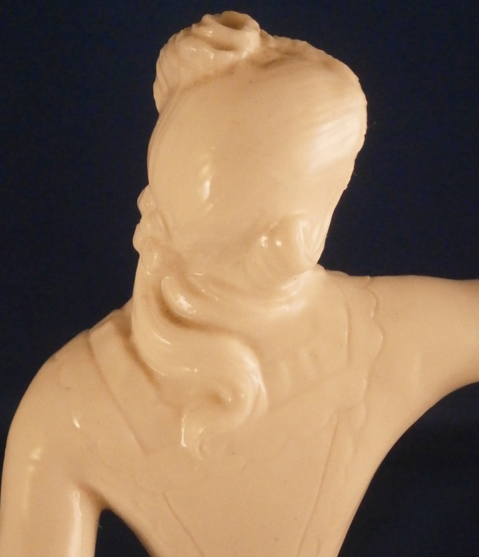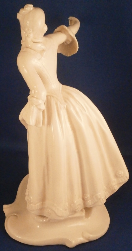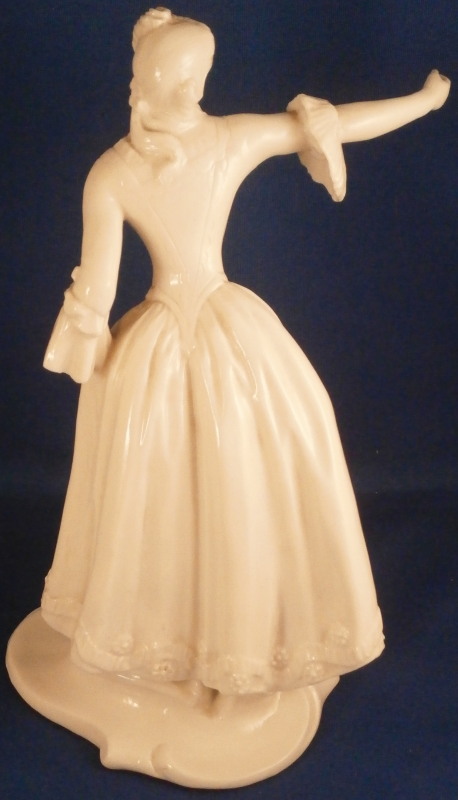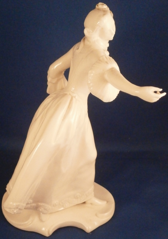 This is a figure of Leda made by Nymphenburg in the late 19th or very early 20th century right they were first remade after the original 18th century models. She is one of the commedia dell'arte figurines - one of the greatest set of figures ever designed by the famous Bustelli who made the best porcelain figurines ever! A very ahrd to find figure with the arm still straight out - later the forearm was raised into the air. Superbly modeled with a nice pose and lots of detail left in the white (pure white not off white as the photos show - the camera is giving me a tough time again) to show it off perfectly! She is wearing nice skirt with bows around her neck and in the middle of her chest while staind on a simple yet elegant base typical for this series. The figure has the impressed shield mark underneath and the incised number 85. She is in perfect condition - amazing after all this time and that outstretched arm! The figurine is 7.375 inches tall, 5 inches wide and 4.25 inches deep. Please email me for more information or other pictures.