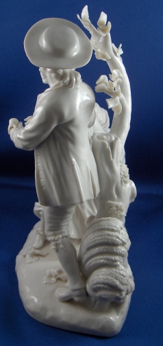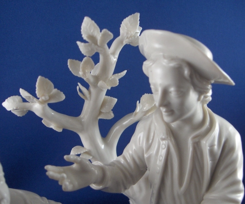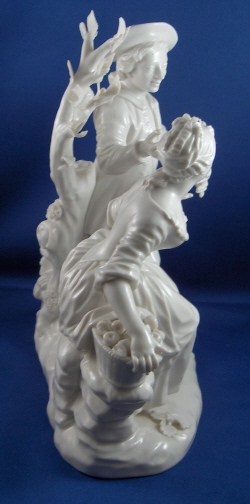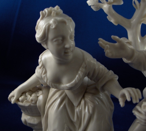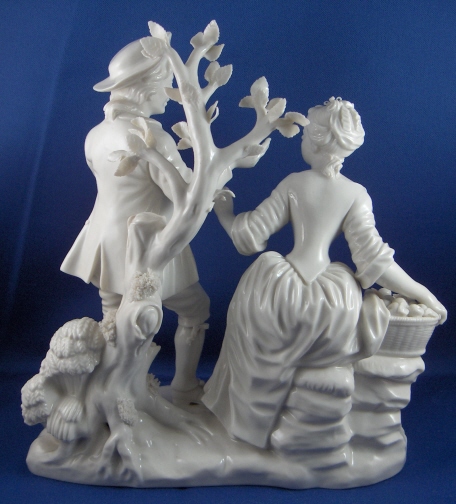 This is a figure of a couple made by Nymphenburg in 1962. It is of a lady sitting with a basket of apples by her side and a gentleman standing next to her as if telling her something. A tree and some wheat stalks behind them plus some flowers on the base make this figurine just superb. The figurine is 8.75 inches tall, 8 inches wide and 4 inches deep. Marked with the impressed shield mark and impressed numbers 1130 over 10. Also the underglaze blue Frankenthal lion mark and the year mark 1962. The figurine is almost in perfect condition with just one chipped off leaf in the back and very hard to notice. Amazing considering all the fragile parts on this figurine. Please email me for more information or other pictures.
