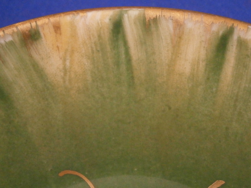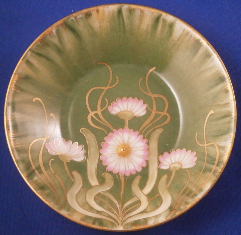 This is a really nice demitasse cup and saucer made by Nymphenburg in the late 19th century. Can be used for mocha or espresso coffee or just for show :) The set is hand painted with a very Art Nouveau floral design in gold, pink and green on a green ground that runs in streaks along the rim with some more gold trim to the edges. A stunning design that one does not come across very often at all! I just love this little peice! The cup is 1.875 inches tall and 1.875 inches in diameter. The saucer is 0.875 inches tall and 3.75 inches in diameter. Both pieces are in superb condition with some very minor wear to a spot or two. They are marked underneath with the rare under glaze blue shield mark as shown with the word Nymphenburg underneath. Blurry but it is there! The saucer also has some impressed marks and green numbers as shown. Please email me for more information or other pictures.
