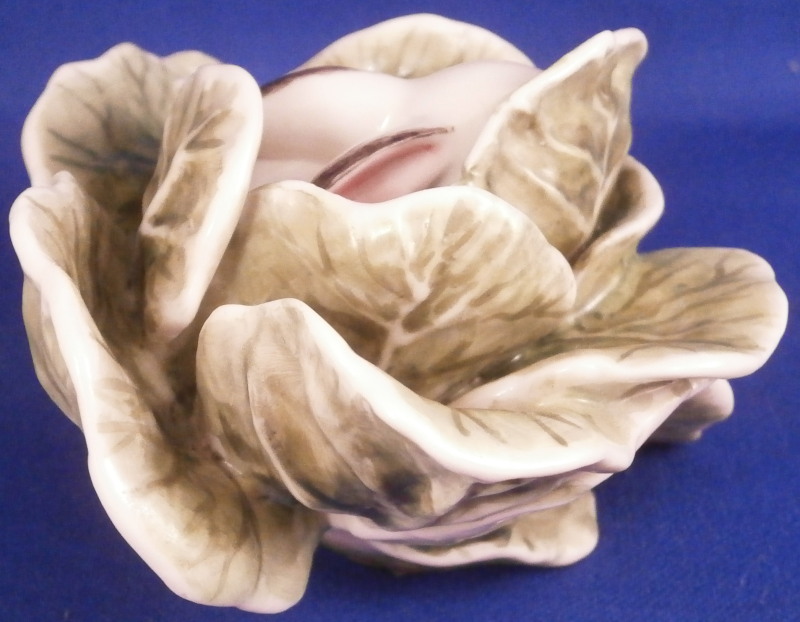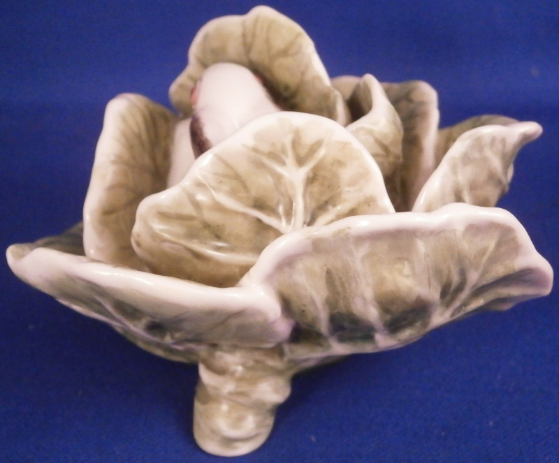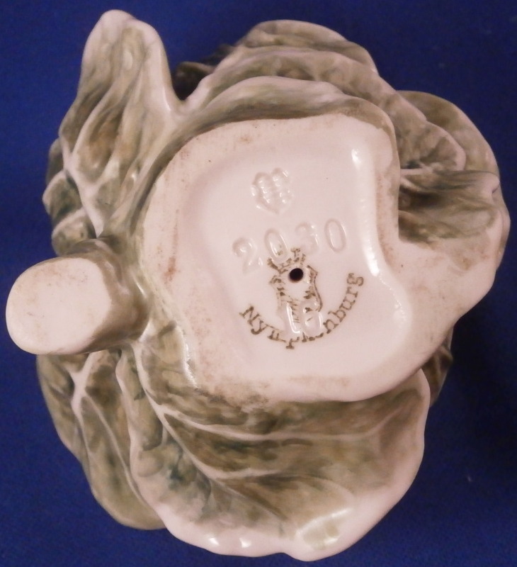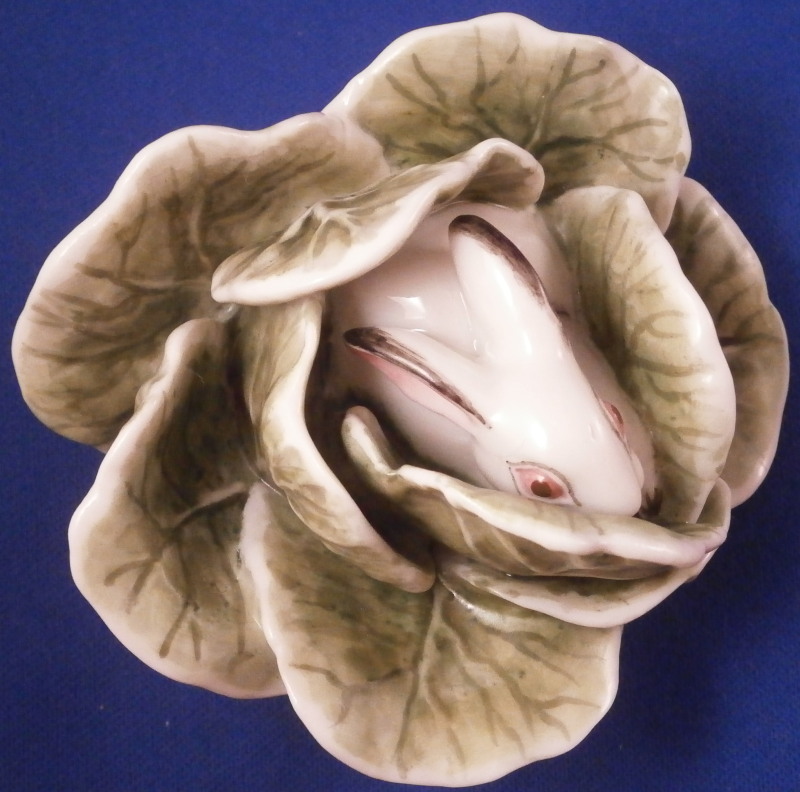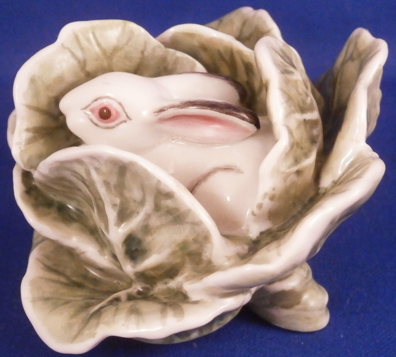 This is a fun figurine made by Nymphenburg in the 20th century. It is of a bunny hiding in the center of a lettuce or green cabbage . This has always been one of my favorite small pieces of porcelain! Super cute piece! It is very well modeled and hand painted with great colors and detail with the bunny just peaking out of the center. The figure is marked underneath with the impressed shield mark, numbers 2030 over 16 as well as the green shield mark with Nymphenburg underneath. On the side of the base are the artist initials LTS for Luise Terletzki - Scherf who modeled this and many other amazing animal pieces for them. The piece is in perfect condition. The figurine is 2 inches tall, 3.25 inches wide and 2.75 inches deep. Please email me for more information or other pictures.
