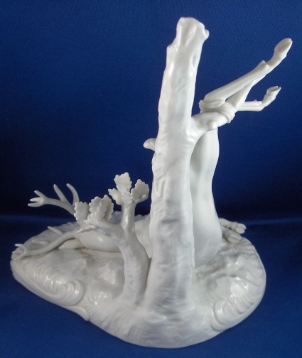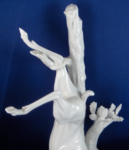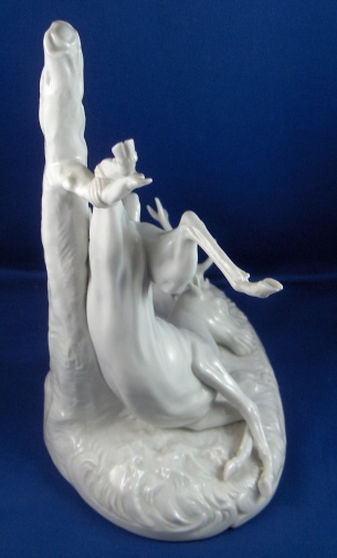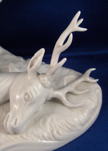 This is a figure of a dead deer made by Nymphenburg in the early 20th century. It was originally a Frankenthal model and part of the hunting scene set consisting of many different figurines. Nymphenburg re-did these models starting in the late 19th century and still makes some of them today. This figurine is in perfect condition. The deer was tied to the tree with his one hind leg and the neck was slashed so it could bleed out. It is a very well modelled figure and not too small either being 8.75 inches tall, 5 inches wide and 7.5 inches long. Marked underneath with the impressed shield mark and impressed numbers 1131a over 10. Also the underglaze blue Frankenthal lion mark and a black 11. There is another impressed shield mark to the top of the base in the front by the slashed thoat. Please email me for more information or other pictures.