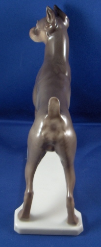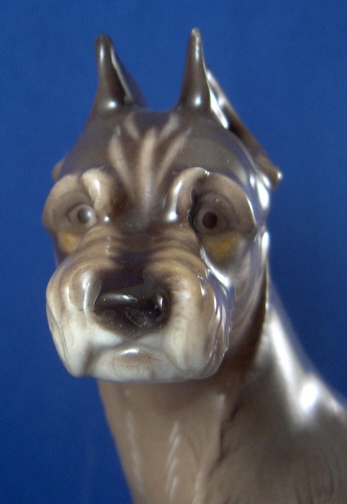 This is a figure of a dog made by Nymphenburg in the mid 20th century. I do believe it is a giant Schnauzer but I am somewhat clueless in the dog department :) Either way he is superbly modeled and painted just right to make him very elegant. The dog is 7 inches tall, 2.75 inches wide and 7 inches long. Marked with the impressed shield mark underneath with the number 361 over 6 underneath it. Also marked with the green shield mark with the word Nymphenburg and Western Germany. So made just after WWII. There is also an impressed and blue painted shield mark in the front of the base. He is in perfect condition. Please email me for more information or other pictures.