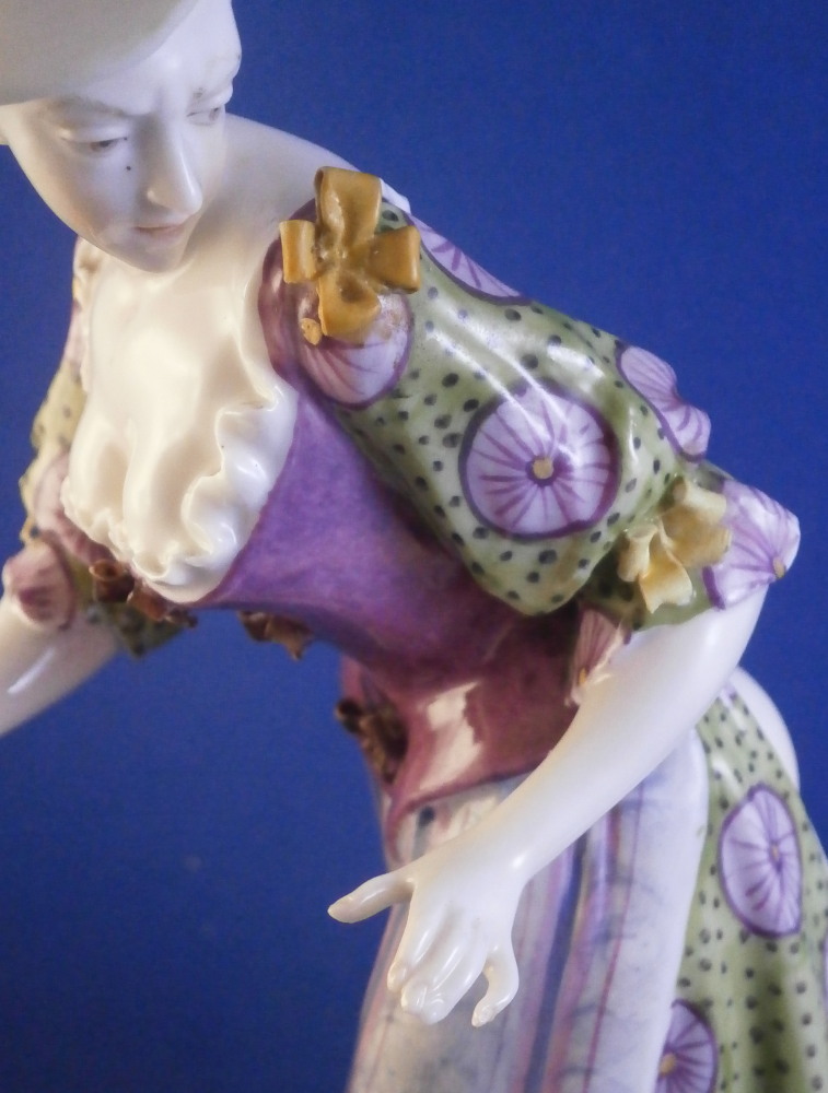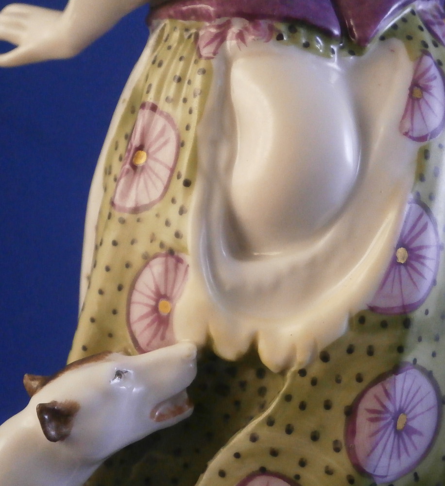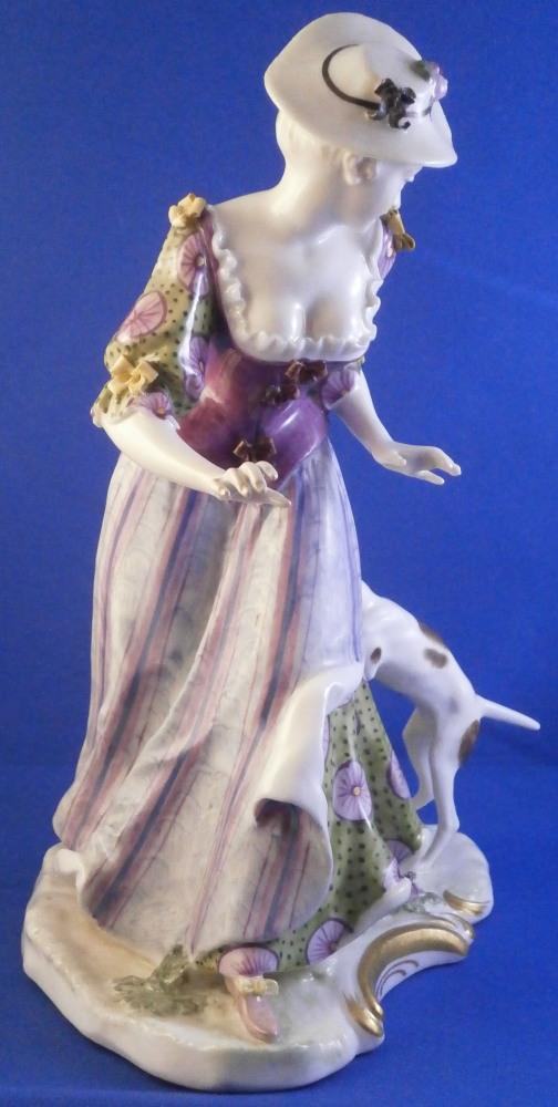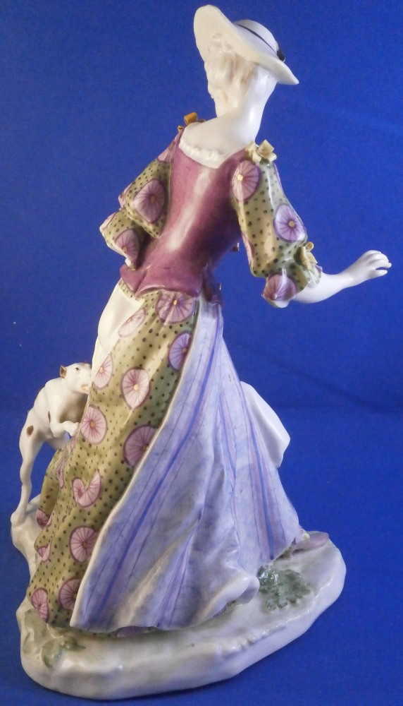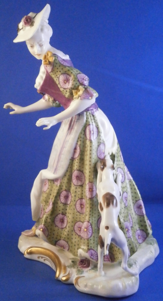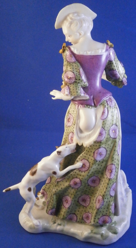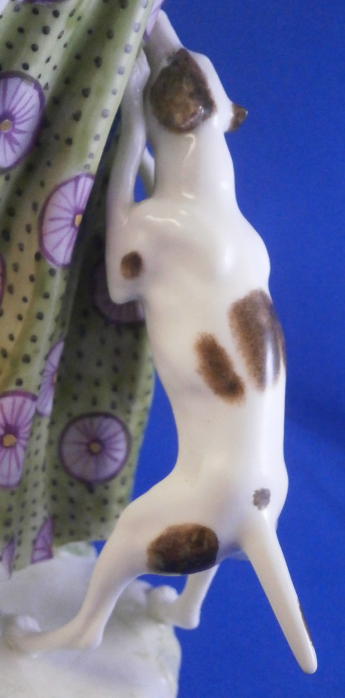 This is a figure of a lady being attacked by a dog made by Nymphenburg around 1900 or when Baeuml first took over as director and copied the old models. A very different figurine compared to all others in the porcelain world. Showed that Bustelli had a sense of humor! This is the rarer larger version! The lady is painted quite nicely with a very intricate design including lots of bows and the hat has a rose on it that make her look very elegant. The dog has brown spots and is in the process of biting her in the butt but mssing and jsut ripping her skirt. She is marked with the impressed shield mark underneath as well as the incised number 9 1/2 II underneath. The figurine is in great condition with a bit of damage to the bows which is to be expected. One has been restored - the oneright by her face. I have never seen one of these restored as it is a very difficult job so whoever did it was a master at his craft. The figure is 8.5 inches tall, 5.5 inches wide and 4.375 inches deep. Please email me for more information or other pictures.