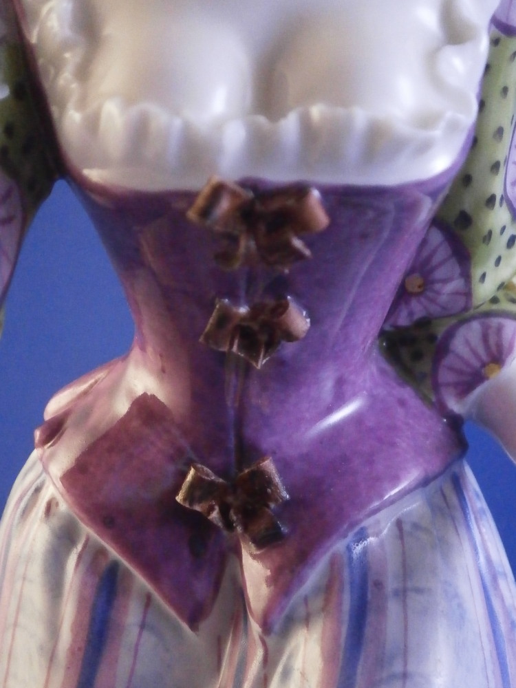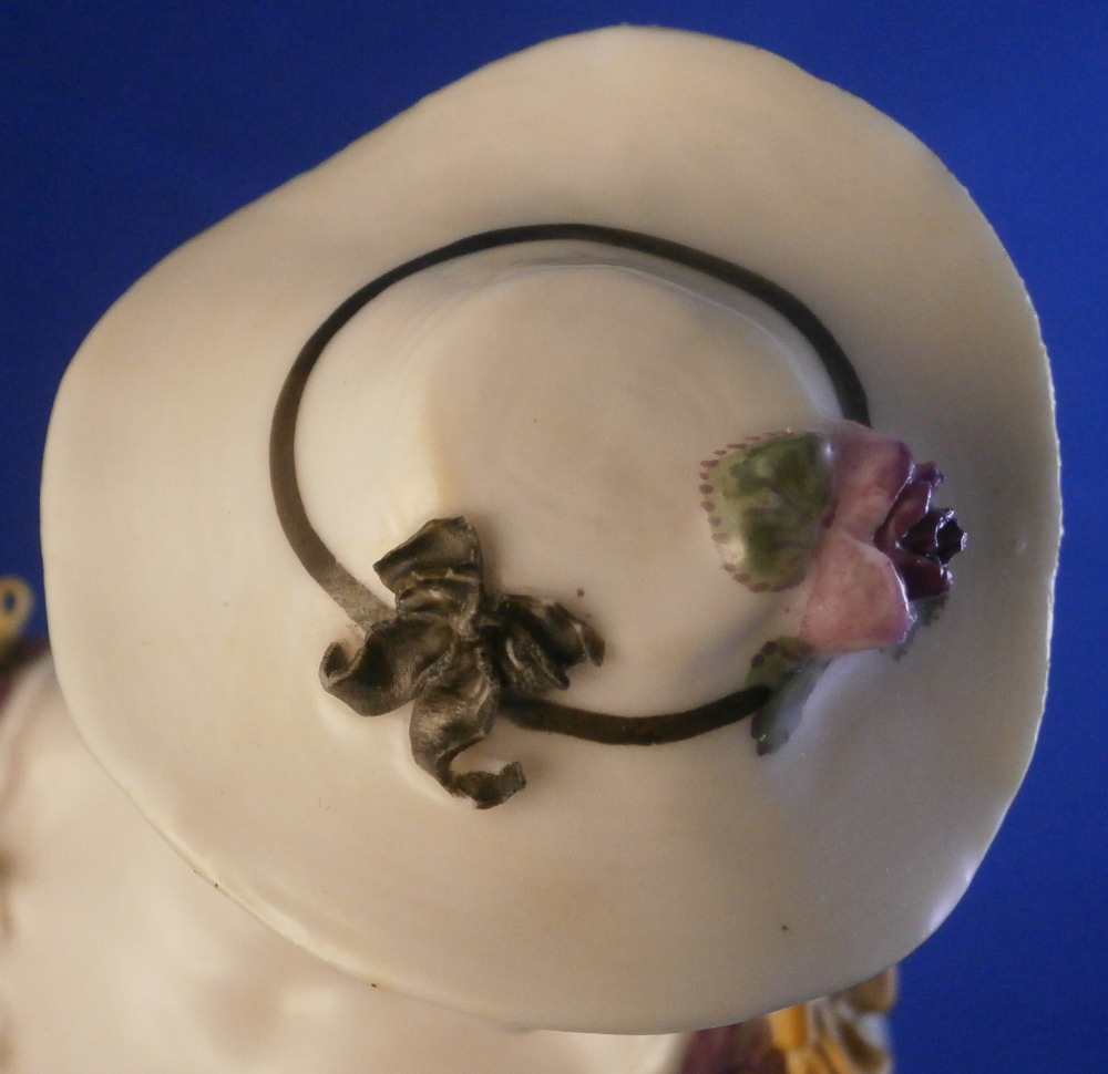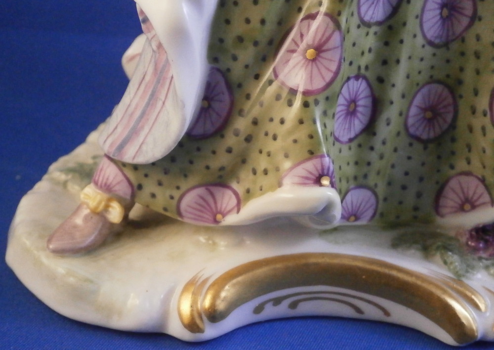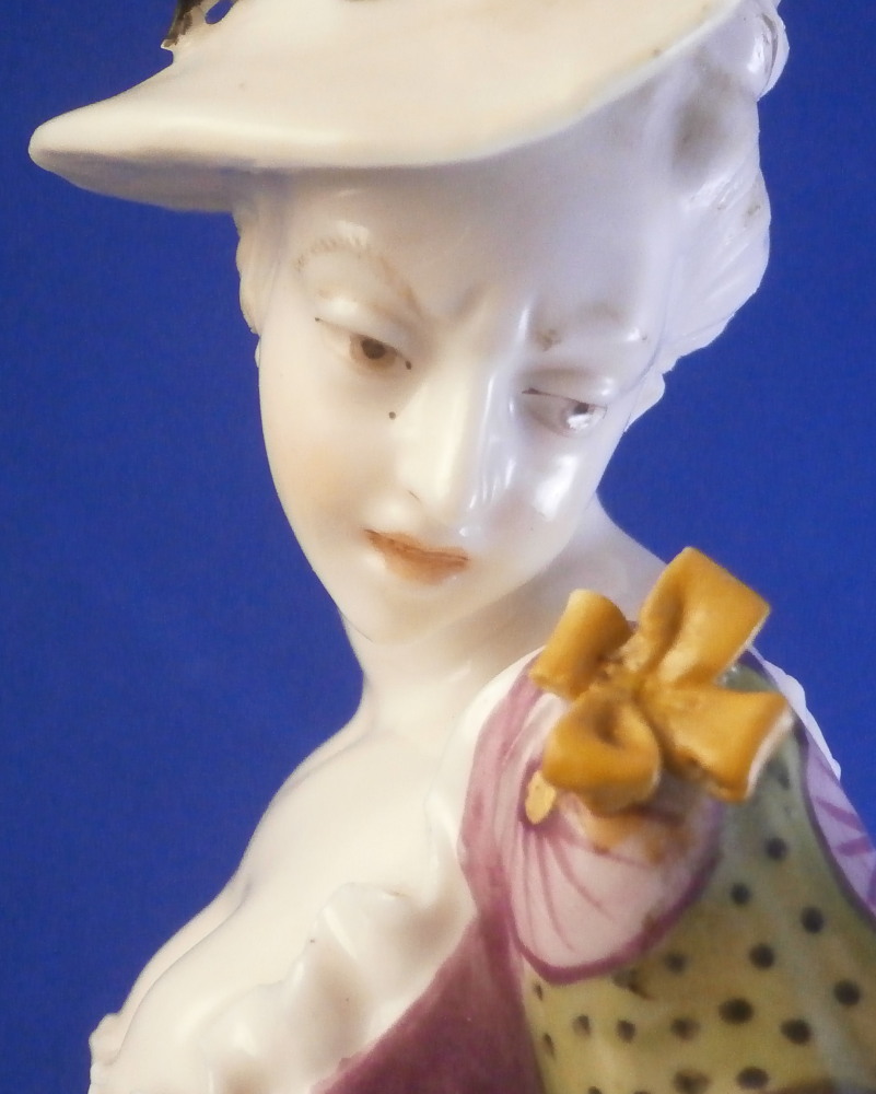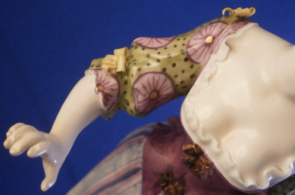 This is a figure of a lady being attacked by a dog made by Nymphenburg around 1900 or when Baeuml first took over as director and copied the old models. A very different figurine compared to all others in the porcelain world. Showed that Bustelli had a sense of humor! This is the rarer larger version! The lady is painted quite nicely with a very intricate design including lots of bows and the hat has a rose on it that make her look very elegant. The dog has brown spots and is in the process of biting her in the butt but mssing and jsut ripping her skirt. She is marked with the impressed shield mark underneath as well as the incised number 9 1/2 II underneath. The figurine is in great condition with a bit of damage to the bows which is to be expected. One has been restored - the oneright by her face. I have never seen one of these restored as it is a very difficult job so whoever did it was a master at his craft. The figure is 8.5 inches tall, 5.5 inches wide and 4.375 inches deep. Please email me for more information or other pictures.