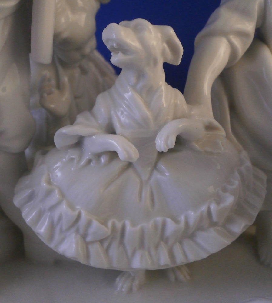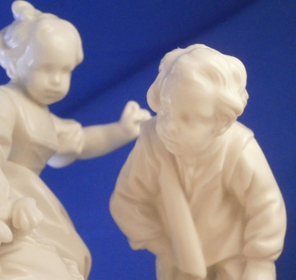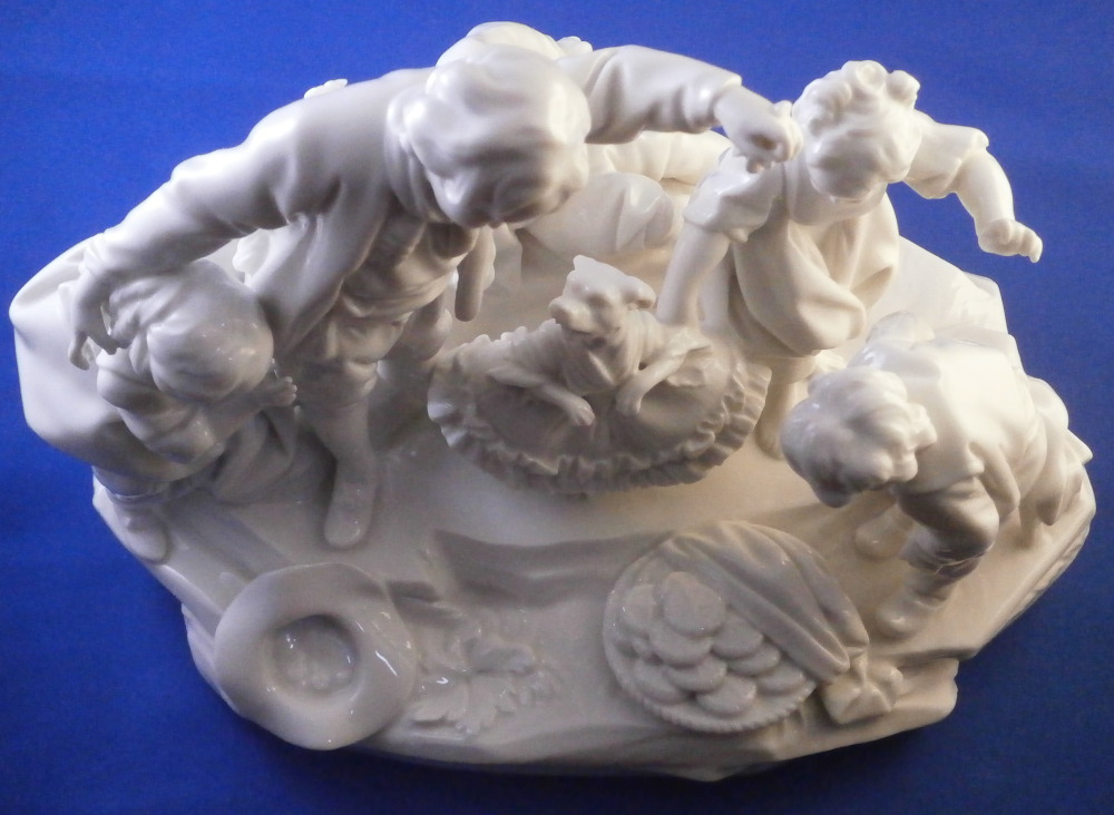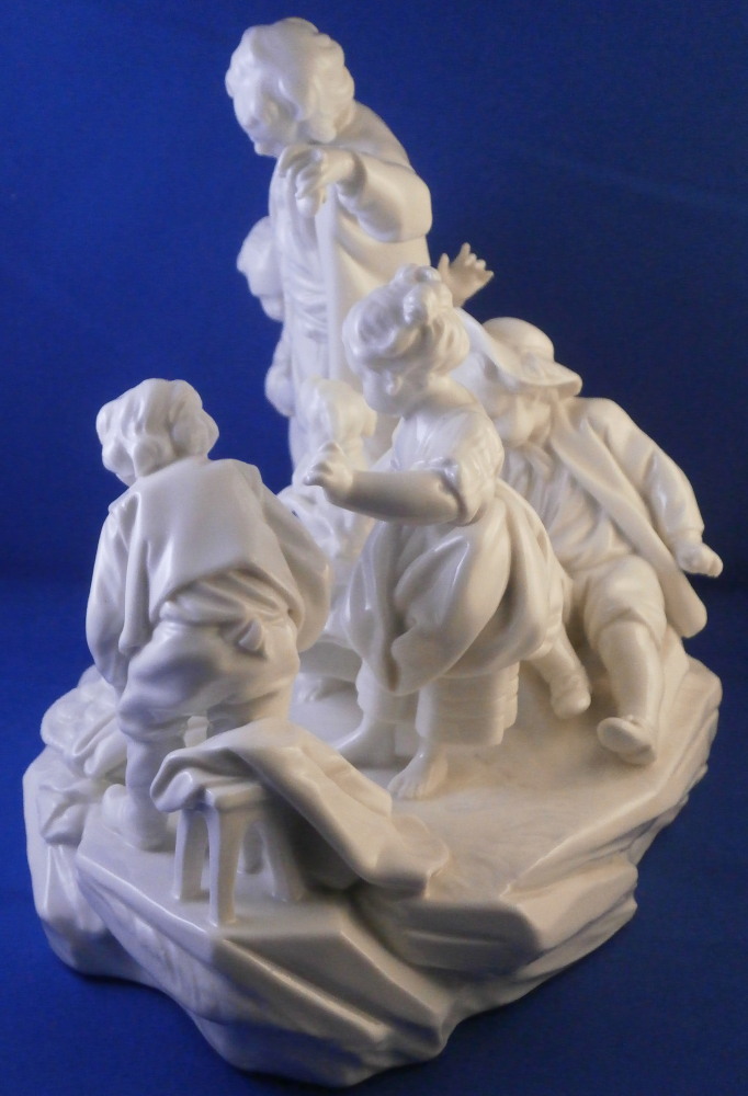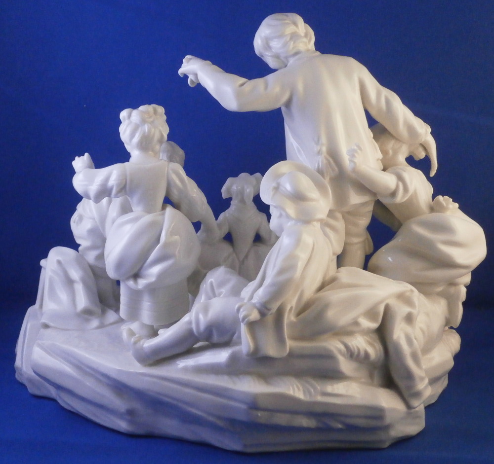 This is a really nice figure of a couple of kids playing with their dog made by Nymphenburg in the late 19th century or early 20th century. I cannot find this model made by them but I suspect it was originally a Frankenthal model by the way it looks though I cannot find it there either. A superb figure with 5 kids surrounding a dog dressed in doll's clothing in the center. There are two younger girls wearing dresses, two younger boys and an older boy or young gentleman that looks to be holding castanets to make the dog dance maybe. A hat on the front of the base as well as a basket filled with some sort of goodies. The piece is superbly modeled with lots of details and left in the white to show them all off. Definitely a rare peice you won't find anytime again soon. Nice size being 7.25 inches tall, 9.5 inches wide and 6.5 inches deep. Marked with the impressed shield mark underneath as well as the number 99. as shown. The figurine is in perfect condition with just a tiny firing fault in the leg of the dog as shown. Invisible when on display and from when it was made. Please email me for more information or other pictures.