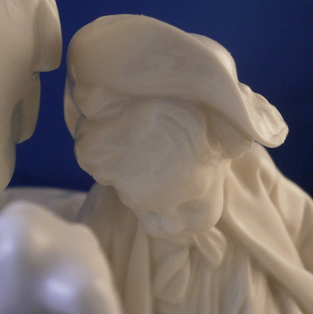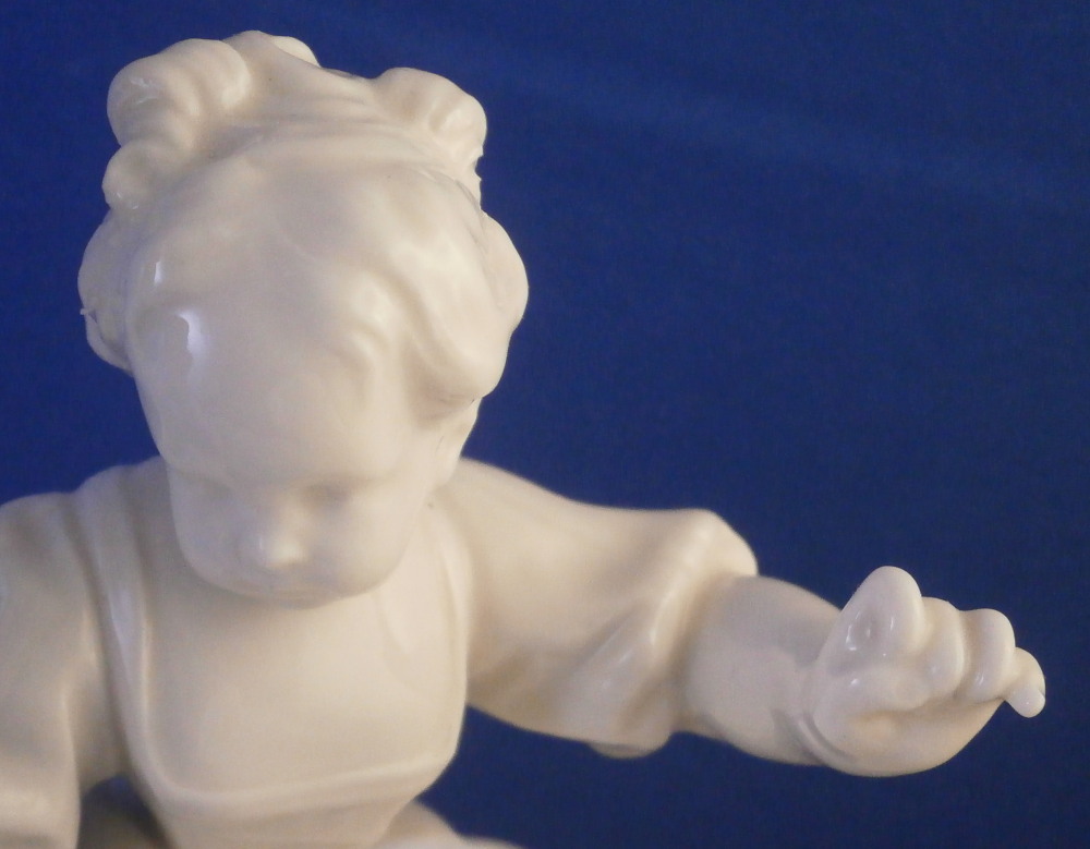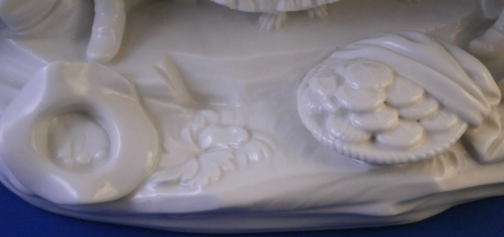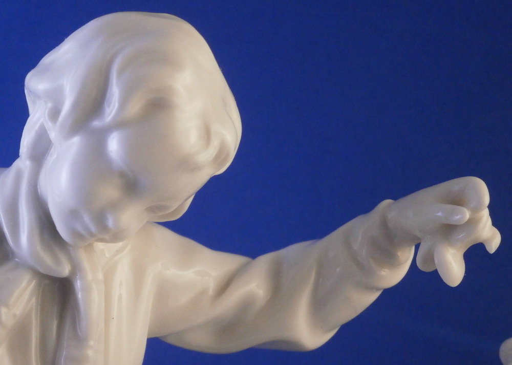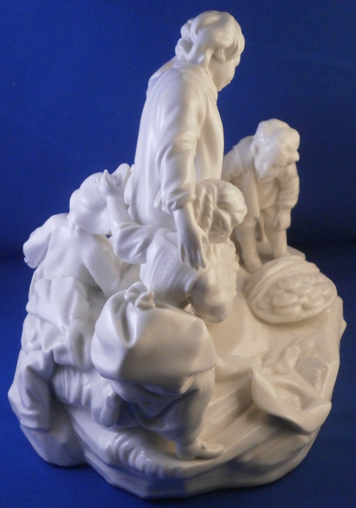 This is a really nice figure of a couple of kids playing with their dog made by Nymphenburg in the late 19th century or early 20th century. I cannot find this model made by them but I suspect it was originally a Frankenthal model by the way it looks though I cannot find it there either. A superb figure with 5 kids surrounding a dog dressed in doll's clothing in the center. There are two younger girls wearing dresses, two younger boys and an older boy or young gentleman that looks to be holding castanets to make the dog dance maybe. A hat on the front of the base as well as a basket filled with some sort of goodies. The piece is superbly modeled with lots of details and left in the white to show them all off. Definitely a rare peice you won't find anytime again soon. Nice size being 7.25 inches tall, 9.5 inches wide and 6.5 inches deep. Marked with the impressed shield mark underneath as well as the number 99. as shown. The figurine is in perfect condition with just a tiny firing fault in the leg of the dog as shown. Invisible when on display and from when it was made. Please email me for more information or other pictures.
