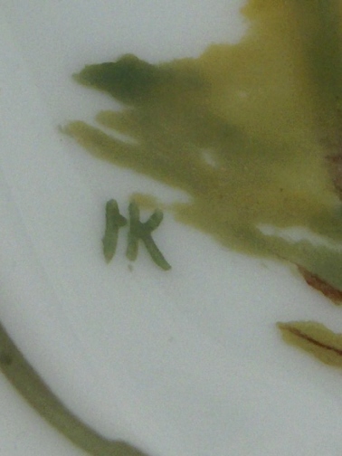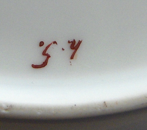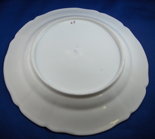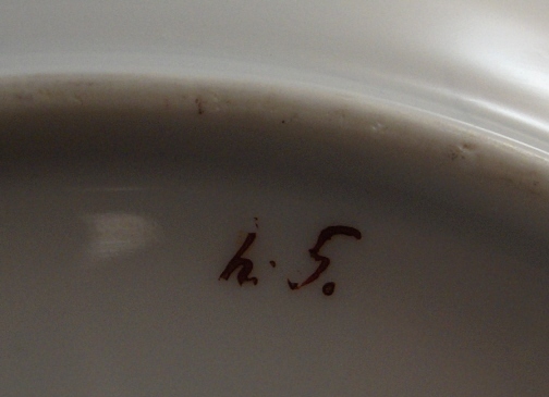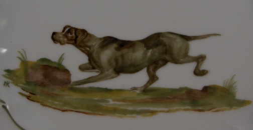 This is a rare plate made by Nymphenburg in the early 20th century. It is the only plate I have ever seen by them that is handpainted with a scene of a dog. It must be special since it is actually signed by the artist initials HR or HK to the left of the scene. A superb plate typical in shape for Nymphenburg with an unusal decoration. The plate is marked with the impressed shield mark as well as the underglaze green shield mark with the word Nymphenburg underneath but since the plate sagged in the center and wouldn't have sat flat the green mark area was ground down but you can still see the remnants of the green mark. Also an impressed letter P and red initials S4. or h S. not sure which one it is. The piece is in perfect condition. It is 1.25 inches tall and 9.75 inches in diameter. Please email me for more information or other pictures.