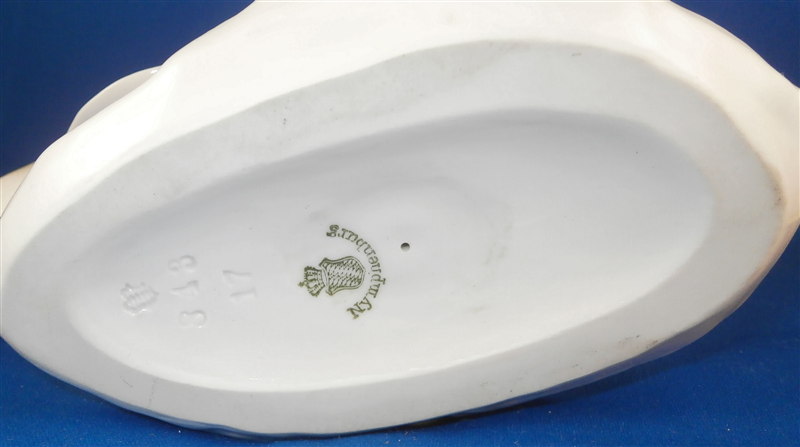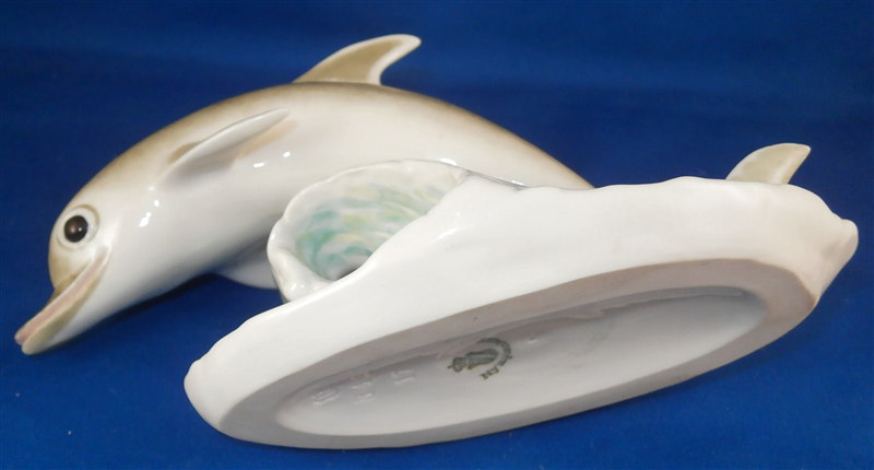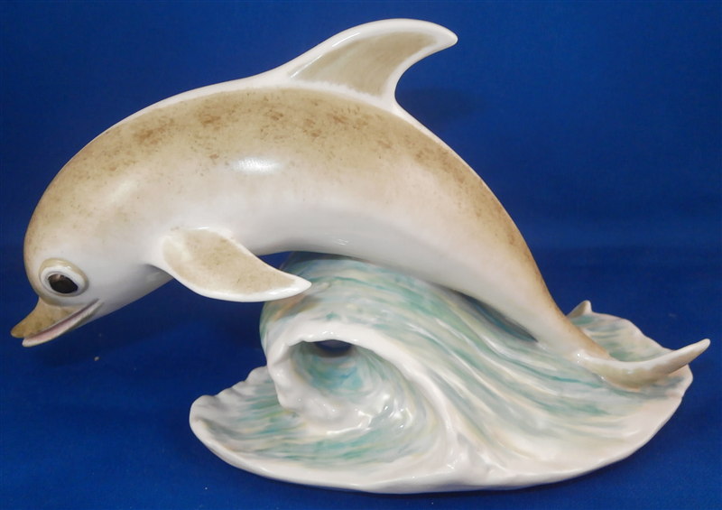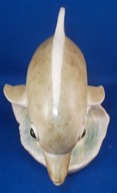 This is a figurine of a dolphin made by Nymphenburg during the mid 20th century. An unusual piece one does not see often at all! Designed by the famous Terletzki-Scherf so you know it is a superb piece! It is modeled perfectly and handpainted nicely as well. The figurine is 4 inches tall, 3.125 inches wide and 6.75 inches long so a nice size. It is marked with the impressed shield mark underneath with the number 843 over 17 underneath it. Also marked with the green shield mark with the word Nymphenburg. The piece is in perfect condition. Please email me for more information or other pictures.
