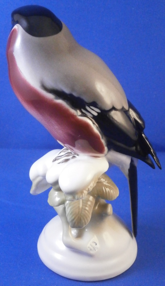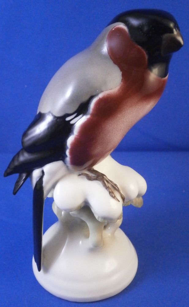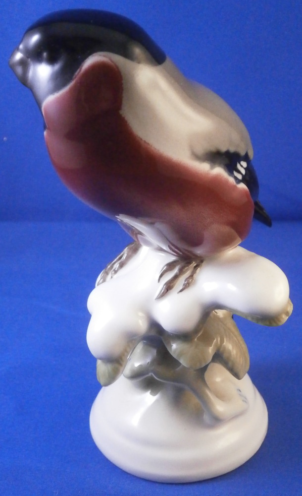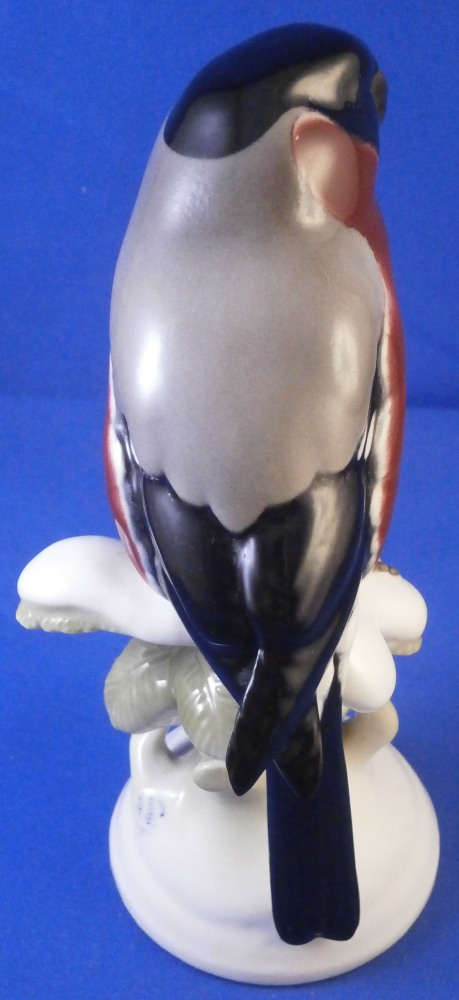 This is a nice bird figurine made by Nymphenburg in the 20th century. The bird is a bullfinch and it is sitting on a snow covered tree or bush. The figure is nicely modeled and hand painted to look almost real. It's a really nice looking piece! The figure is 5.75 inches tall, 3 inches wide and 3 inches deep. The figurine is marked with the impressed shield mark colored in blue to the bottom end of one of the branches in the back as well as another impressed shield mark underneath with the model number 445 and the number 8 impressed. Also the green shield mark under a crown with the name Nymphenburg under it as shown. The figure is in perfect condition. Please email me for more information or other pictures.