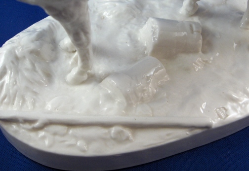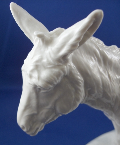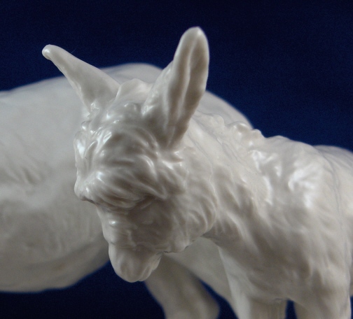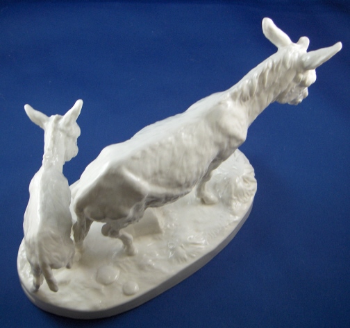 This is a figure of donkey and its young on a nice base made by Nymphenburg around 1900. It is really well modeled which is why Nymphenburg often leaves their figures white to show them off better. Also in perfect condition which is somewhat amazing! Properly marked with the impressed shield mark to the top of the base and underneath as well as impressed numbers 518 and 11. The figure is 5.75 inches tall, 5 inches wide and 8.5 inches long. Please email me for more information or other pictures.