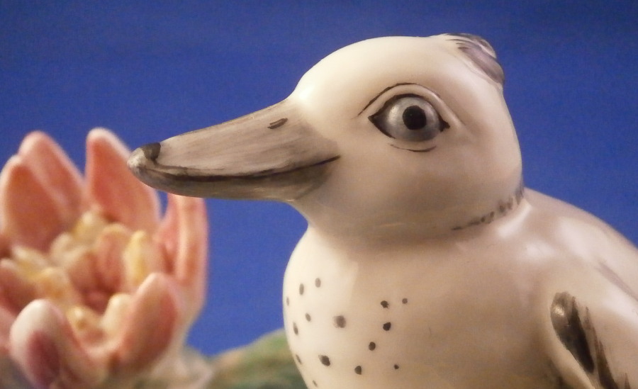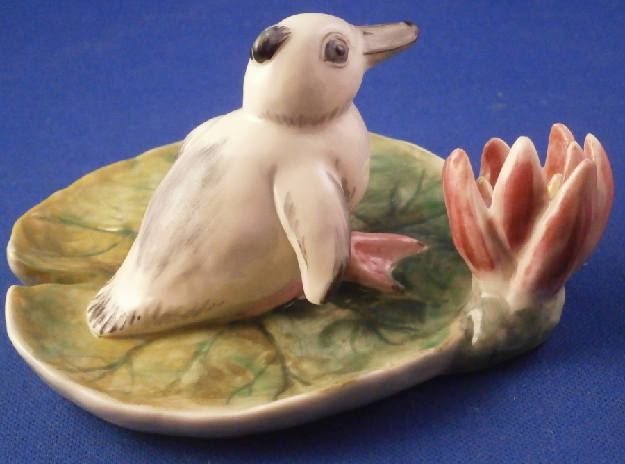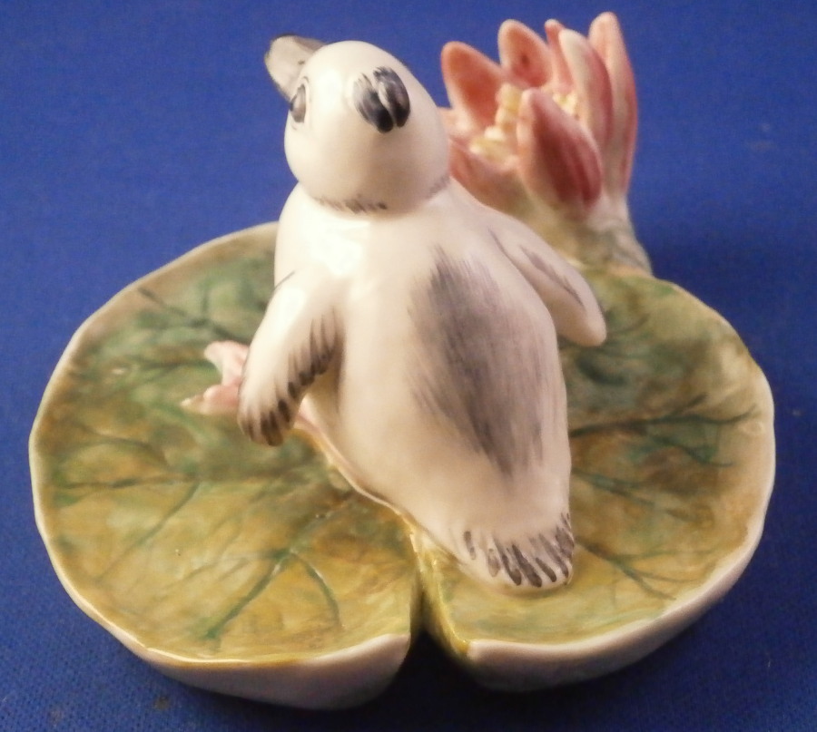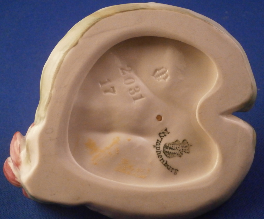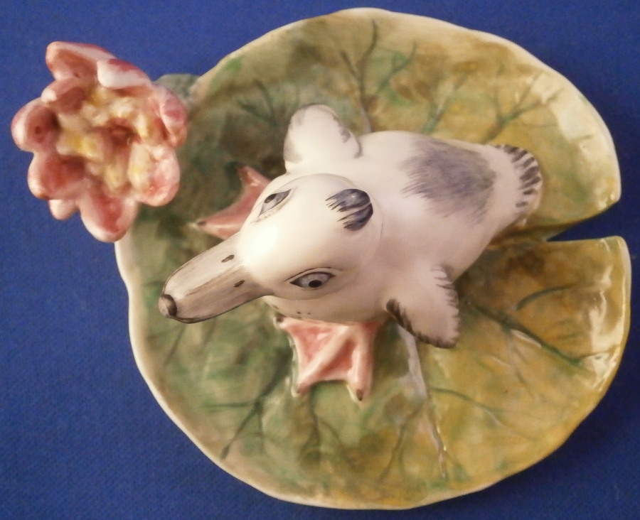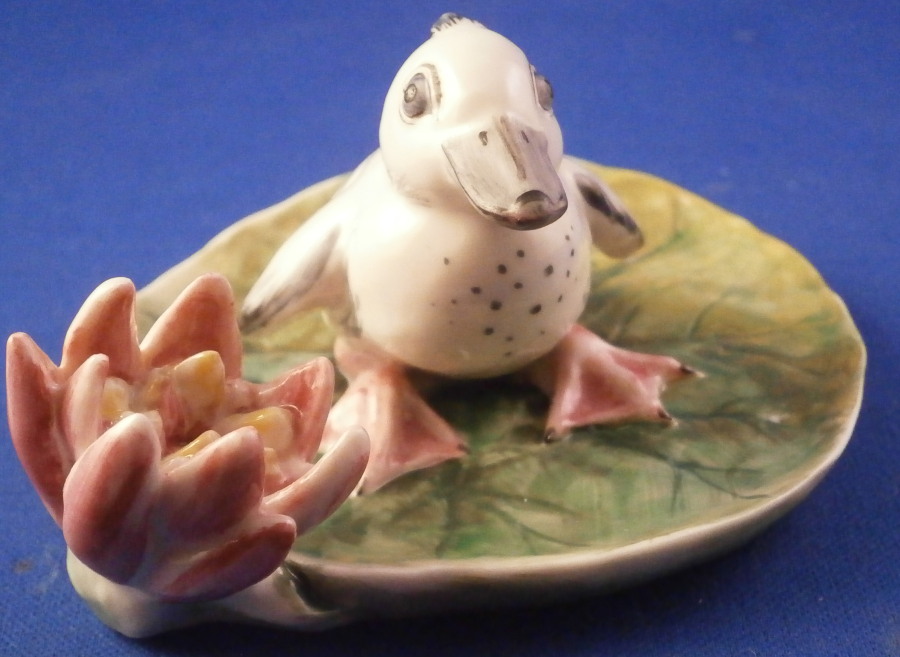 This is a figure of a really cute baby duck sitting on a lily pad made by Nymphenburg in the 20th century. One of the cuter pieces they made and a personal favorite of mine :) Also one of the harder to find pieces! The figure is 1.75 inches tall, 3.75 inches wide and 3 inches deep. Marked with the impressed shield mark as well as the artist monogram on the side of the lily pad by the tail of the duck, another impressed shield mark underneath with the model number 2031 over 17 as well as the green shield mark under a crown over the word Nymphenburg under that. The figure is in perfect condition. Please email me for more information or other pictures.