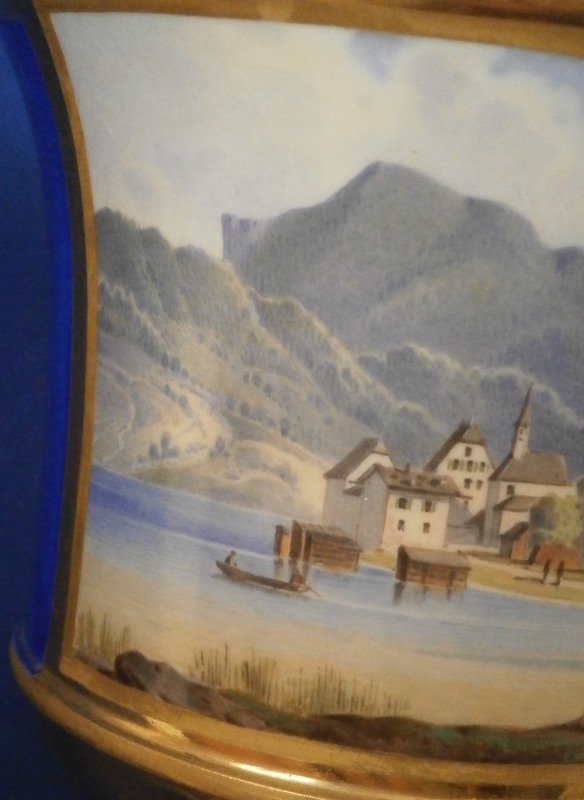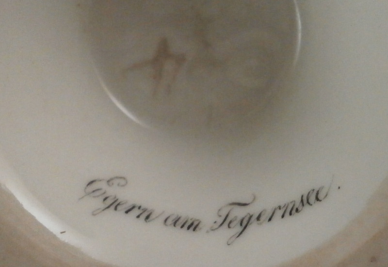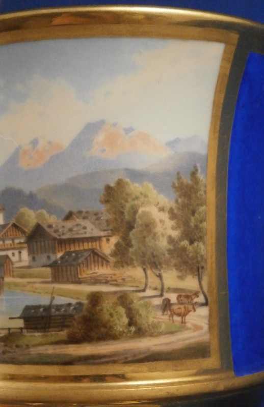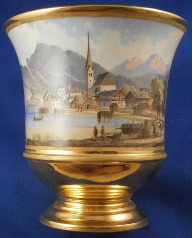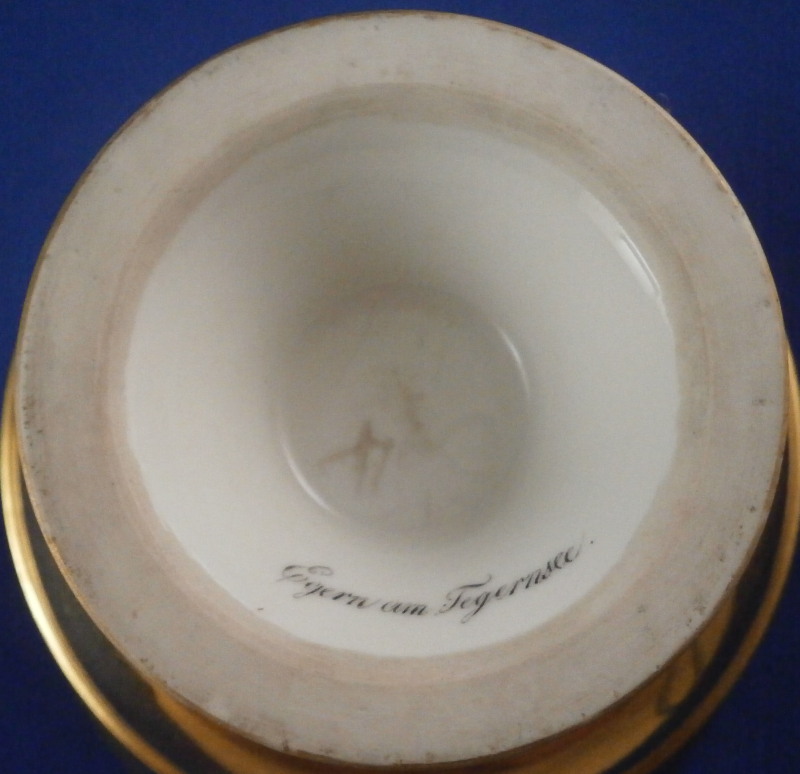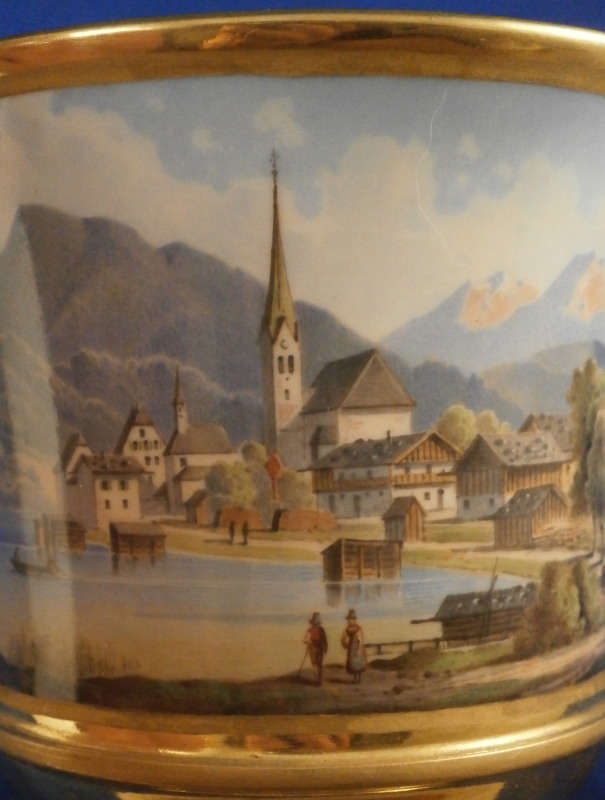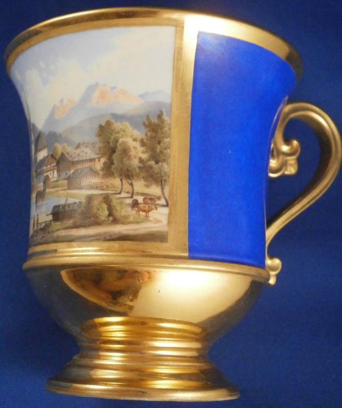 This is a superb scenic cup and saucer made by Nymphenburg in about 1830. The cup has a hand painted scene in the front of Egern am Tegernsee which is a small town just south of Munich. The church in the center still stands nowadays but the surrounding buildings have been modernized :) The quality of the scene is top notch - just superb and of a good size. It is surrounded by a gold frame with the rest of the main body having this really nice blue color - I think it is called King's blue. The foot is completely gilded as is the nicely shaped handle and the inside except for the very bottom. The saucer has the same blue with a simple gold ring around the edge. The scene is labelled underneath in black script Egern am Tegernsee as shown. The cup is 3.875 inches tall so of a rather nice size and 3.625 inches in diameter. The saucer is 1.25 inches tall and has a diameter of 6.25 inches. Both are marked underneath with the impressed shield mark as well as some other imressed/incised marks as shown. The most interesting mark looks to be the name Lucius or soemthing along those lines. Can't recall having ever seen anything like it before. The set is in superb condition with some very minor wear. There is a missed glaze line under the saucer rim where the glaze didn't take and another spot under the center of the saucer where the glaze also missed. Some scratches to the saucer's blue area as shown but all in all as nice as one could ever hope for! Please email me for more information or other pictures.