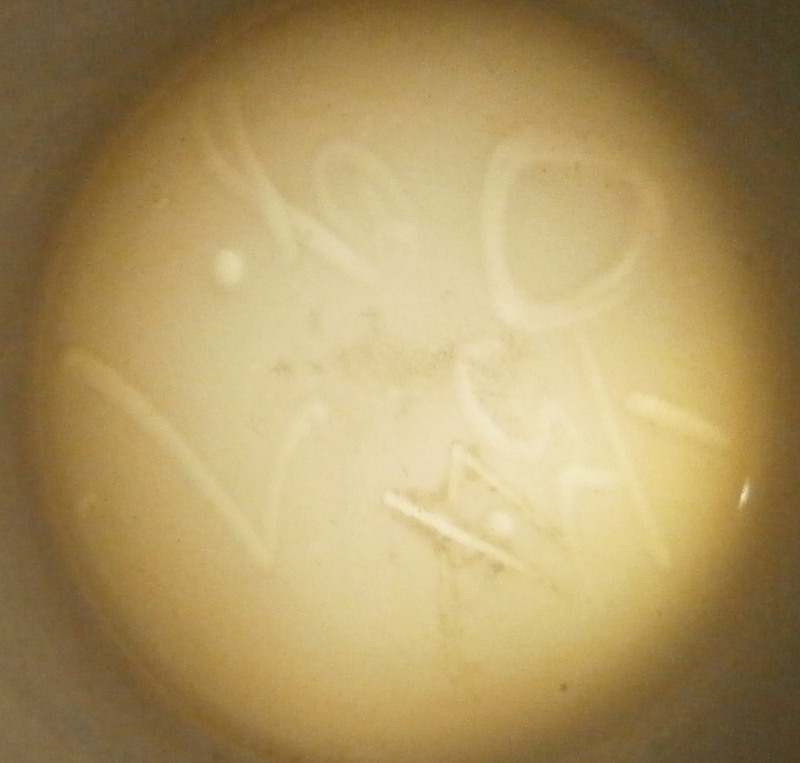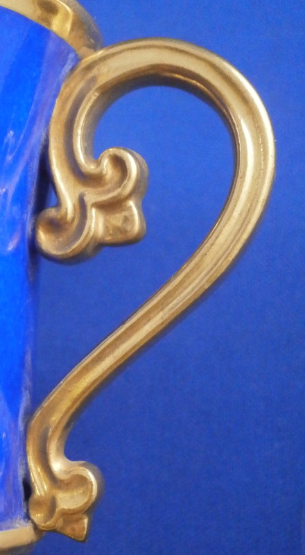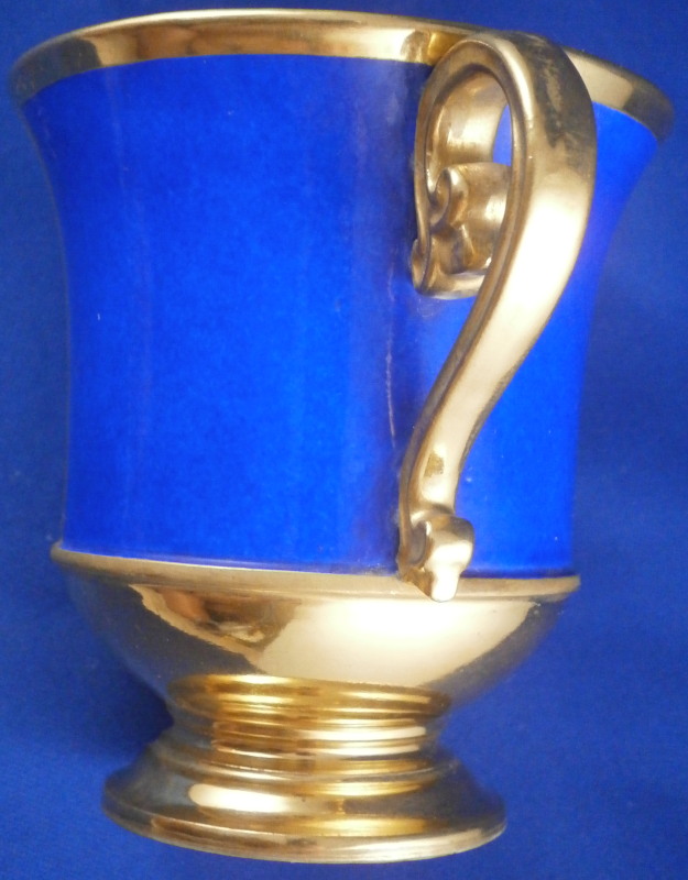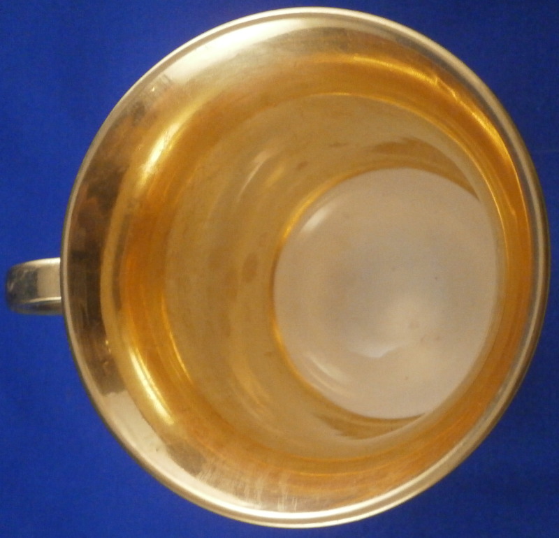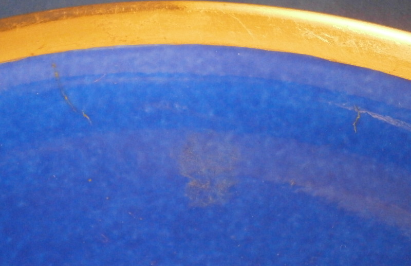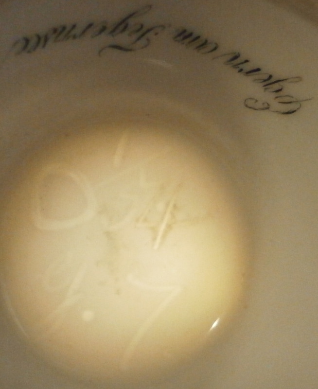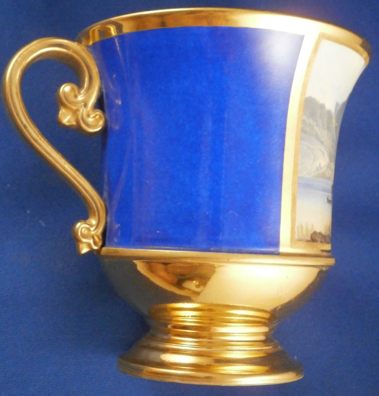 This is a superb scenic cup and saucer made by Nymphenburg in about 1830. The cup has a hand painted scene in the front of Egern am Tegernsee which is a small town just south of Munich. The church in the center still stands nowadays but the surrounding buildings have been modernized :) The quality of the scene is top notch - just superb and of a good size. It is surrounded by a gold frame with the rest of the main body having this really nice blue color - I think it is called King's blue. The foot is completely gilded as is the nicely shaped handle and the inside except for the very bottom. The saucer has the same blue with a simple gold ring around the edge. The scene is labelled underneath in black script Egern am Tegernsee as shown. The cup is 3.875 inches tall so of a rather nice size and 3.625 inches in diameter. The saucer is 1.25 inches tall and has a diameter of 6.25 inches. Both are marked underneath with the impressed shield mark as well as some other imressed/incised marks as shown. The most interesting mark looks to be the name Lucius or soemthing along those lines. Can't recall having ever seen anything like it before. The set is in superb condition with some very minor wear. There is a missed glaze line under the saucer rim where the glaze didn't take and another spot under the center of the saucer where the glaze also missed. Some scratches to the saucer's blue area as shown but all in all as nice as one could ever hope for! Please email me for more information or other pictures.