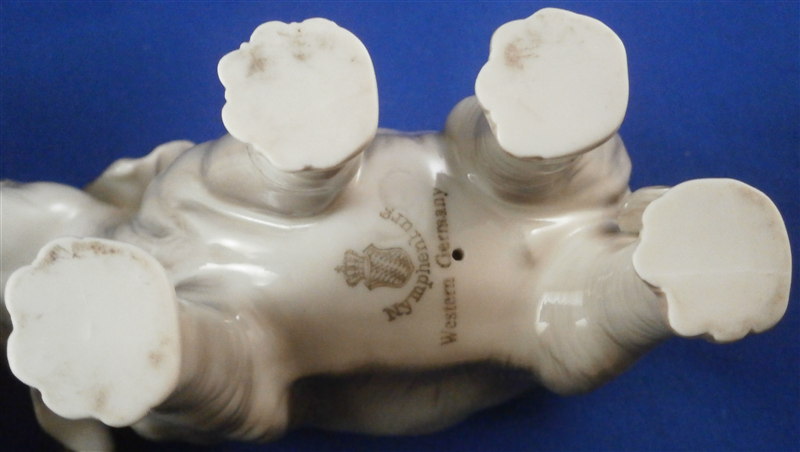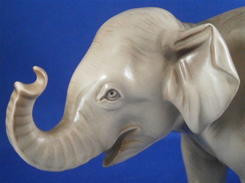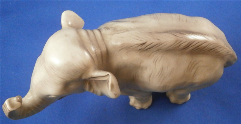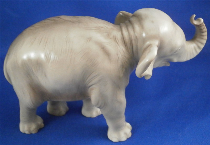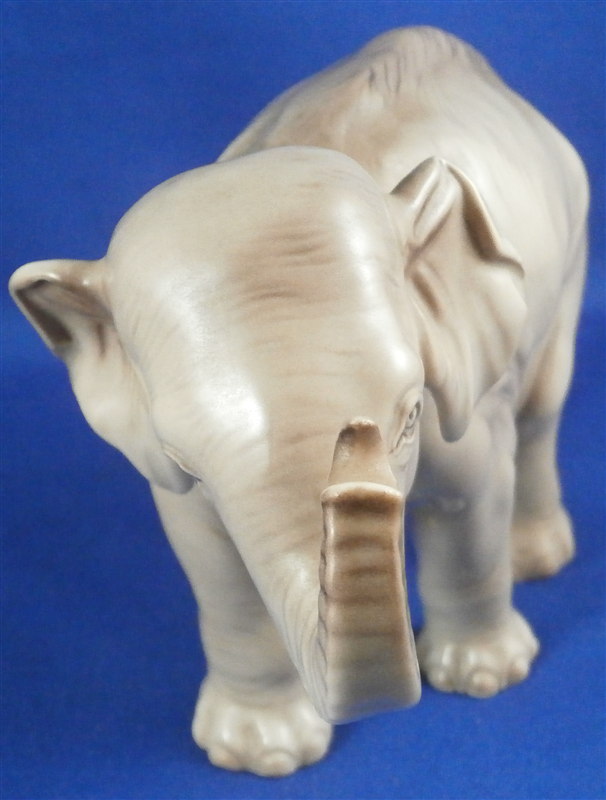 This is a figurine of an elephant made by Nymphenburg in the mid 20th century. Not one you find often especially the painted version. He is nicely modeled and handpainted and I suppose he is meant to be a youngster with no tusks yet but could be a female or a male that has no tusks which I know exists as well. The figure is 3.625 inches tall, 2.25 inches wide and 5.75 inches long. It is marked with the green shield mark underneath with the name Nymphenburg under that as well as Western Germany so he was made right after WWII. There is also an impressed mark of sorts but I cannot make it out - could be a number or artist initials. The figure is in perfect condition. Please email me for more information or other pictures.