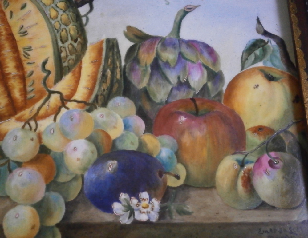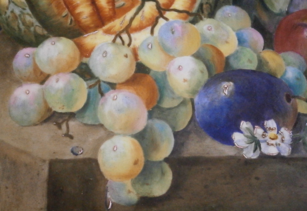 This is a plaque made by Nymphenburg around 1900. These plaques are very rare and this one is signed by the painter - Emeran Lidl who painted some pieces for Nymphenburg and some from his decorating studio in Munich. And it is even dated 1901 which is always nice. One rarely knows the exact year a piece was painted or made in the world of porcelain. The plaque here is super nice. A still life of different fruit on a table with the blue sky behind it. It even has a single cloud in the sky! The fruit include a melon, grapes, apples, a plum, then there is a lonely raspberry as well as an artichoke. Very well painted and a super rare subject matter for a Nymphenburg piece. Signed in the bottom right hand corner as shown. The plque comes in a nice wood frame which looks to be original to it. The visible part of the plaque is 7.5 inches wide and 6.125 inches tall. The frame is 10.75 inches wide, 9.25 inches tall and 0.875 inches thick. The frame is not perfect by any means anymore but does the trick. I think the slight damage only adds to the charm of the piece. The plaque's visible field is perfect but the bottom edge has a large chip to it. The same band width along the bottom is not painted so it might have been originally damaged already. The frame obviously hides that part. A truly superb piece! The plaque is makred with their impressed shield mark with a star above it from the late 19th century. There are also some impressed other marks and some sort of signature though I cannot make that out. Please e-mail me for more information or photos.
