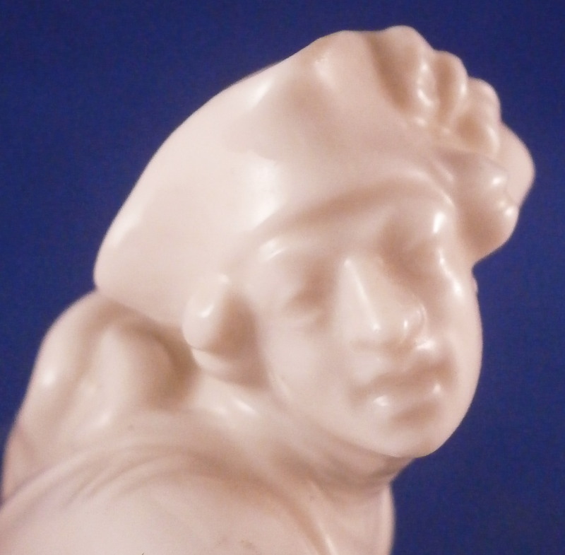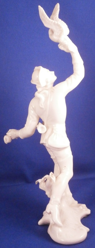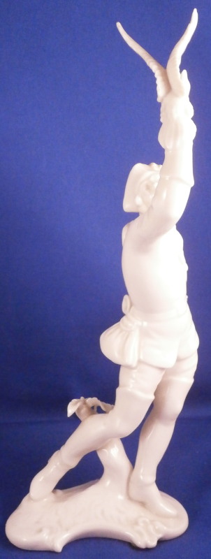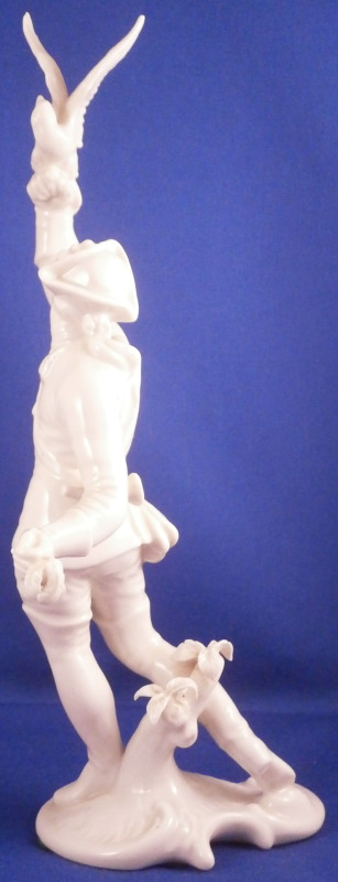 This is a figure of a falconer made by Nymphenburg in the early to mid 20th century. It is of a hunter holding his falcon in one hand and the little feather on a string piece in the other he uses to bring the bird back to him when it is flying around. The figurine is superbly modelled with lots of detail including a fancy jacket, a hunting horn and a bag while standing on a nice base with a small tree stump on it. Left in the white to show off all that detail! The figurine is 8.875 inches tall, 4.25 inches wide and 3.5 inches deep. The piece is marked with the impressed shield mark underneath the base, an impressed number 536 over 7 as well as the green shield mark with the name Nymphenburg under it as shown. The figurine is in great condition with the loop of the string in his left hand missing the center section as well as a few small manufacturing imperfections such as tiny black firing spots and a tiny extra blob or porcelain. It displays very well and the little bit of string missing does not distract from this very nice figure. Please email me for more information or other pictures.