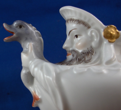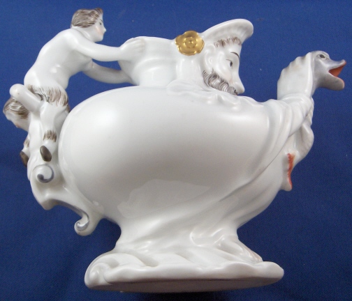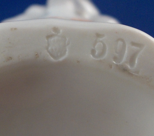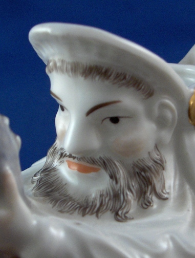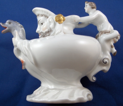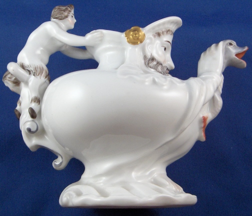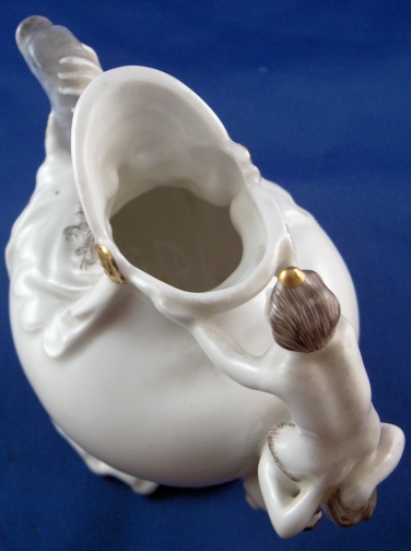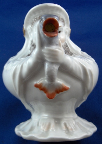 This is a superb fancy figural creamer made by Nymphenburg in the late 19th century. I have never seen anything like it by them nor can I find any reference to it in all my books! I am fairly sure it would have to be an 18th century original model but I cannot find it anywhere. It is modeled as a head which forms the opening with the handpainted face in the front, the hands are holding up a fish which forms the spout with the mouth being the opening. The handle is made up of a goat legged lady on top with a man bust underneath her. The foot of the creamer looks like a shell with feet sticking out the front. A complete overload of thigns going on in this peice with some nice handpainted details. Amazingly the piece is in perfect condition! The pot is marked underneath on the rim with the impressed shield mark with a star on top as well as the number 597 impressed. Please email me for more information or other pictures.