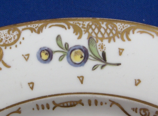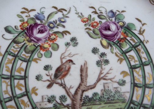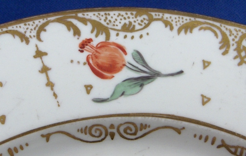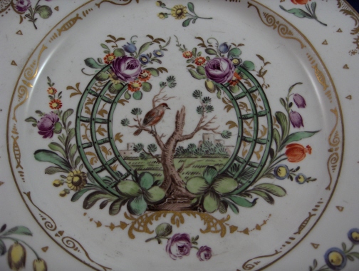 This is a small plate made by Nymphenburg in the late 18th century. It is handpainted with a trellis design with a bird on a tree and a landscape scene in the background. Lots of flowers and a fancy gold trim. The design is actually quite typical for Nymphenburg around this time. The plate is marked with the impressed shield mark but it is very faint and only part of it is visible. A tiny bit of wear but not really worth mentioning. It also has two impressed marks IV or something along those lines. The plate is in super condition with one big firing spot covered by the painting. The plate is 1 inch tall and 8.25 inches in diameter. Please email me for more information or other pictures.