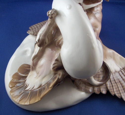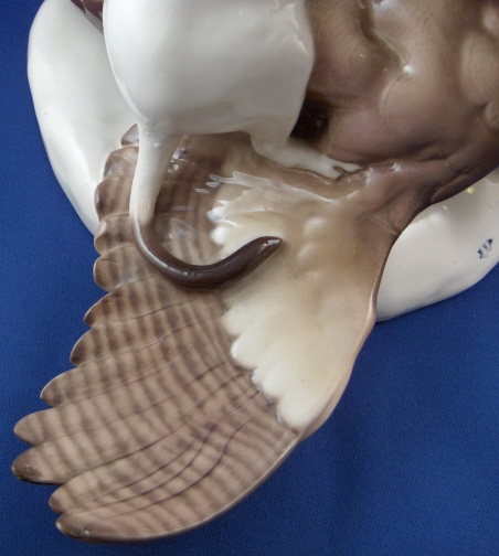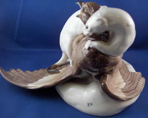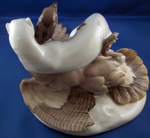 This is an ermine attacking a bird made by Nymphenburg in the Art Nouveau period around 1909. An amazing piece! It is super detailed and painted to seem real. The piece is 6 inches tall, 7.5 inches wide and 9.5 inches deep. This figurine is from the original period when it was first designed which is very rare! It is in great condition with one claw of the bird having the very tip broken off, a glaze flaw on a feathertip of the wing, in the beak and where the wing attaches to the body. This is normal for this period and the size of the piece. A few black firing spots as well but none take away from the piece. It is marked underneath with the impressed shield mark , impressed 10 and incised 176. Also signed with the impressed shield mark highlighted in blue on the front of the base and signed by the artist initials CB under the right wing of the bird on the base. Cb might be for Christian Beck. Please email me for more information or other pictures.