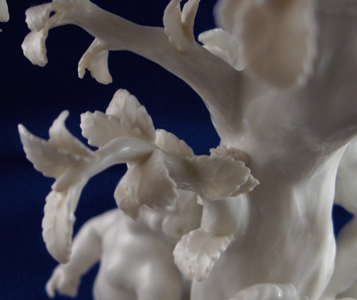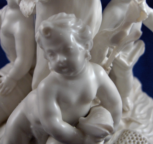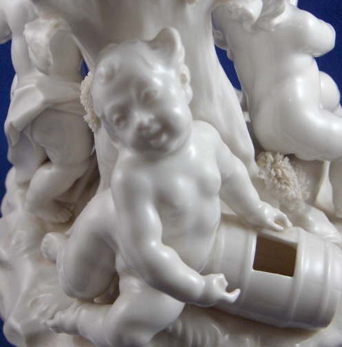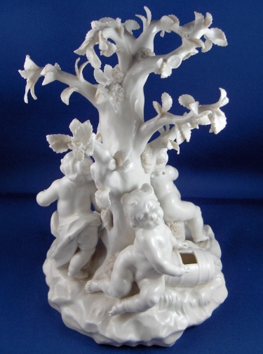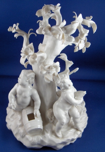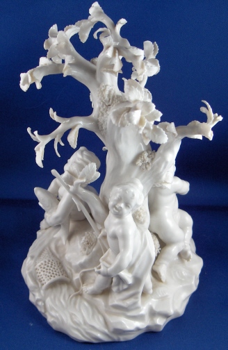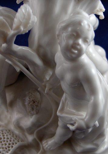 This is a figure of three putti fishing made by Nymphenburg. One has the fishing pole, one is holding a fish and one is by a barrel the fish go into. All around this amazingly detailed tree. It dates to after 1900 to the start of WWII. The figure is 8 inches tall and the base is about 5.75 inches in diameter. The piece is marked underneath with the impressed shield mark, the numbers 726 over 0 as well as the word Germany in green. In great condition with some of the fishing line missing on the fishing pole and six leaves chipped which is not noticable. Please email me for more information or other pictures.