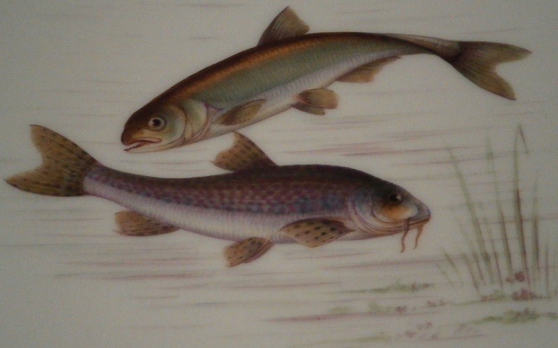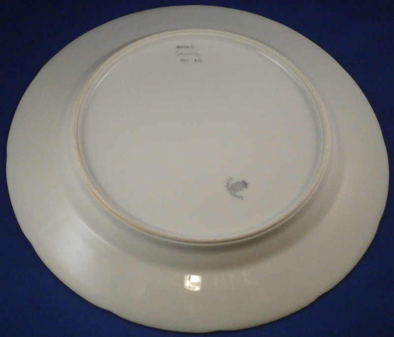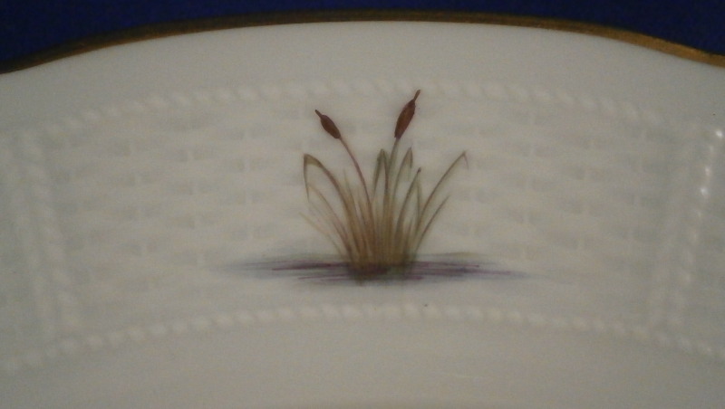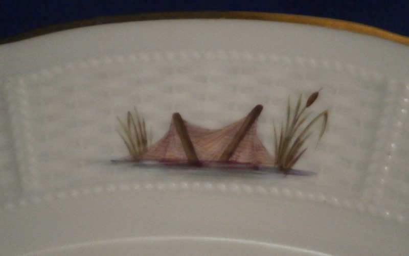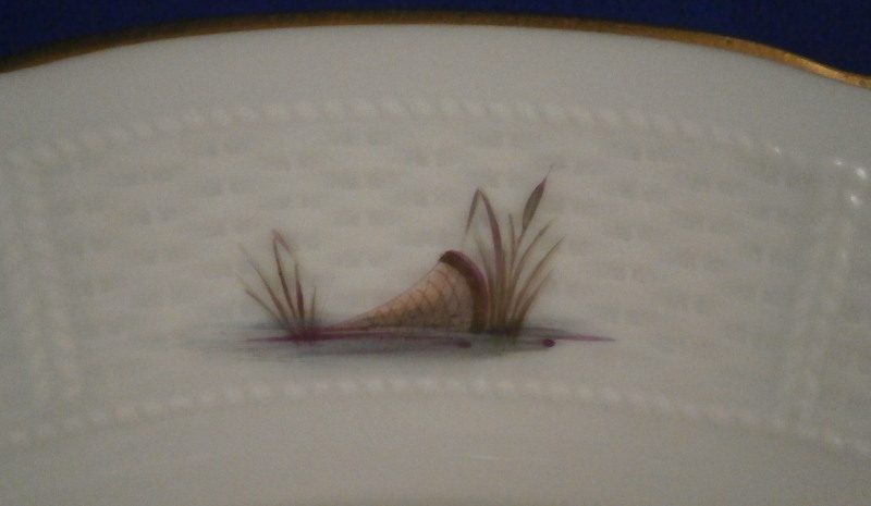 This is a very unusual plate made by Nymphenburg in the 20th century. I have not seen this type of design before and even after searching for quite a while through the books and online only found one other place that sold this design. It seems to have been an entire dinner set that they made with this fish decor since that auction included tureens as well as sauce dishes and the dinner plates. Maybe it was a special commission since it is not in the Nymphenburg books either - not sure. Either way the plate is superbly hand painted with a fish motif in the center including two larger fish as well as a smaller one with a nice surrounding of some greenery and water. The rim is has a really nice basketweave design to it with little greenery scenes as well as different contraptions to catch fish with and an insect. Nice gold trim to the edge. The painting and the plate are of the best quality. A really nice design and definitely rare. The plate is marked with the impressed shield mark as well as the underglaze green shield mark with the word Nymphenburg underneath and a black numbers 1693 and 242 as well as Mairenke ( Danube bleak or Caspian shemaya ) and Gruendling ( Gudgeon ) which are the fish on the front. The piece is in perfect condition. It is 1.125 inches tall and 9.75 inches in diameter. Please email me for more information or other pictures.