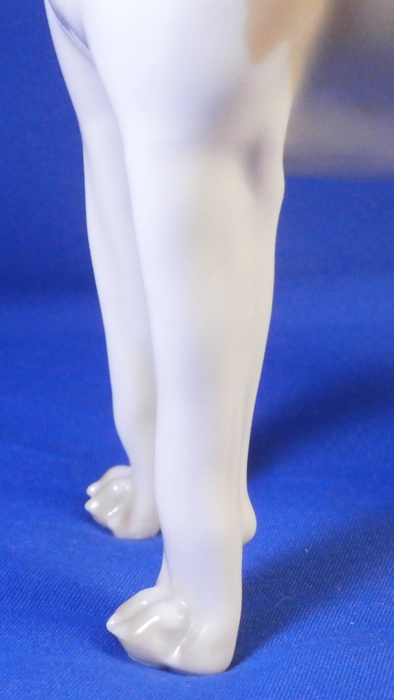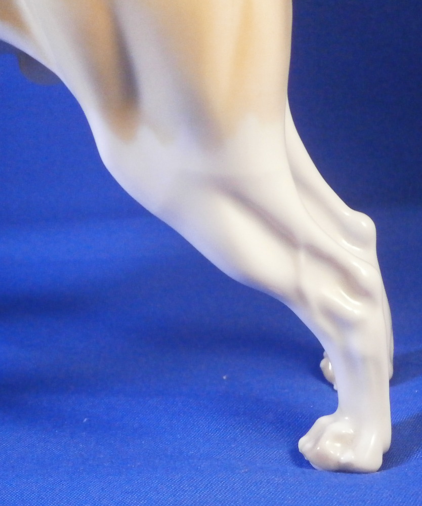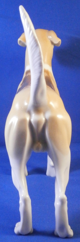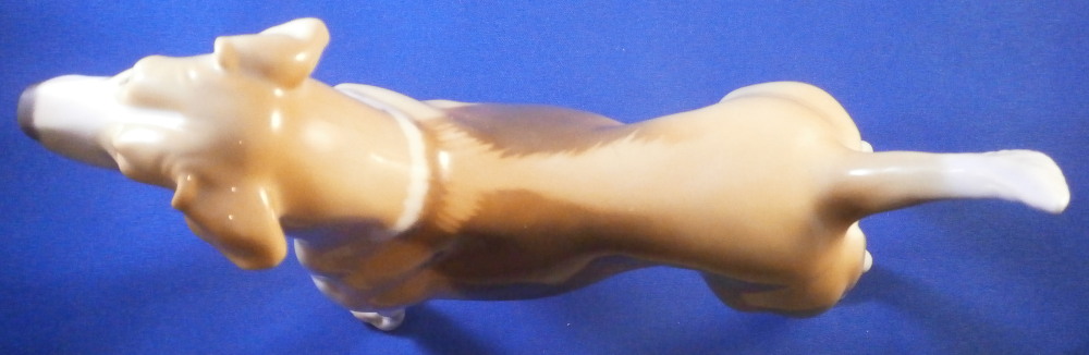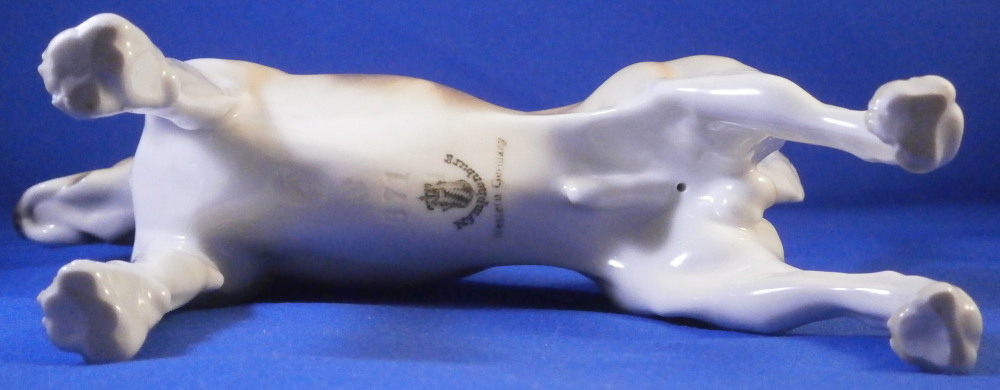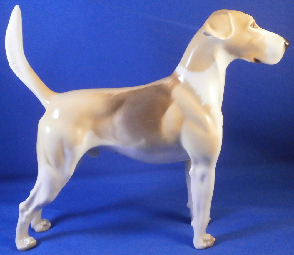 This is a rare figurine of a Foxhound dog made by Nymphenburg in the mid 20th century right after WWII. It was first designed by Konrad Schmid since his initials are underneath but I could not find another example so I am not sure when exactly he first designed this one. Likely in the 1920s when he did a lot of dog models. His models and those of his coworker Kaerner are still the best models of dogs and other animals out there today I believe! The figurine is superbly modeled and hand painted. A very sleek looking dog and the coloration is superb. Lots of detail to it!. He is about 6.5 inches tall at the tail, 2 inches wide and 7.5 inches long. The figure is marked with the impressed number 671 over 11 (I think) as well as their green shield mark with Nymphenburg under it and Western Germany under that. Artist initials that are hard to see impressed into the underside. He is in perfect condition which is somewhat surprising given that the tail sticks straight up. Please email me for more information or other pictures.