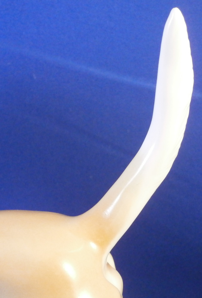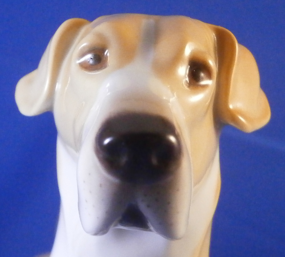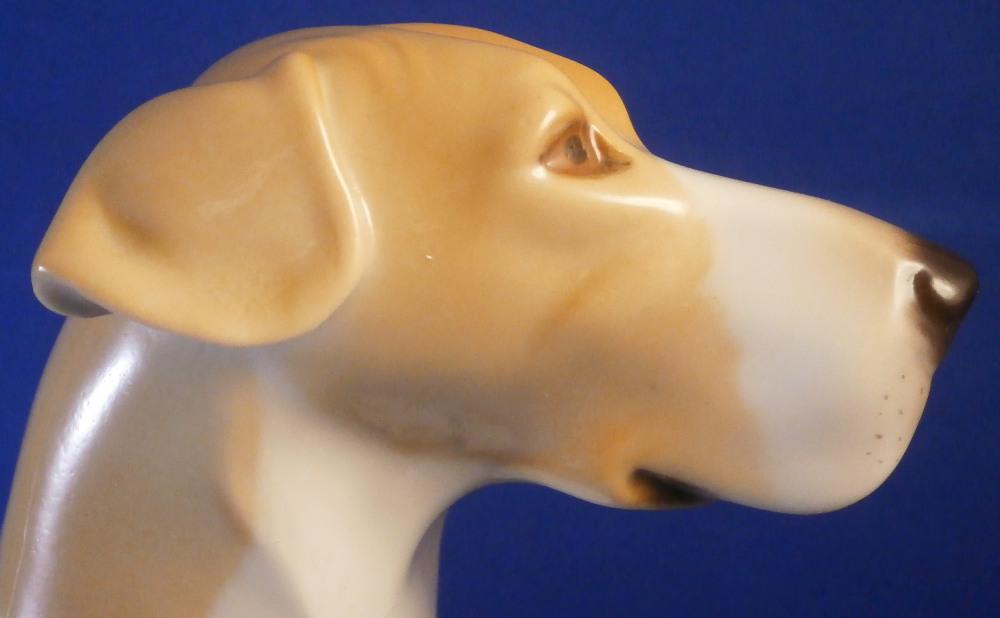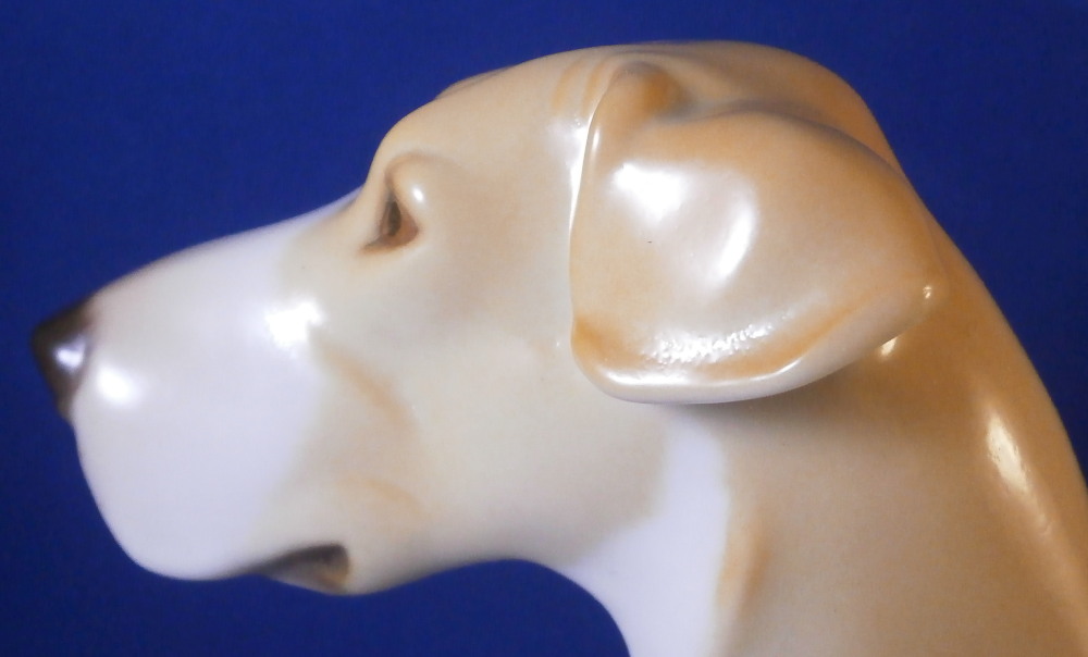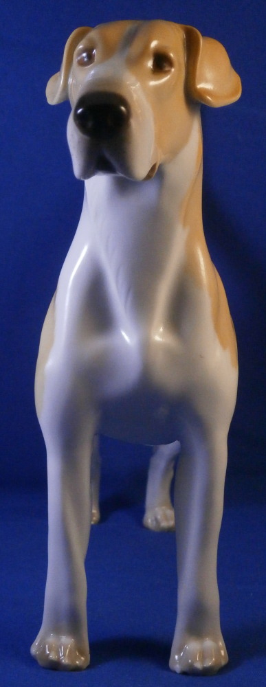This is a rare figurine of a Foxhound dog made by Nymphenburg in the mid 20th century right after WWII. It was first designed by Konrad Schmid since his initials are underneath but I could not find another example so I am not sure when exactly he first designed this one. Likely in the 1920s when he did a lot of dog models. His models and those of his coworker Kaerner are still the best models of dogs and other animals out there today I believe! The figurine is superbly modeled and hand painted. A very sleek looking dog and the coloration is superb. Lots of detail to it!. He is about 6.5 inches tall at the tail, 2 inches wide and 7.5 inches long. The figure is marked with the impressed number 671 over 11 (I think) as well as their green shield mark with Nymphenburg under it and Western Germany under that. Artist initials that are hard to see impressed into the underside. He is in perfect condition which is somewhat surprising given that the tail sticks straight up. Please email me for more information or other pictures.